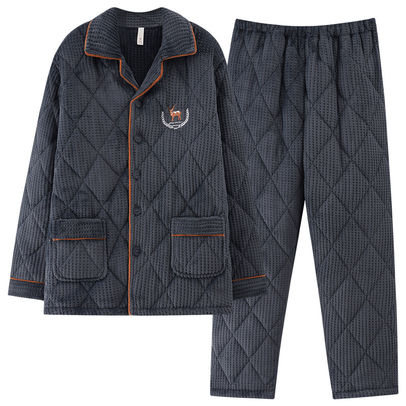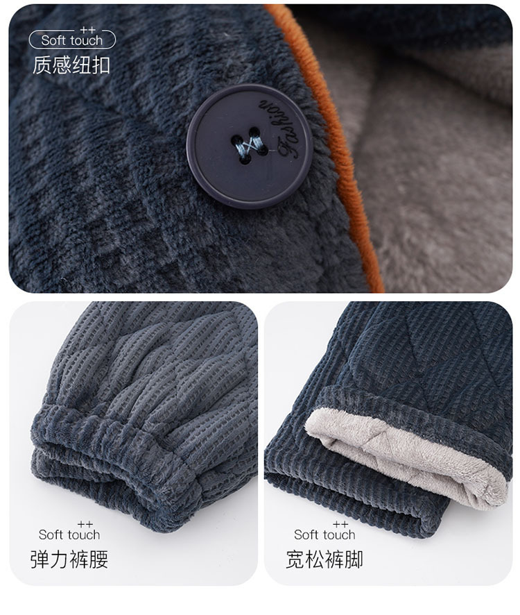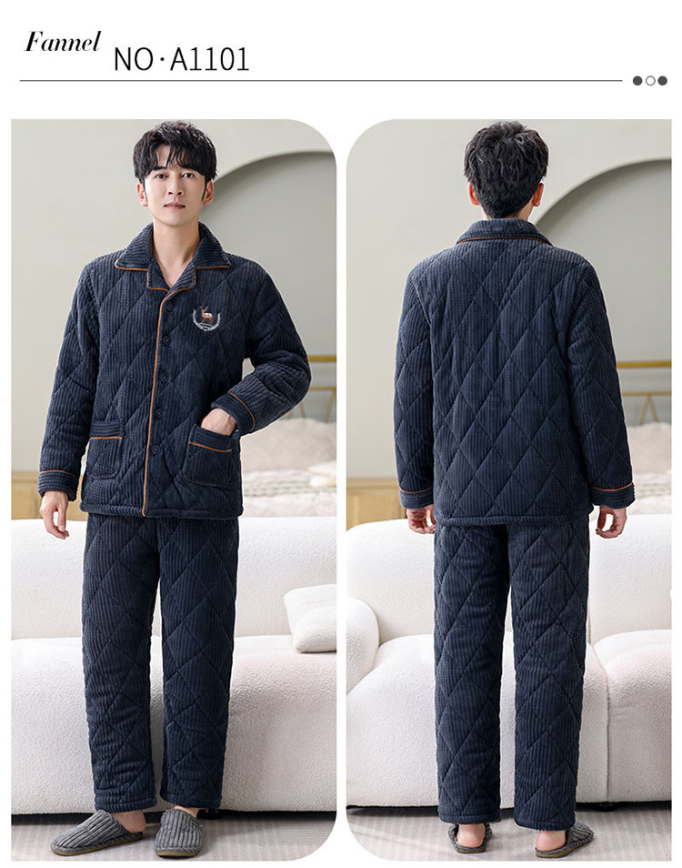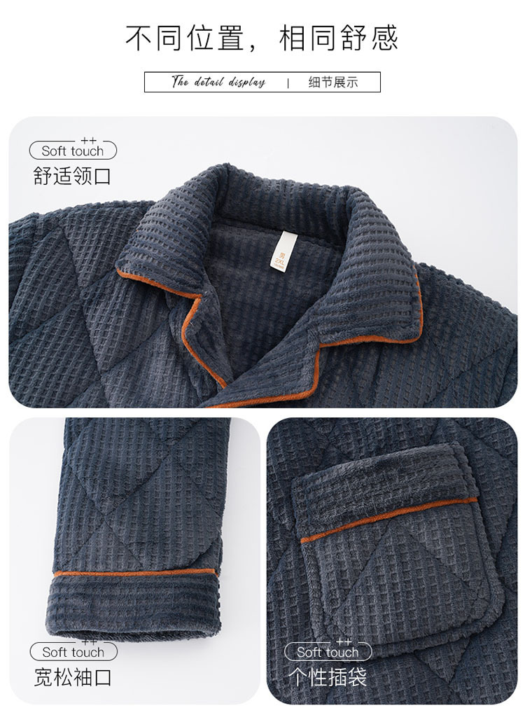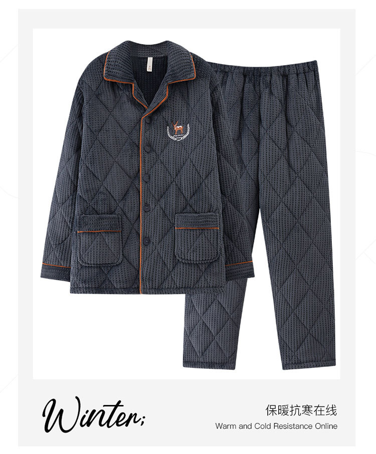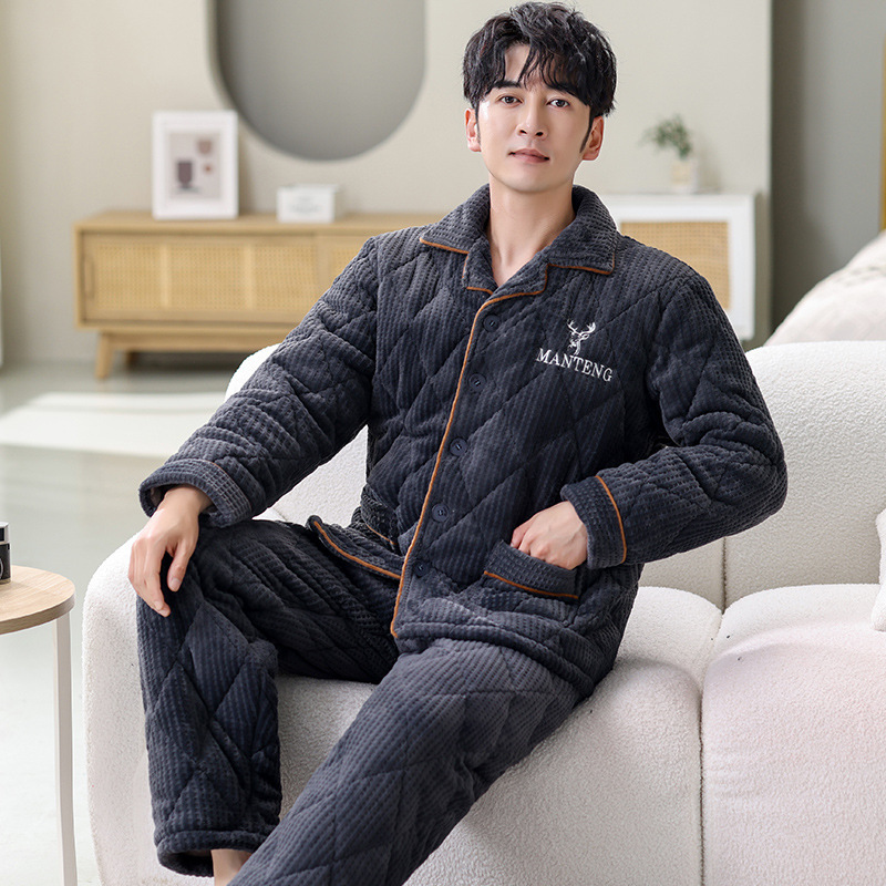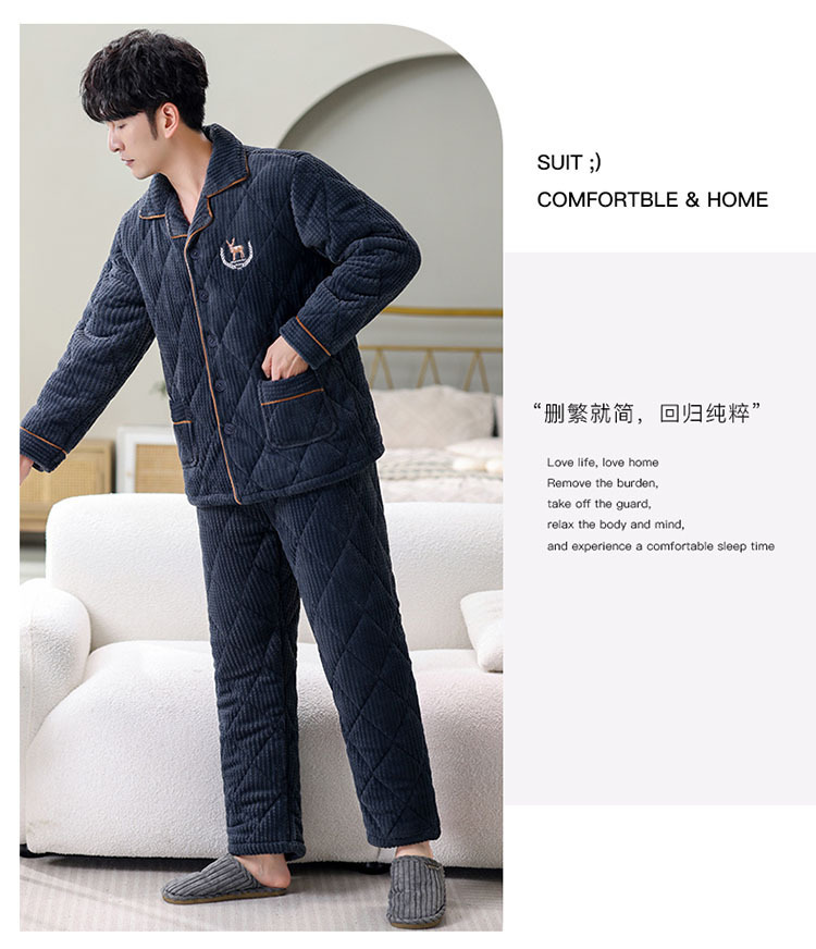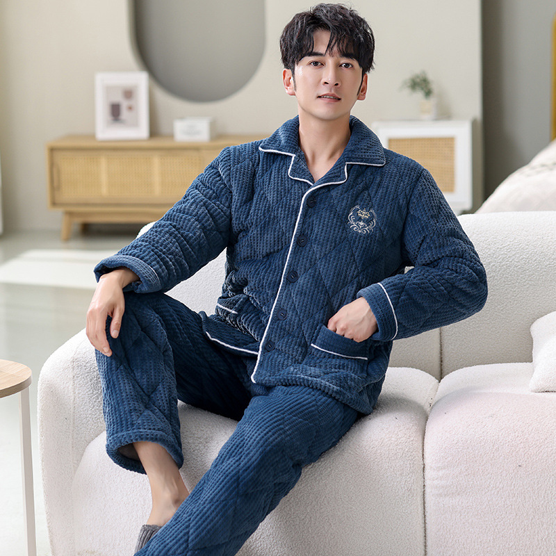 冬季珊瑚绒男士三层夹棉睡衣加厚加绒棉袄保暖牛奶绒男套装家居服