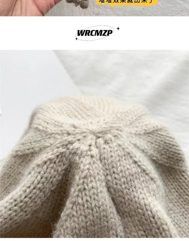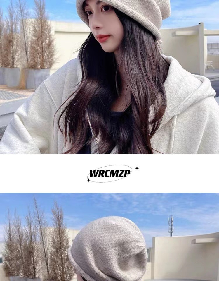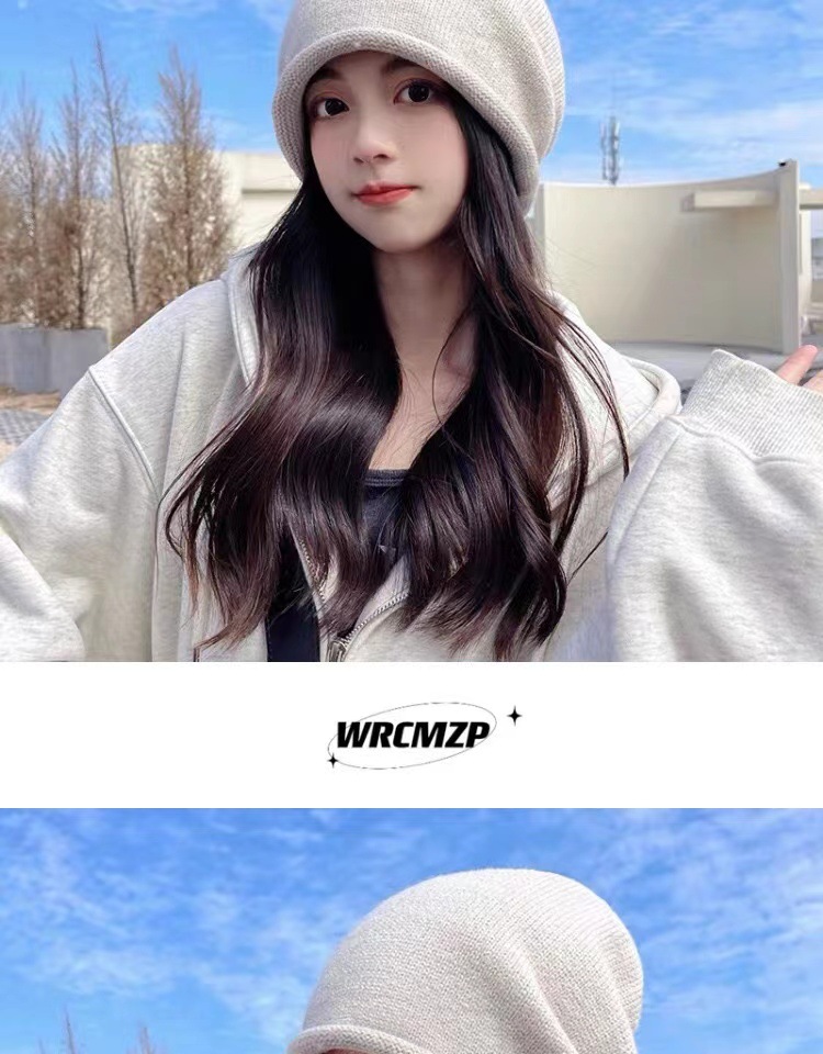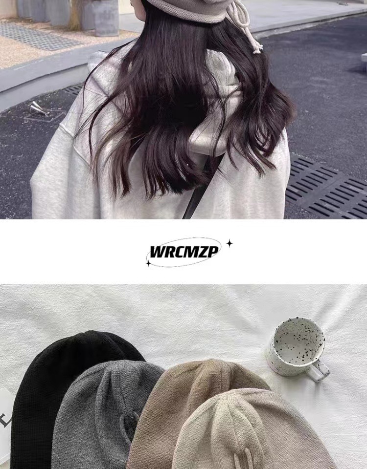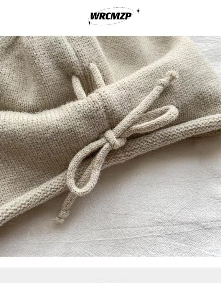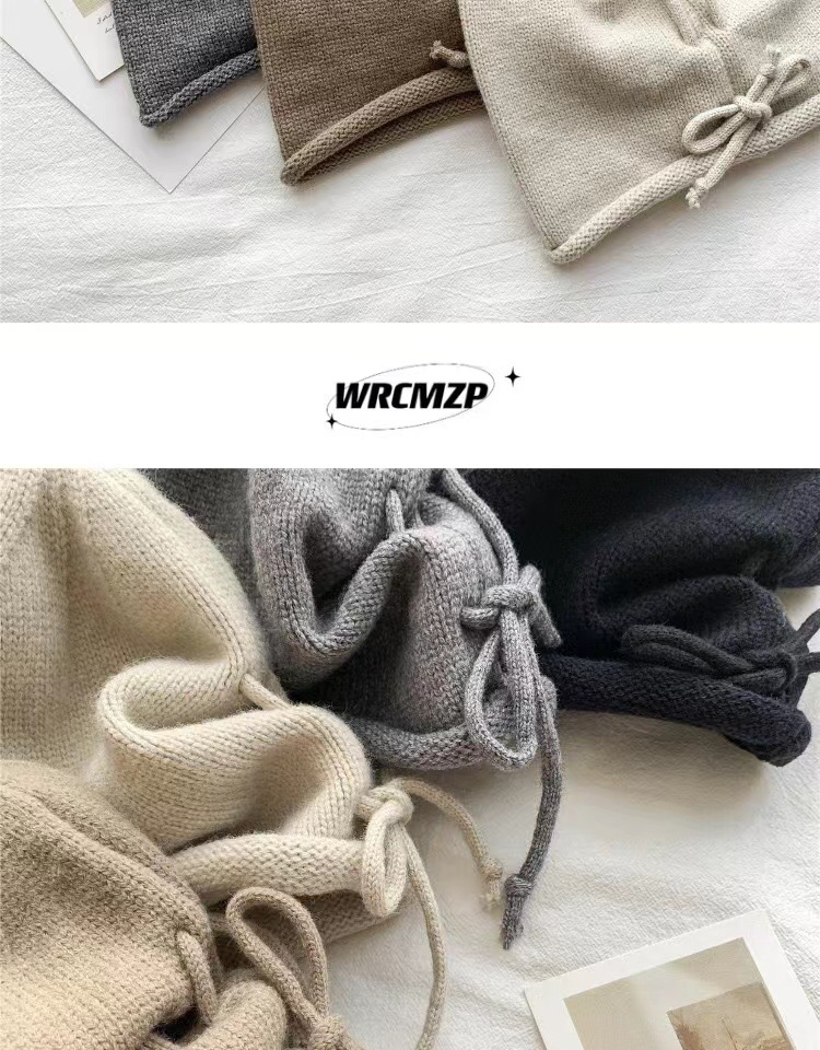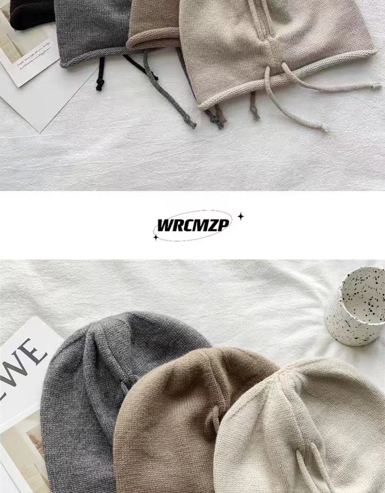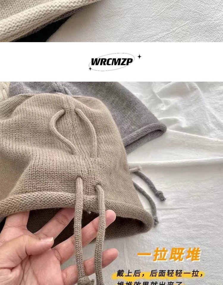 网红堆堆帽女秋冬显脸小包头冷帽大头围护耳抽绳卷边针织毛线帽子