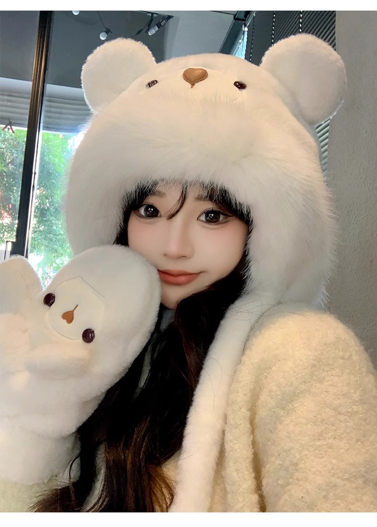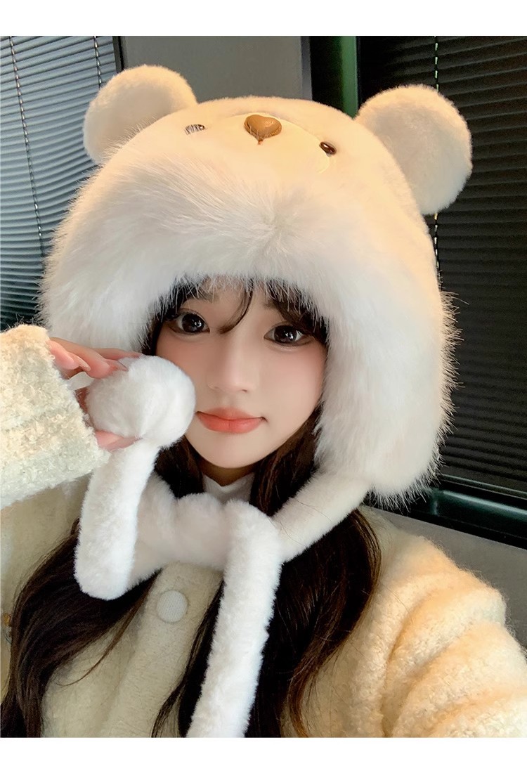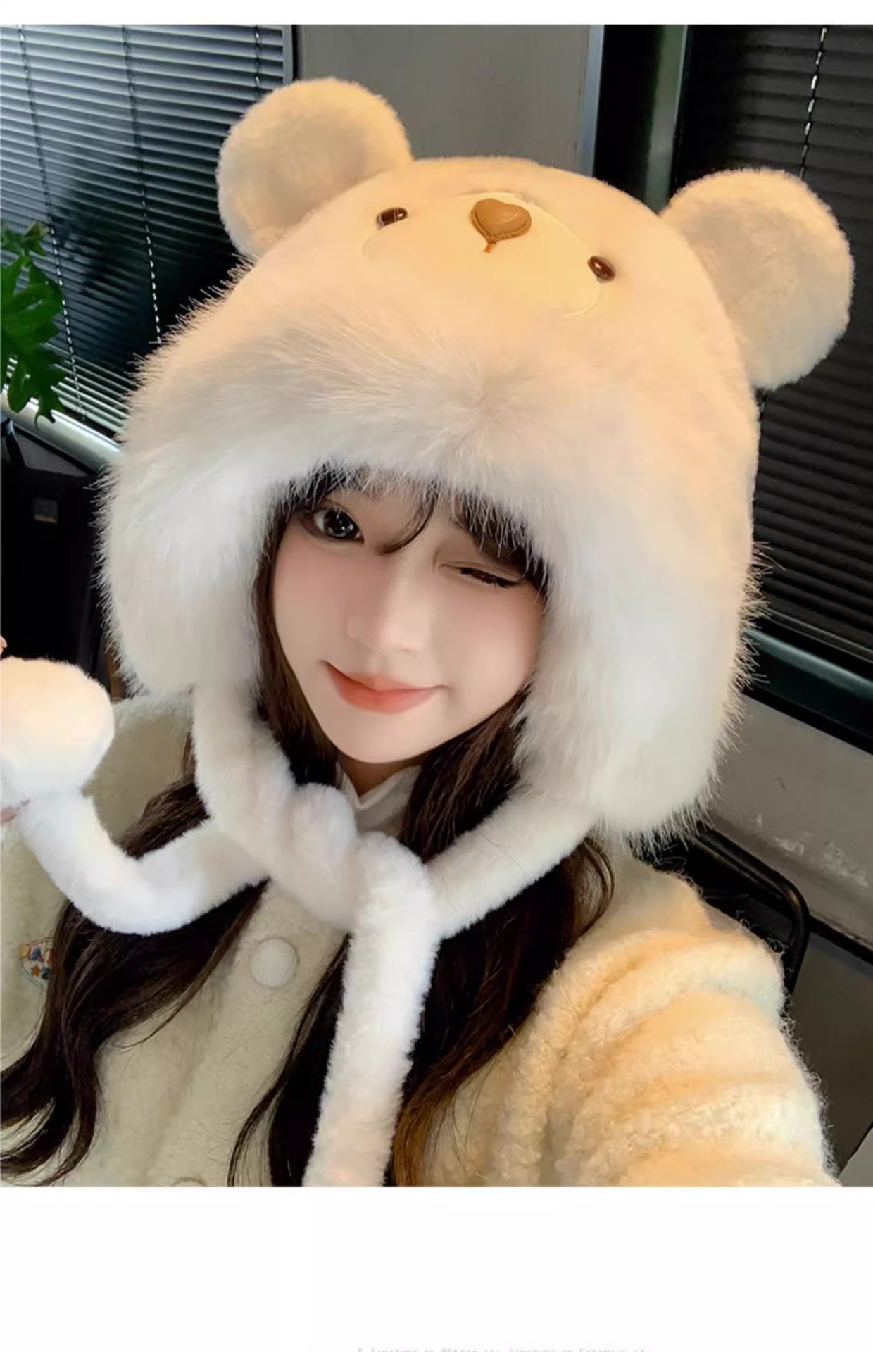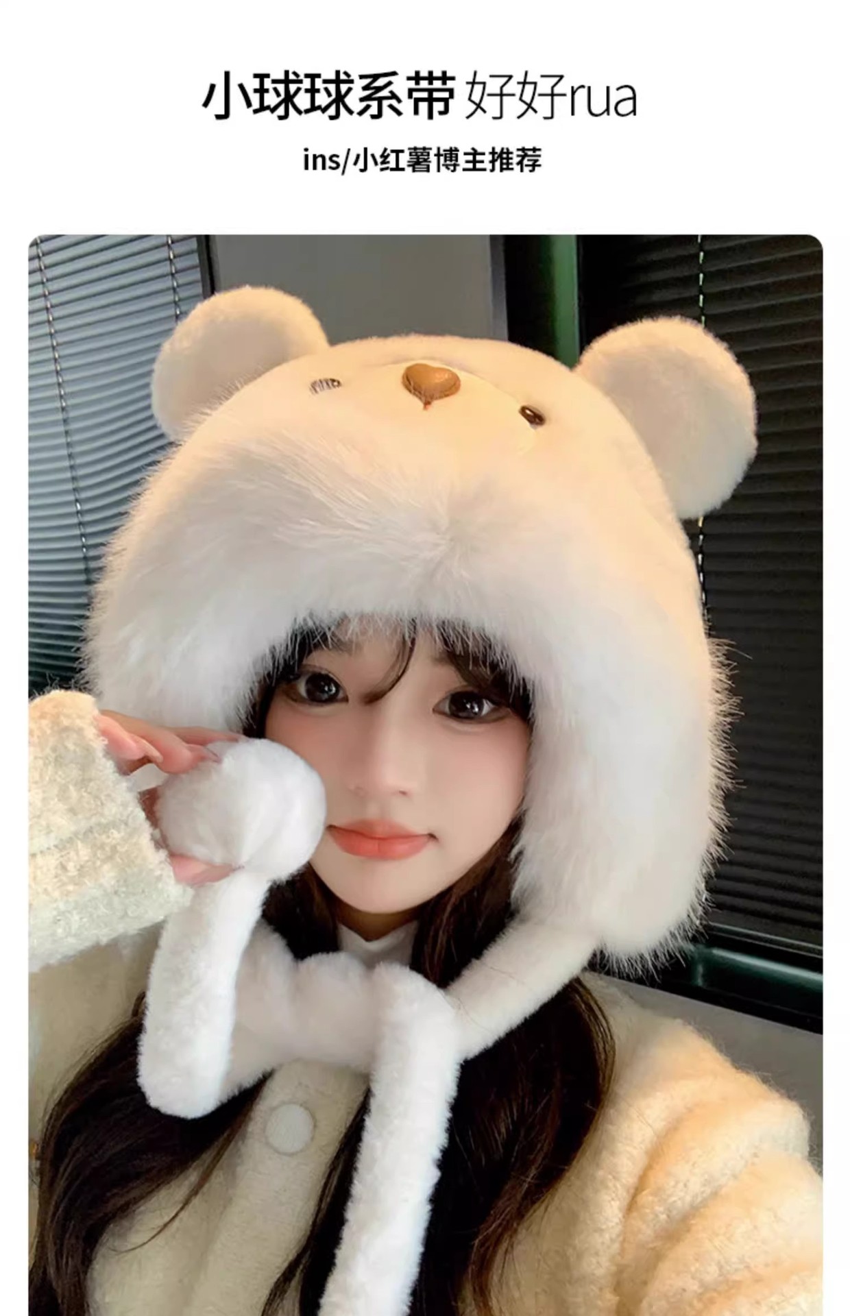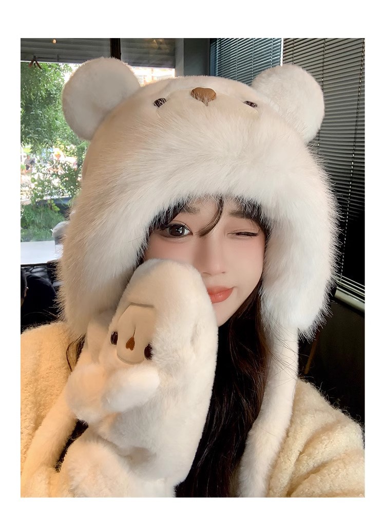 毛绒小熊耳朵帽子女秋冬季加厚保暖护耳套头帽可爱雷锋帽骑车手套