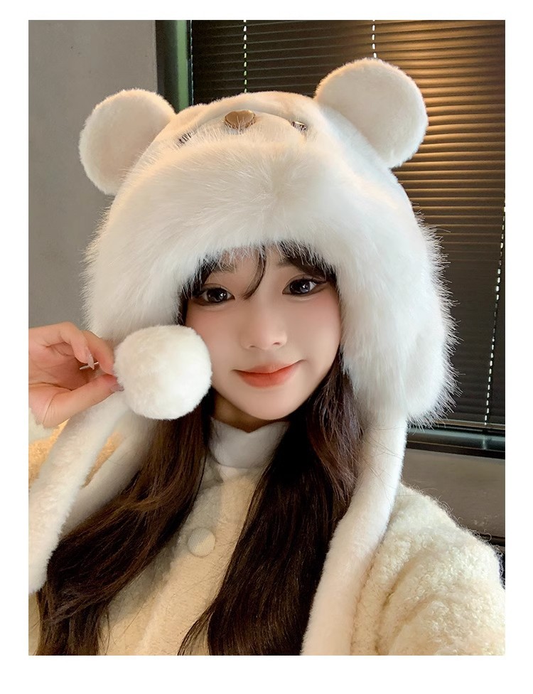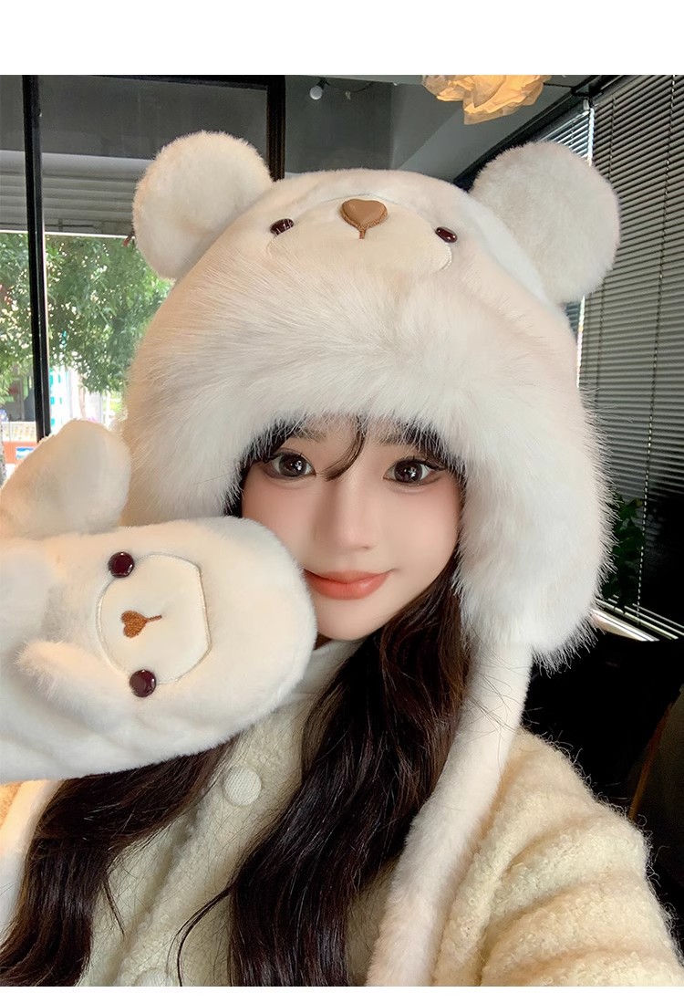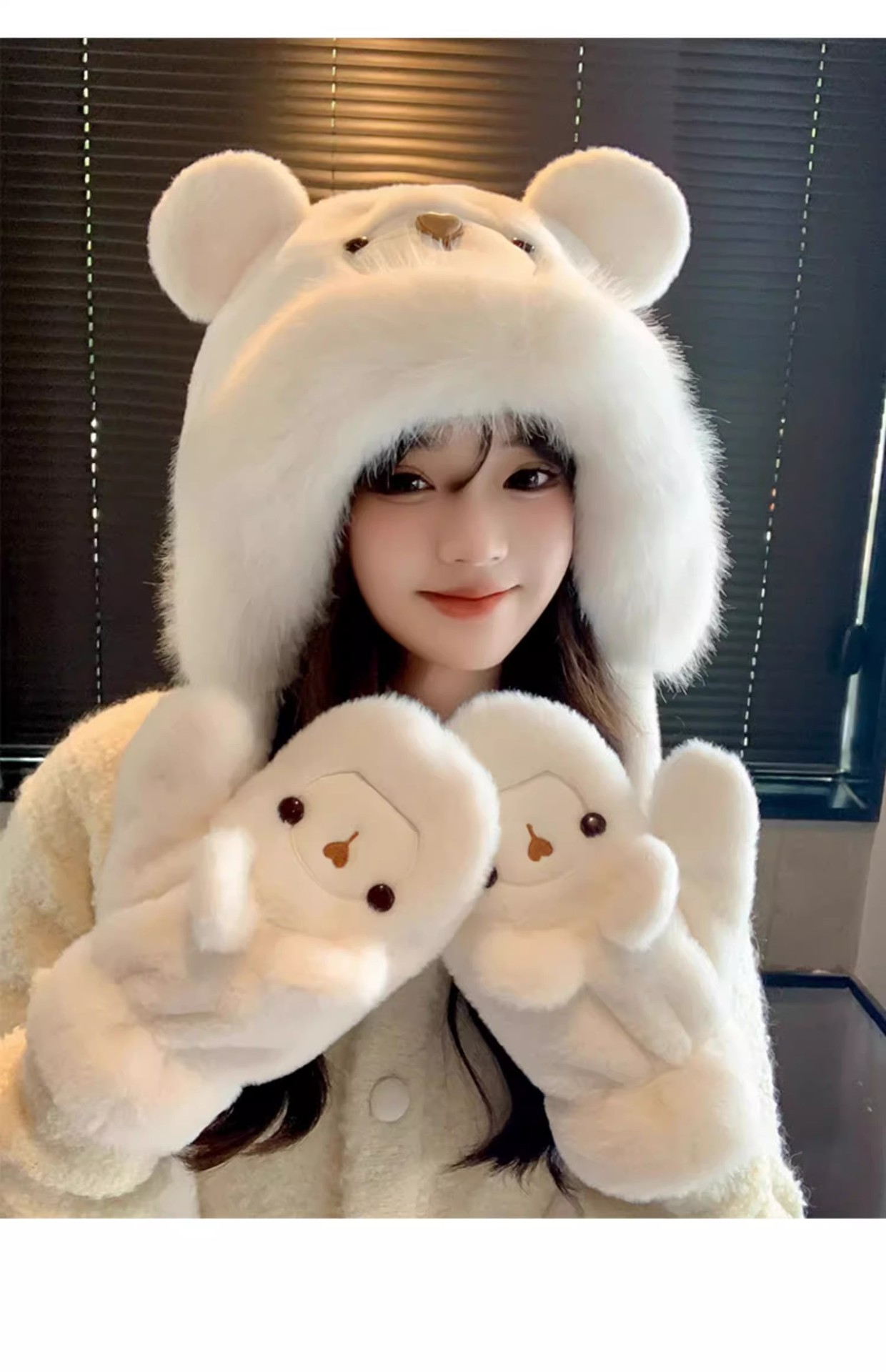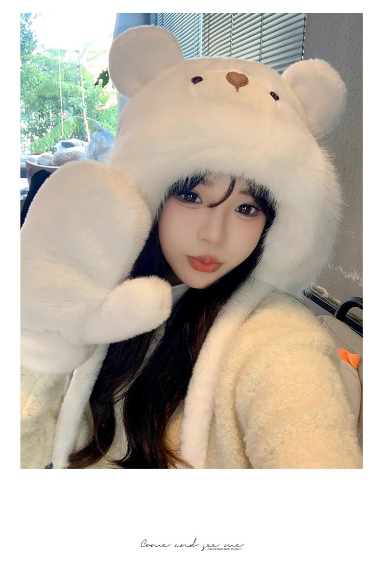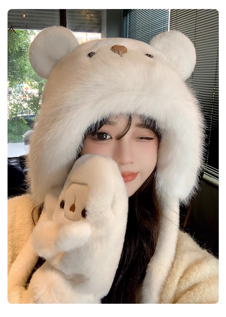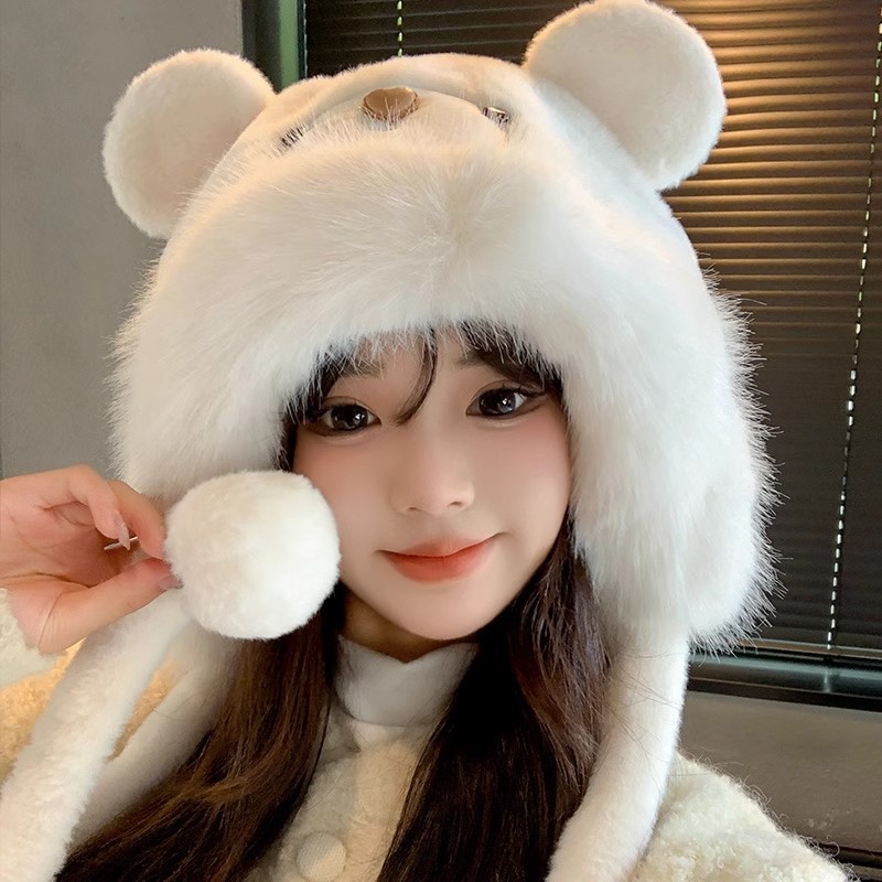 毛绒小熊耳朵帽子女秋冬季加厚保暖护耳套头帽可爱雷锋帽骑车手套