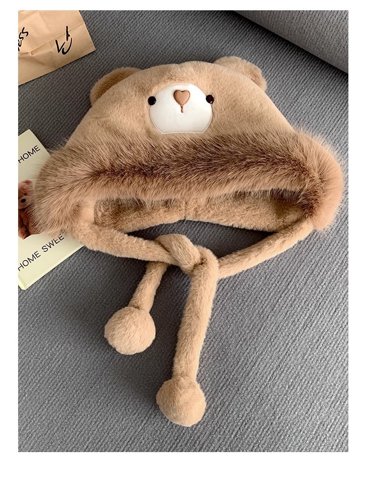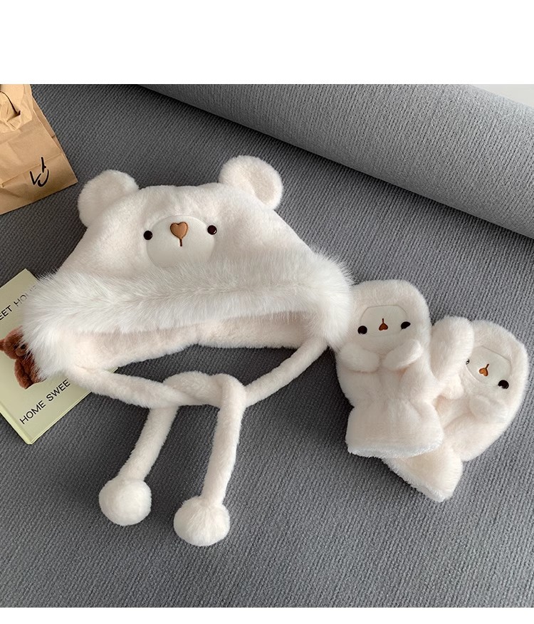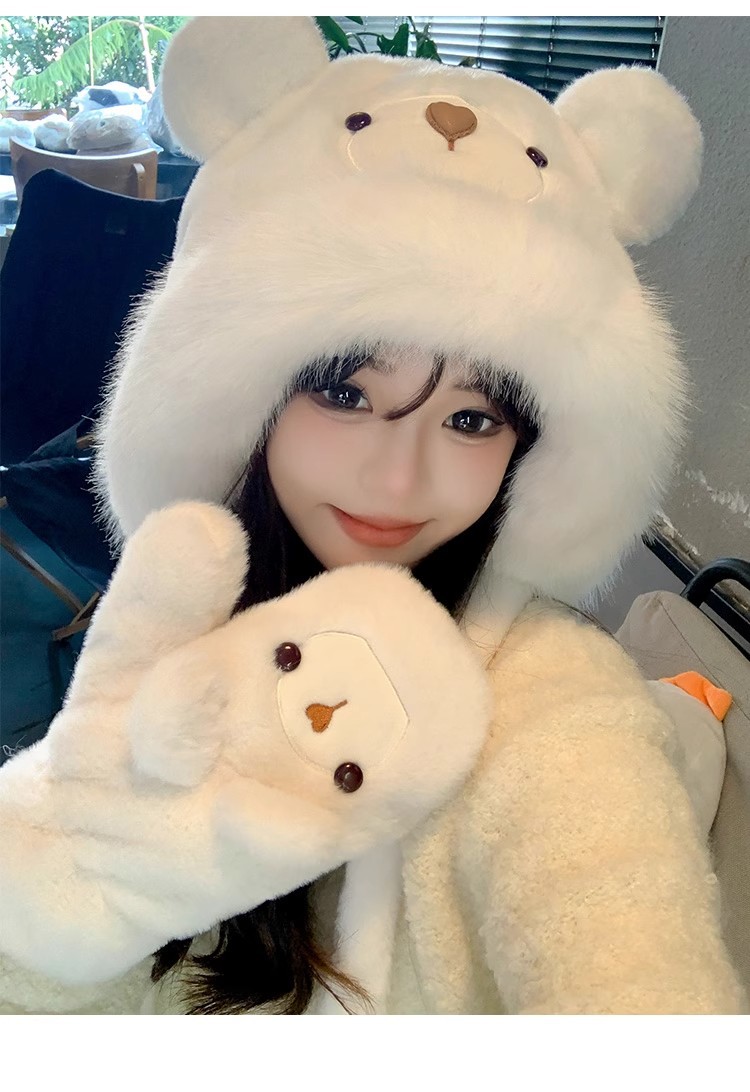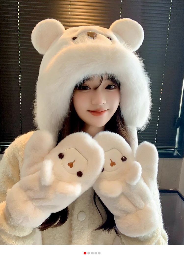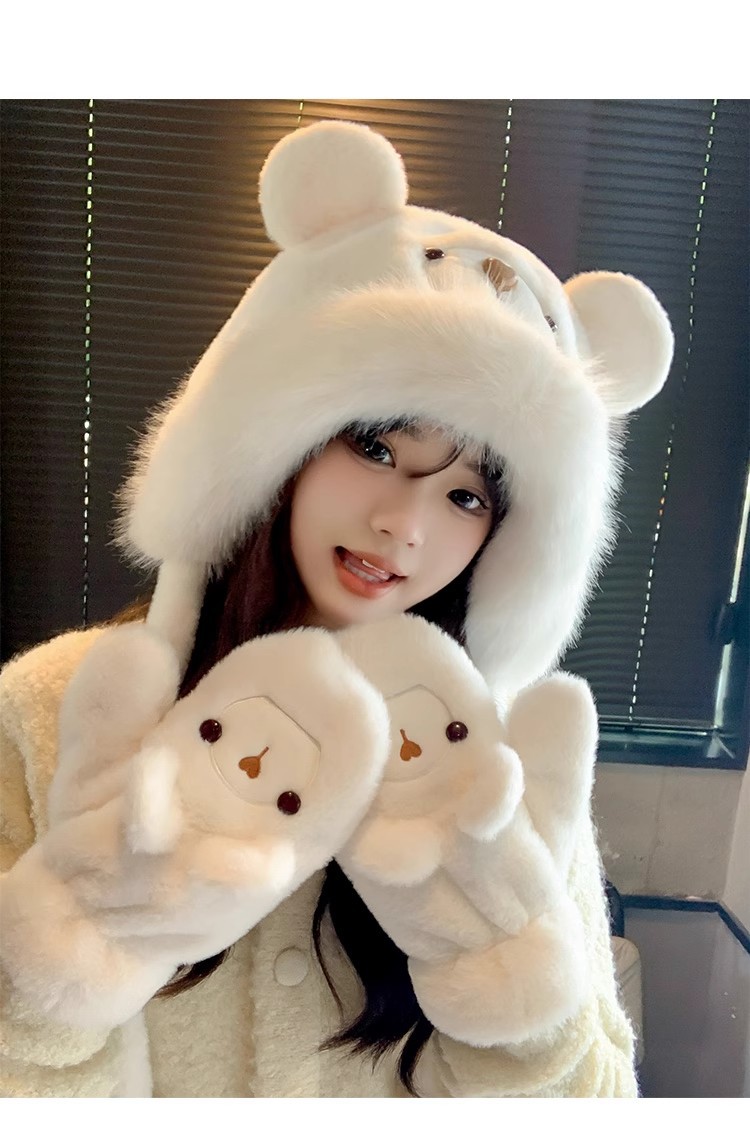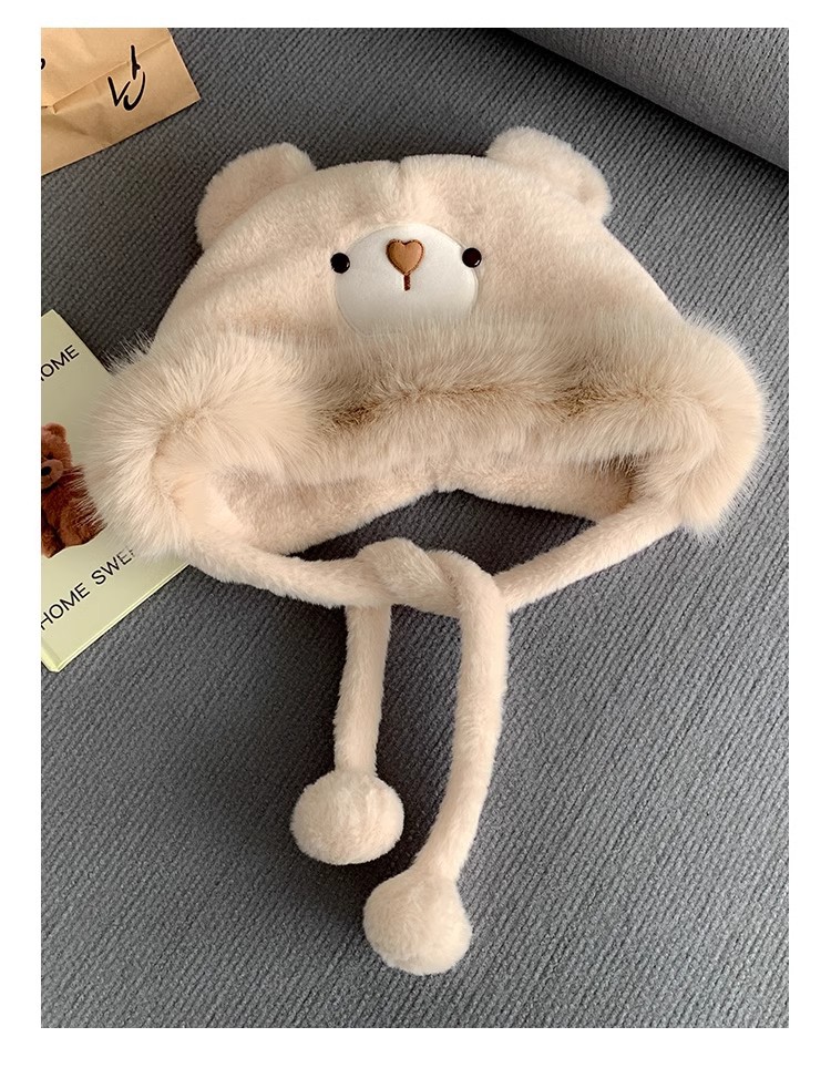 毛绒小熊耳朵帽子女秋冬季加厚保暖护耳套头帽可爱雷锋帽骑车手套