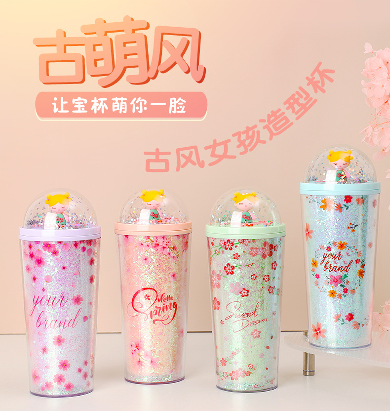 便携水杯网红亮片双层夏季饮水塑料冰杯呆萌女孩卡通可爱双层外出