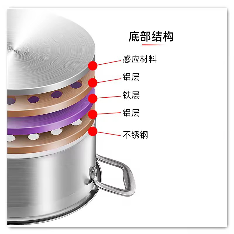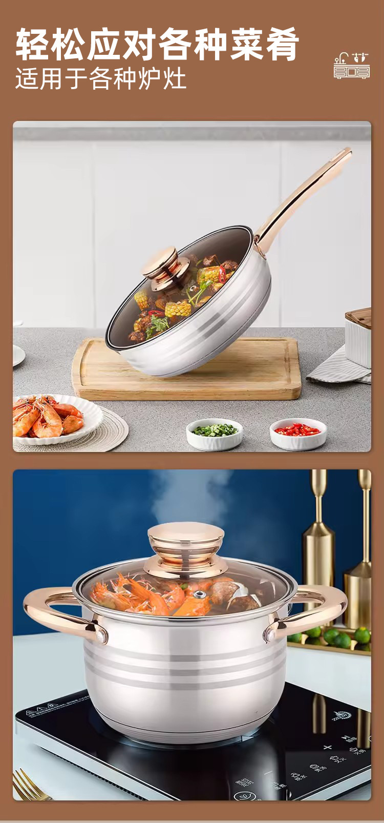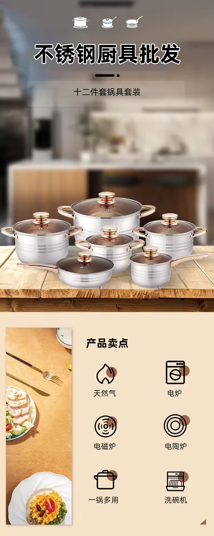 热销不锈钢锅具12件套炊具套装 加厚复底汤锅平底锅跨境出口套锅