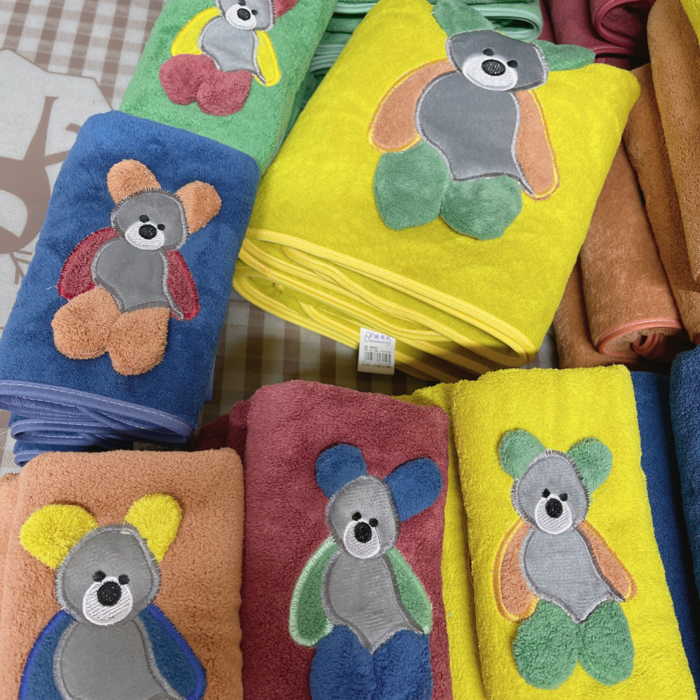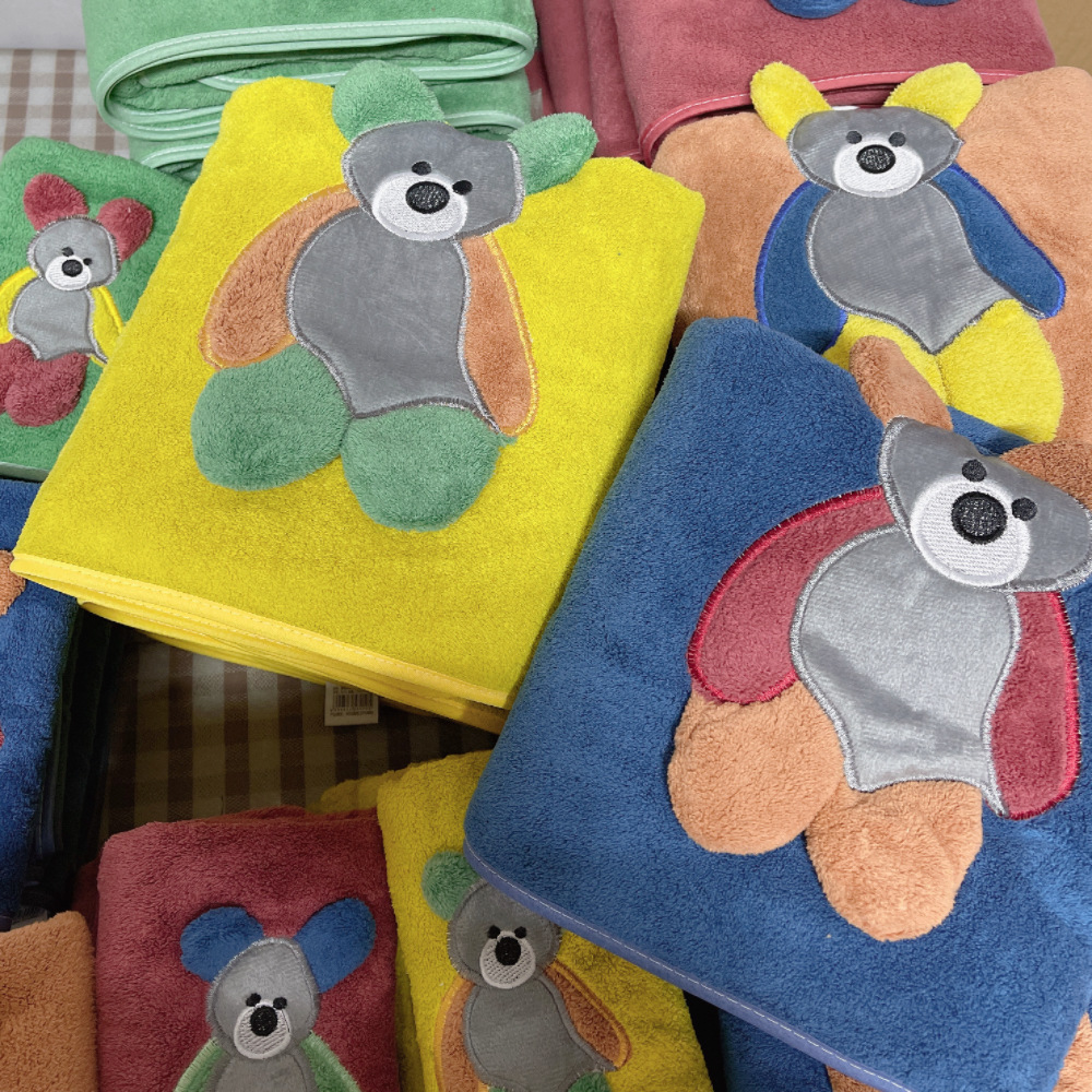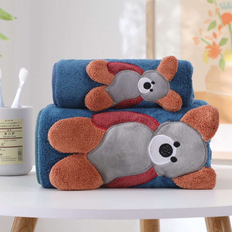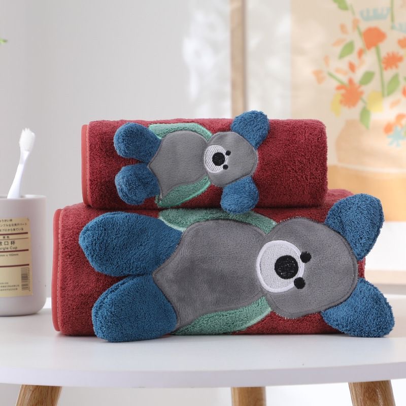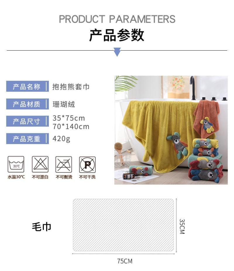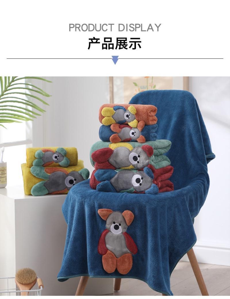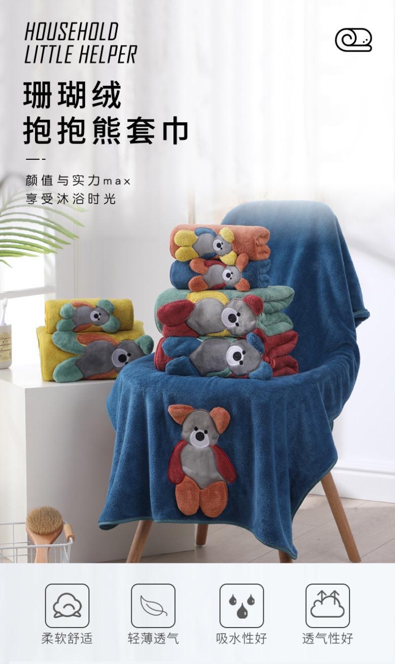 珊瑚绒卡通刺绣浴巾毛巾抱抱熊套装家用儿童加厚浴巾柔软吸水亲肤