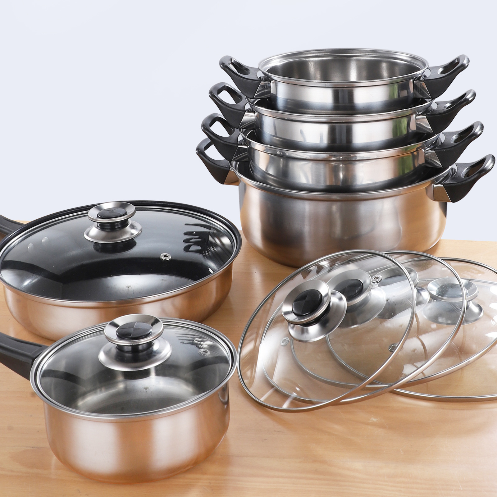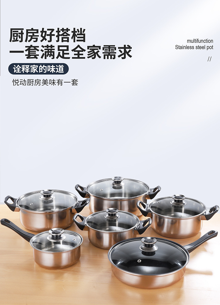 跨境外贸货源不锈钢锅12件套套装锅黑柄奶锅汤锅煎锅墨西哥西班牙