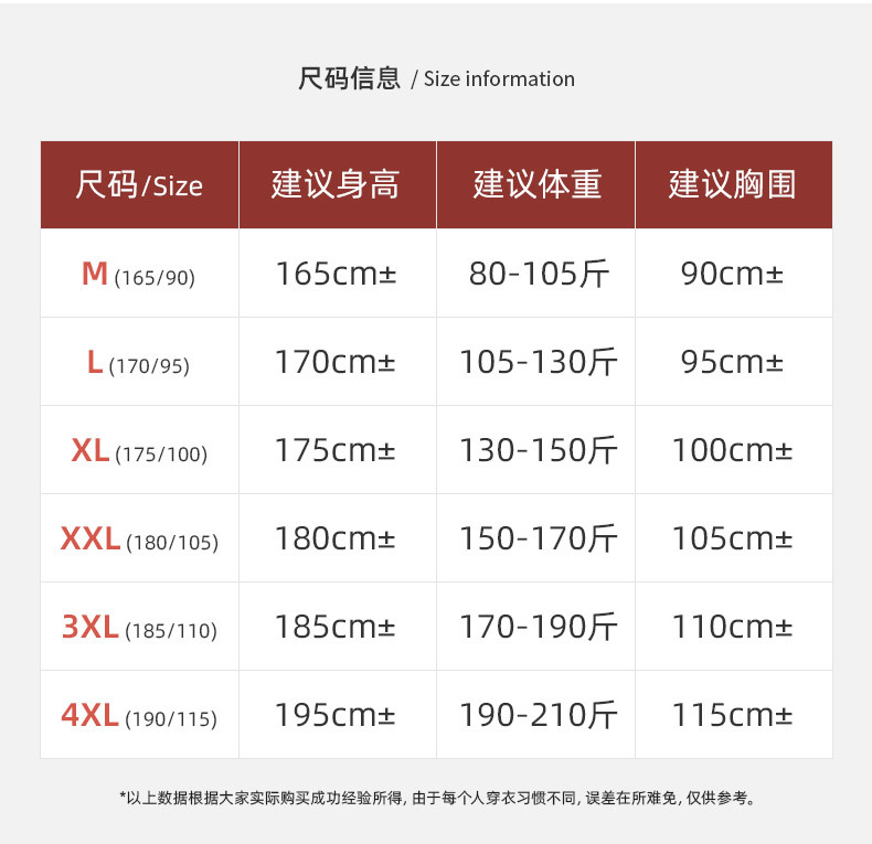 | 4xl (95.00 kg-105.00 kg(4XL(190-210斤)) | USD $7.76 | 93 piece available |