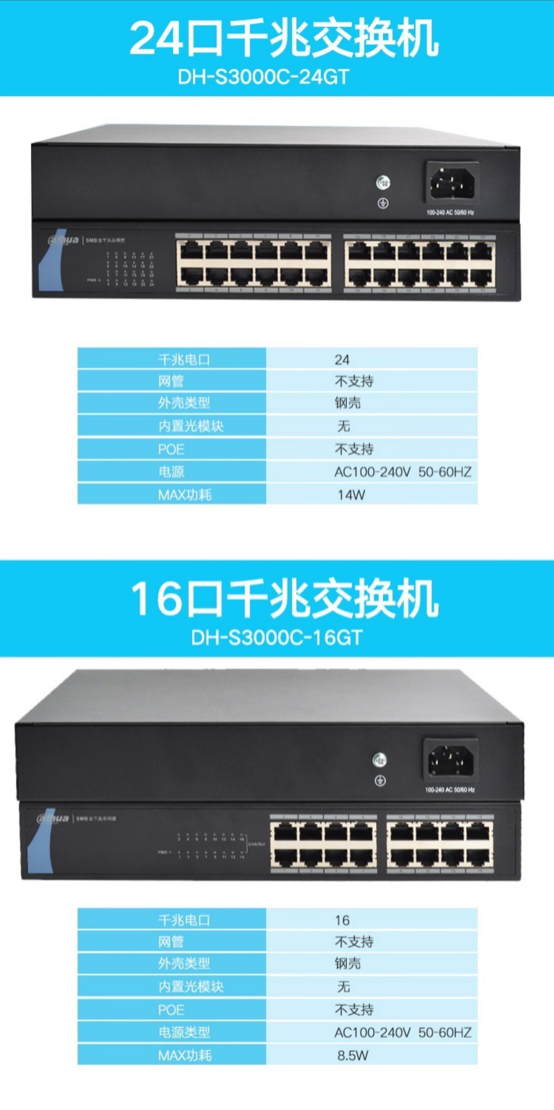 大华数通千兆非POE网络交换机8/16口/24端口批发价格 S3000C系列