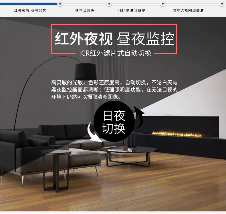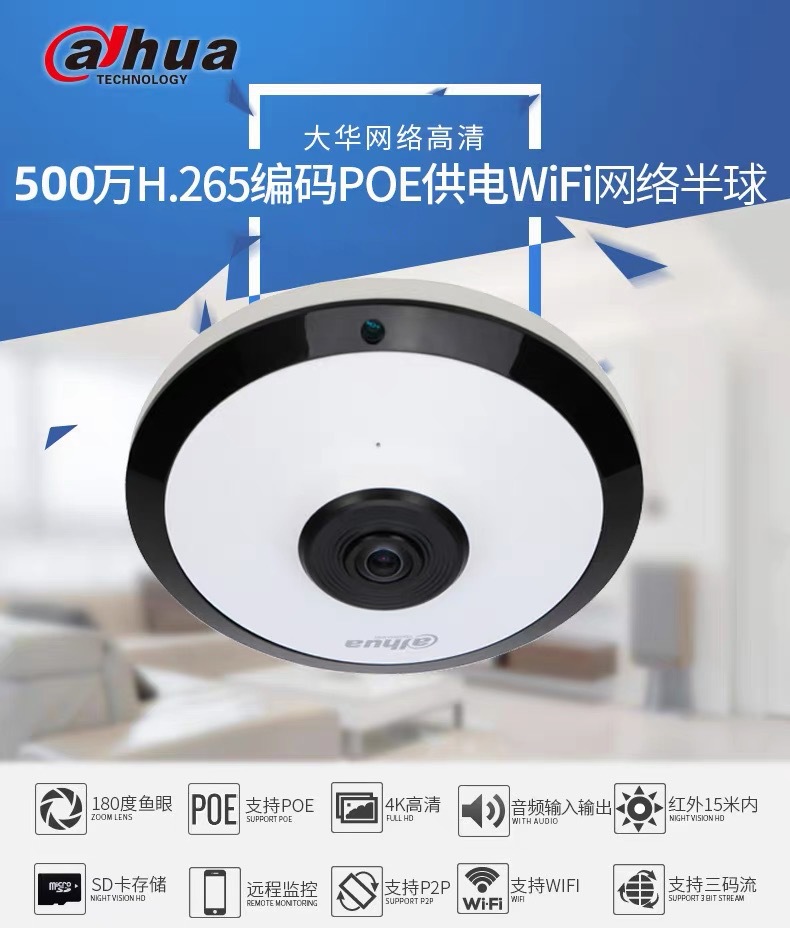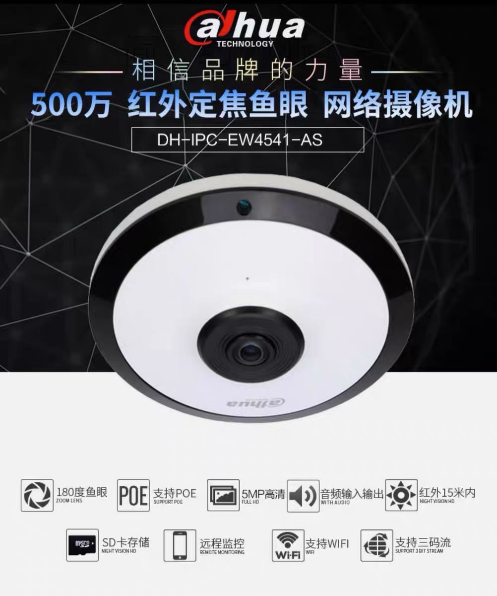 大华500万红外鱼眼广角全景摄像头无线POE/WiFi网络摄像机EW4541