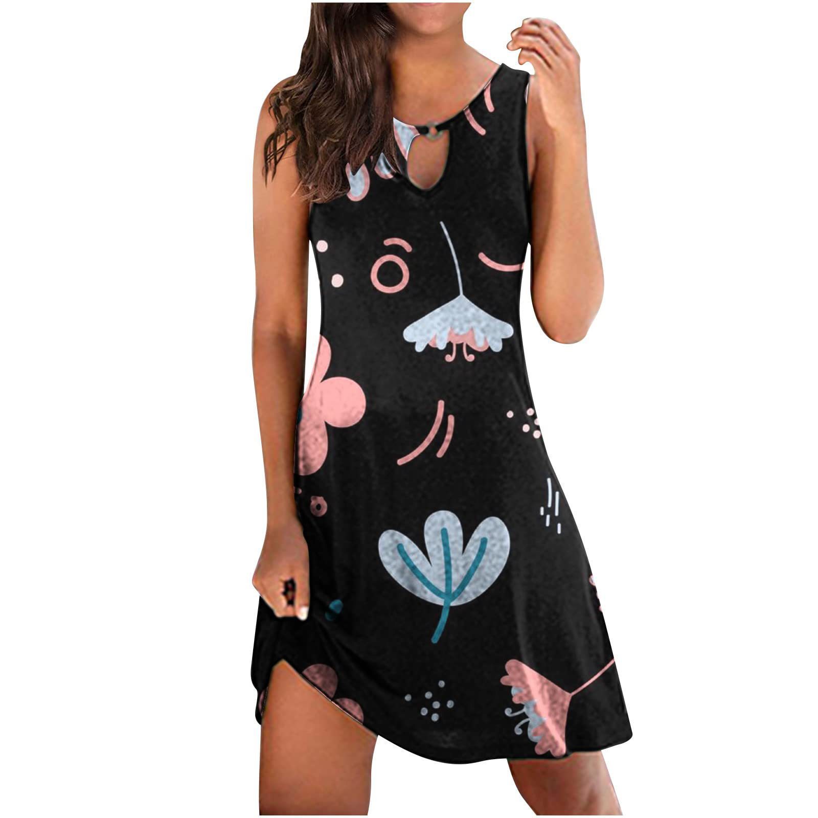 2022欧美新款独立站热销波西米亚圆领无袖复古印花迷你沙滩连衣裙