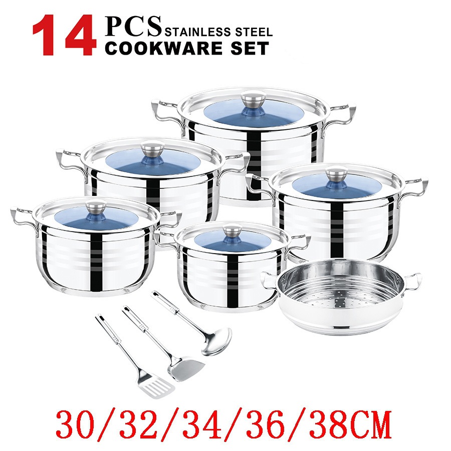 出口不锈钢套装锅炊具14PCS 组合不锈钢盖cookware多层复底锅具