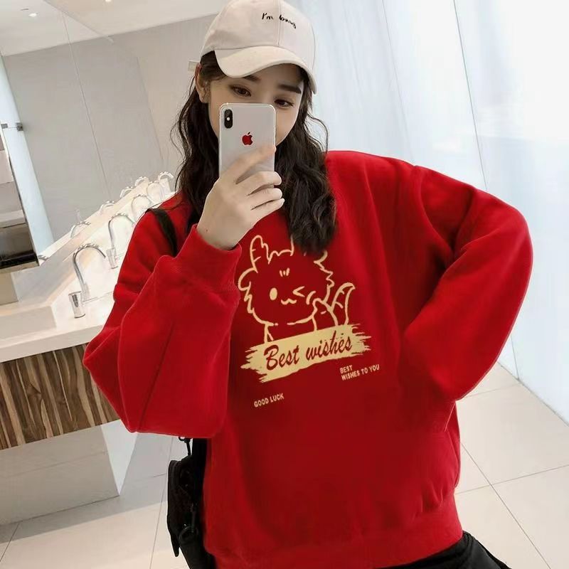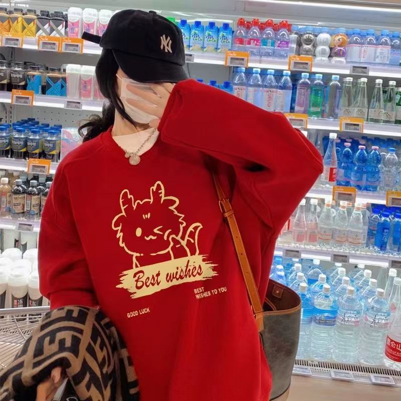 2024龙年本命年衣服红色连帽卫衣女时尚秋冬新款过年情侣学生上衣