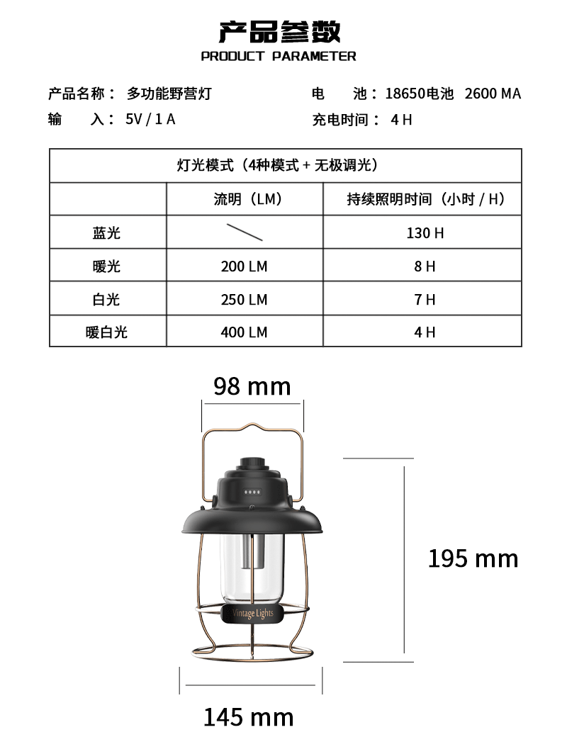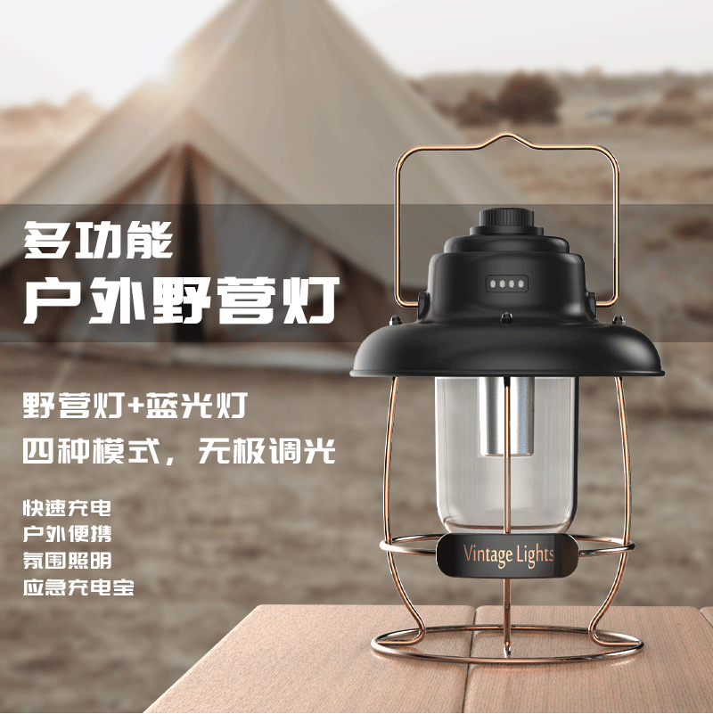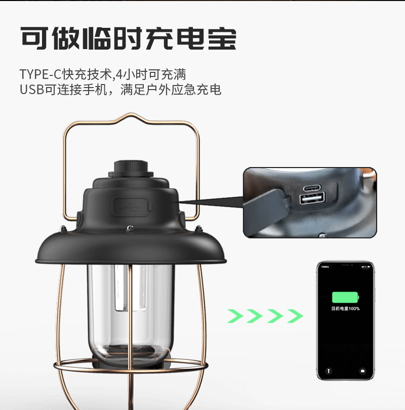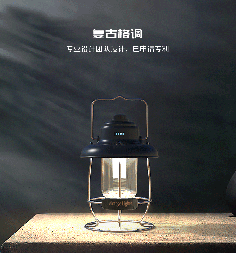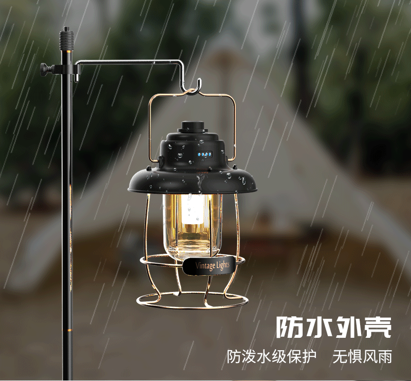 多功能复古铁艺野营灯 充电18650无极调光LED露营悬挂野营灯