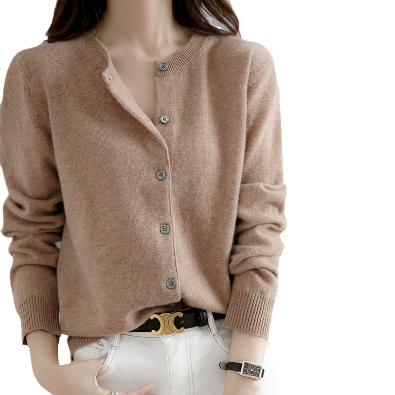 初秋新款圆领针织开衫女宽松大码薄款毛衣纯色外搭洋气打底衫外套