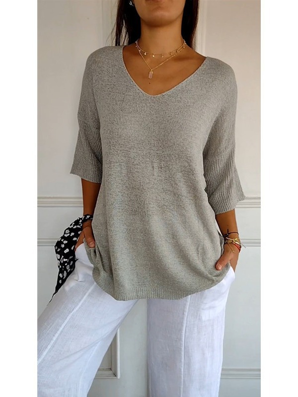 欧美针织衫外贸休闲毛衣基础款显瘦V领七分袖纯色针织衫女打底衫