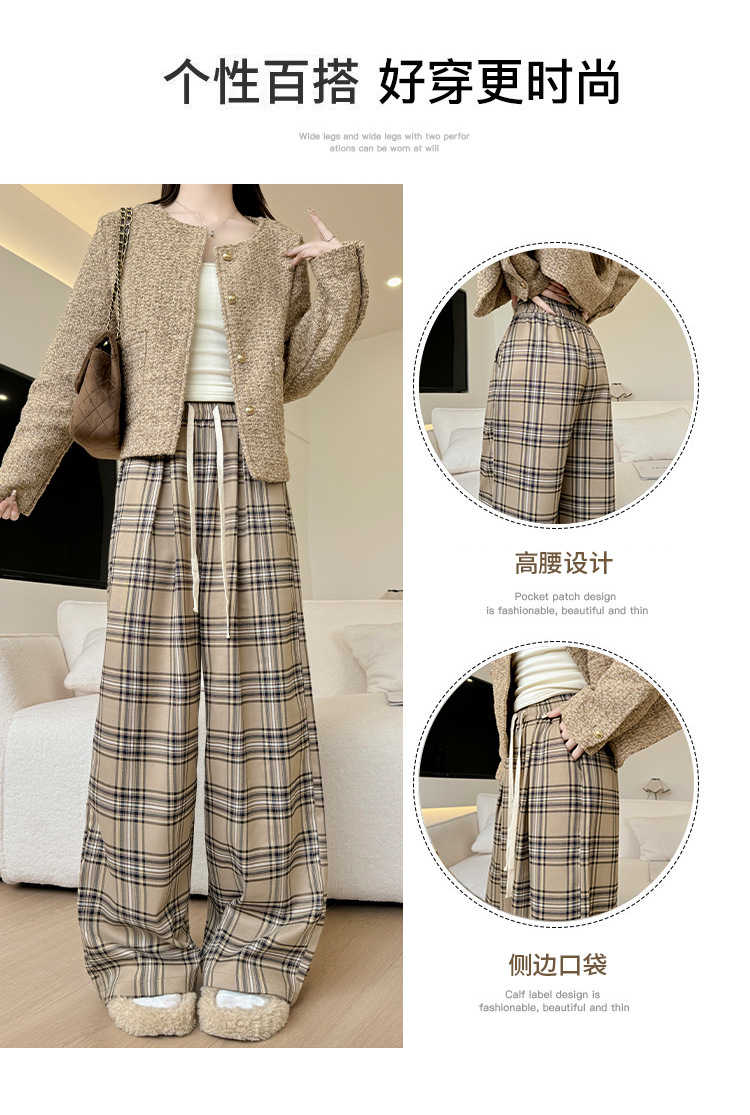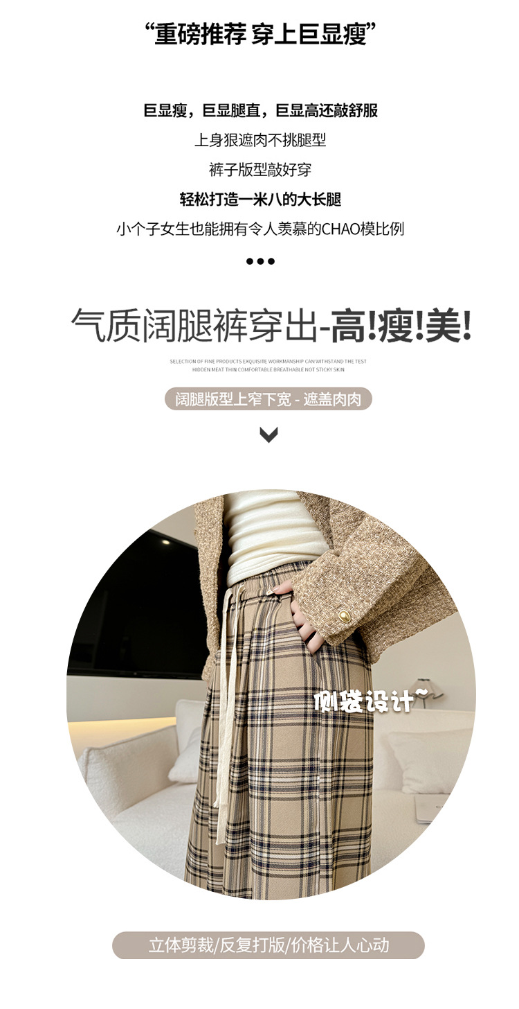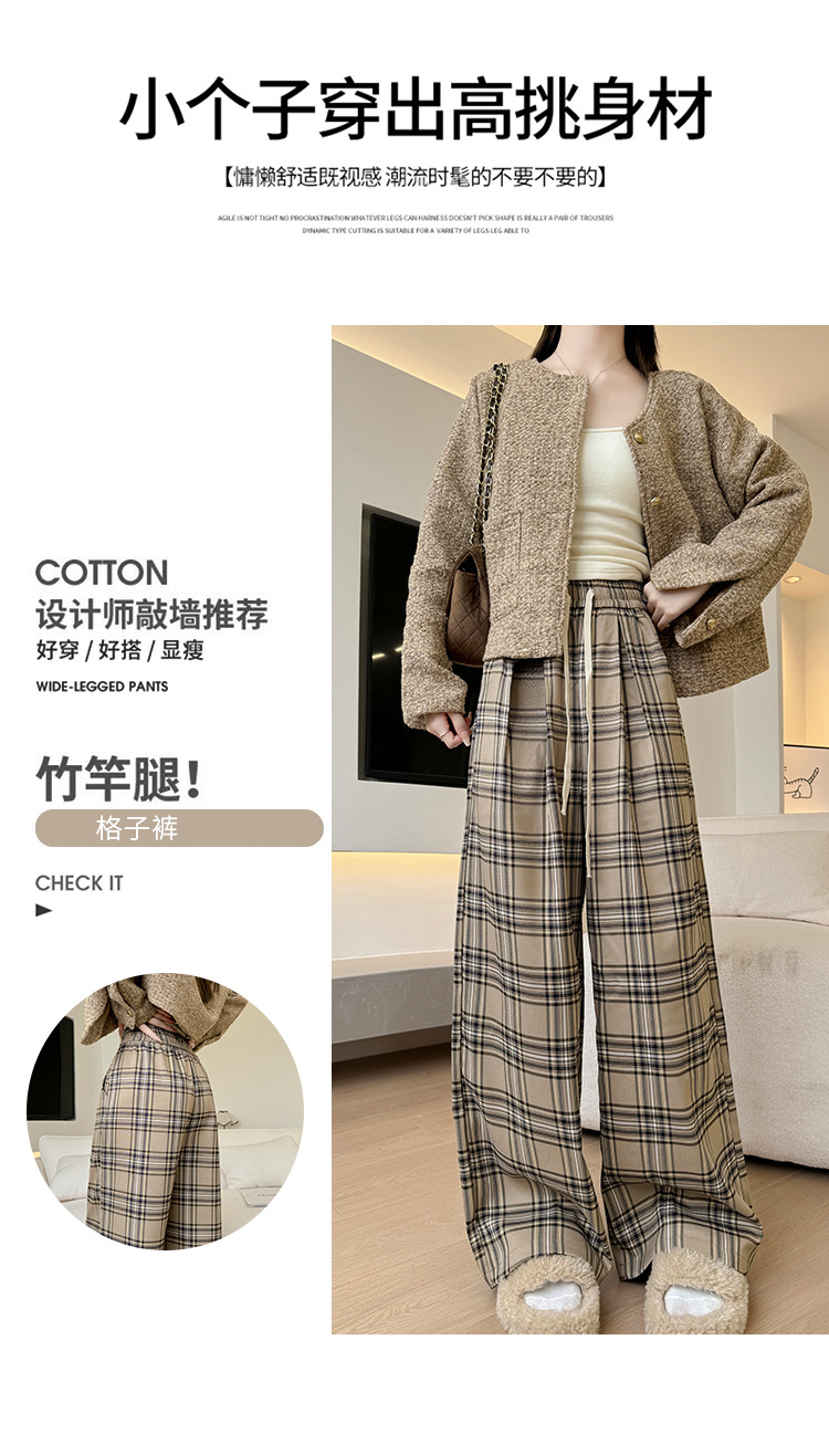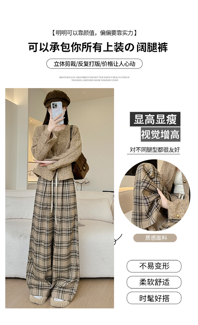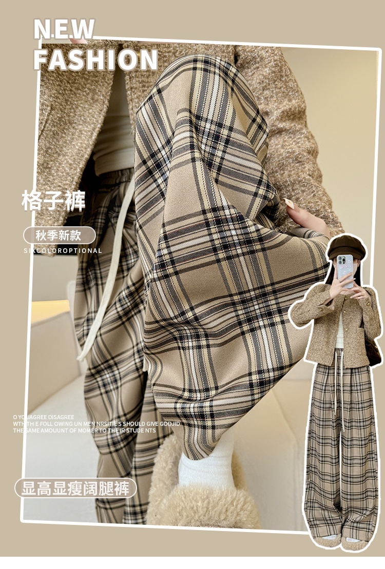 卡其美式格子裤子女秋冬新款高腰垂感宽松直筒裤慵懒风休闲阔腿裤