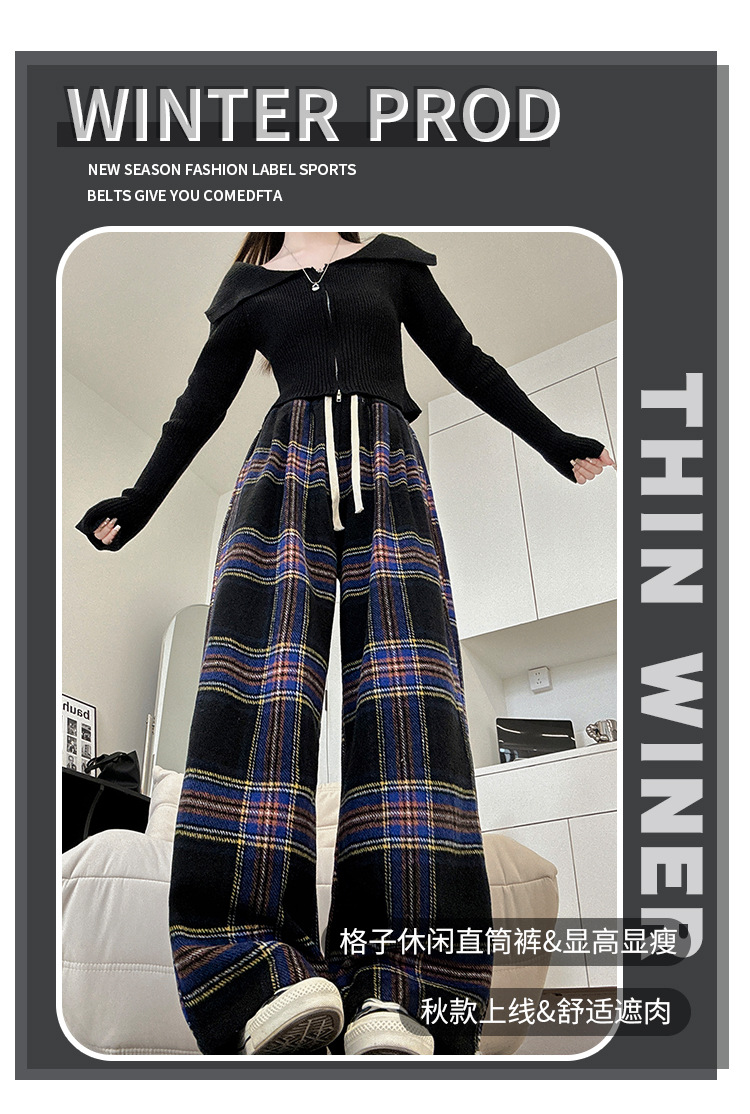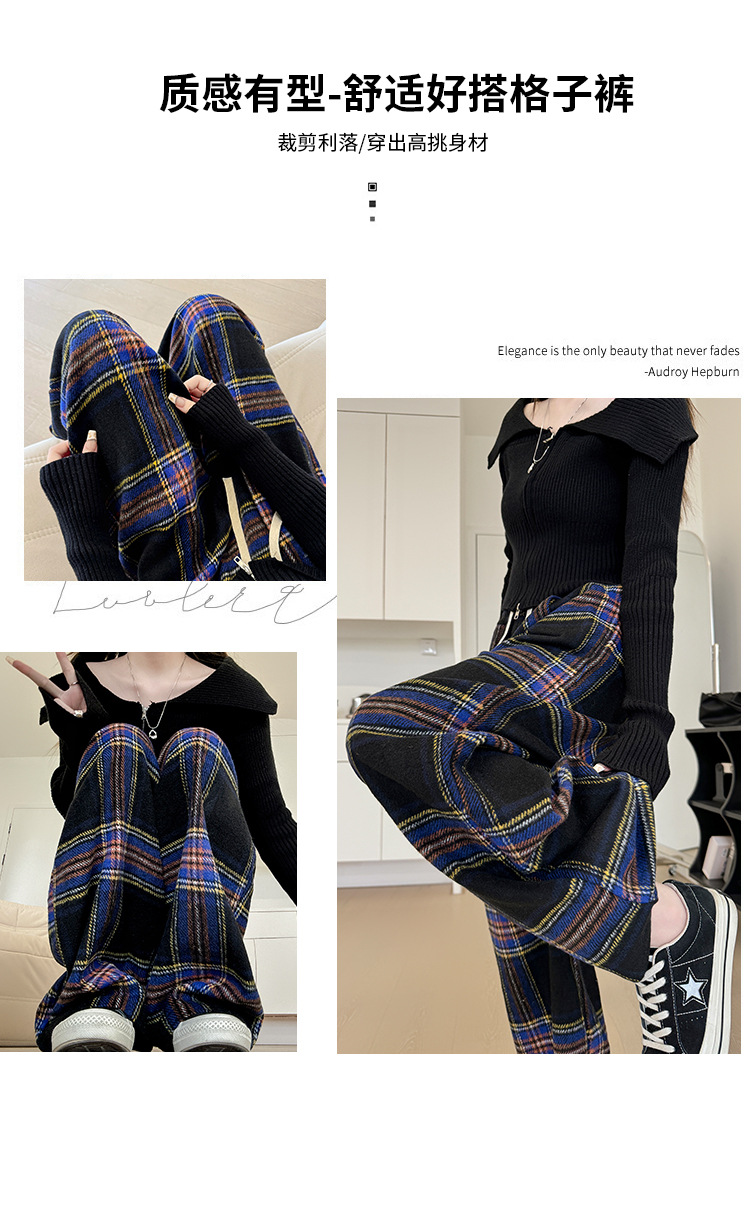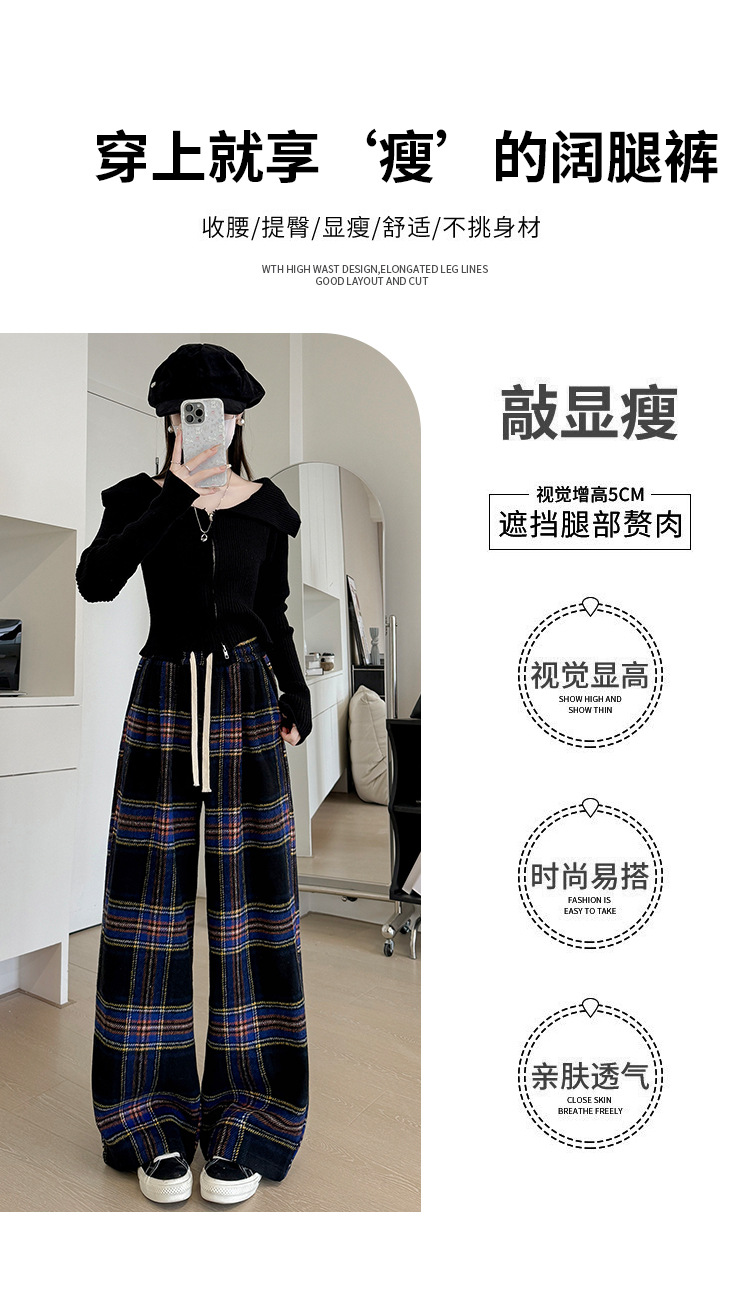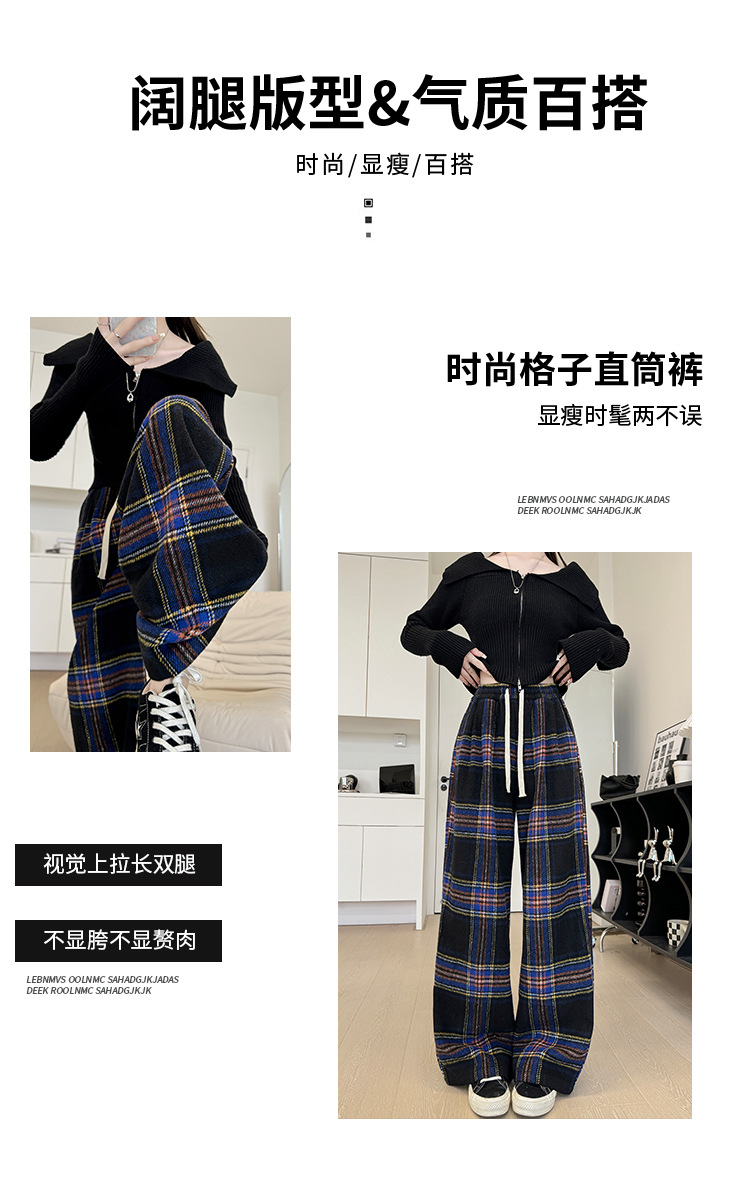 韩系复古格子阔腿裤女裤秋季女2024新款显瘦直筒裤宽松高腰阔腿裤