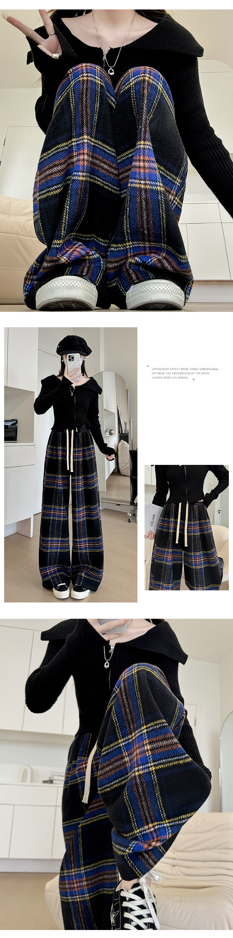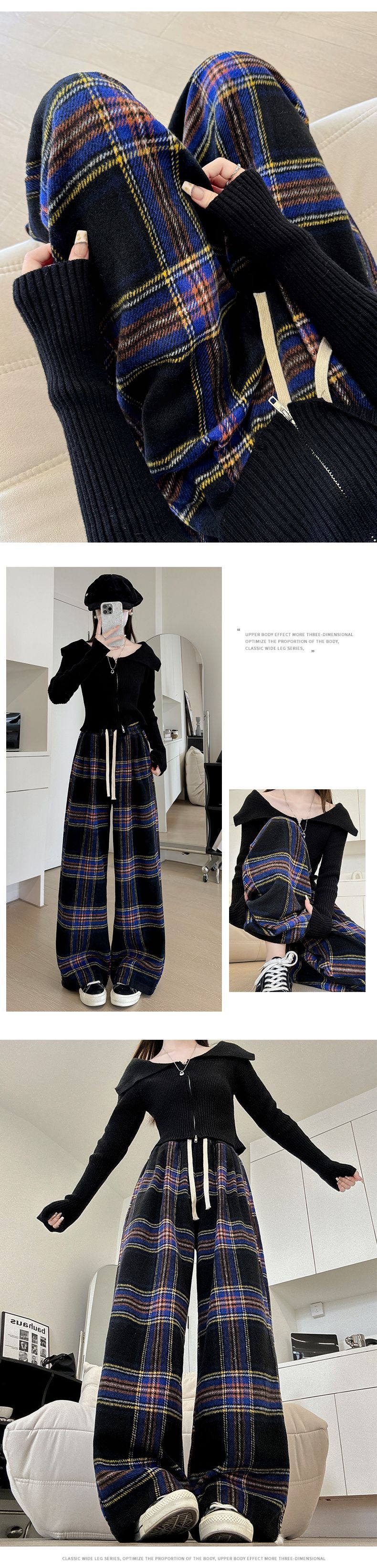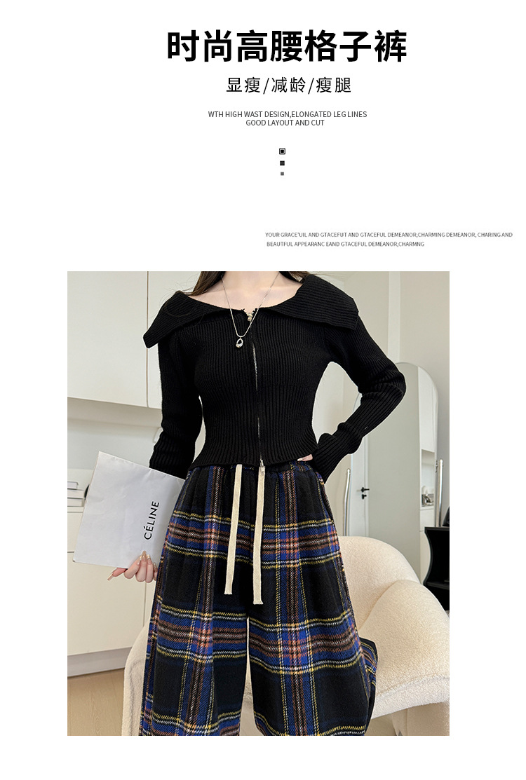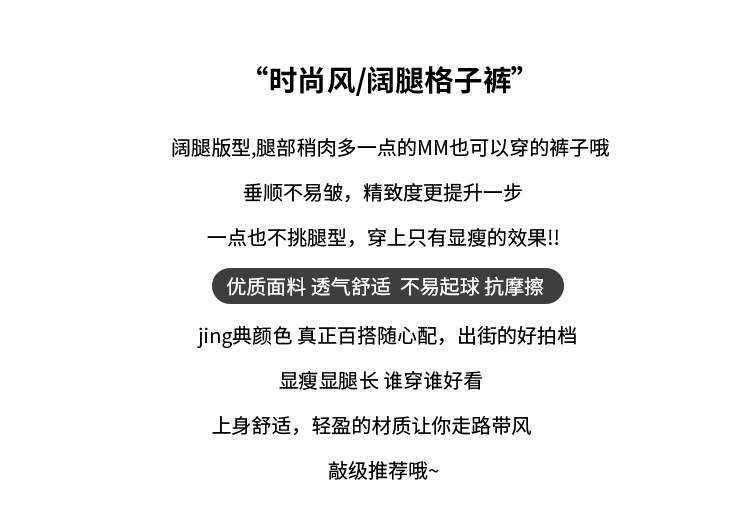 韩系复古格子阔腿裤女裤秋季女2024新款显瘦直筒裤宽松高腰阔腿裤