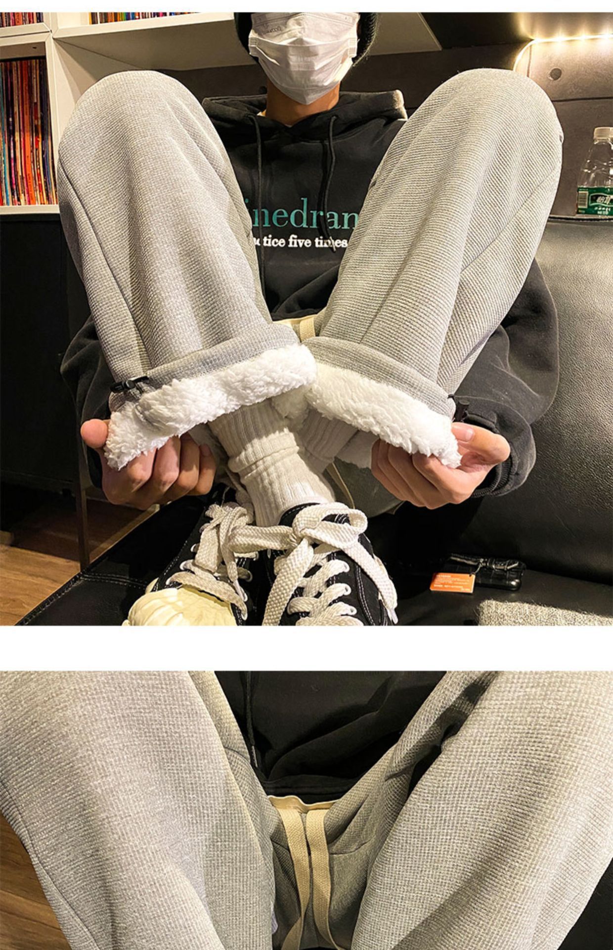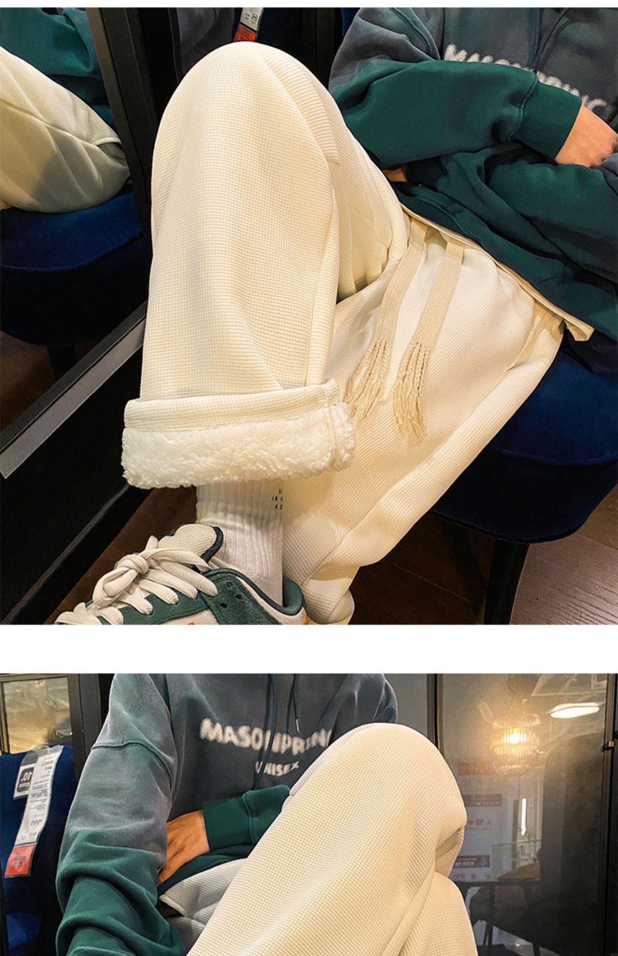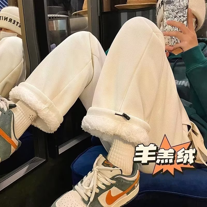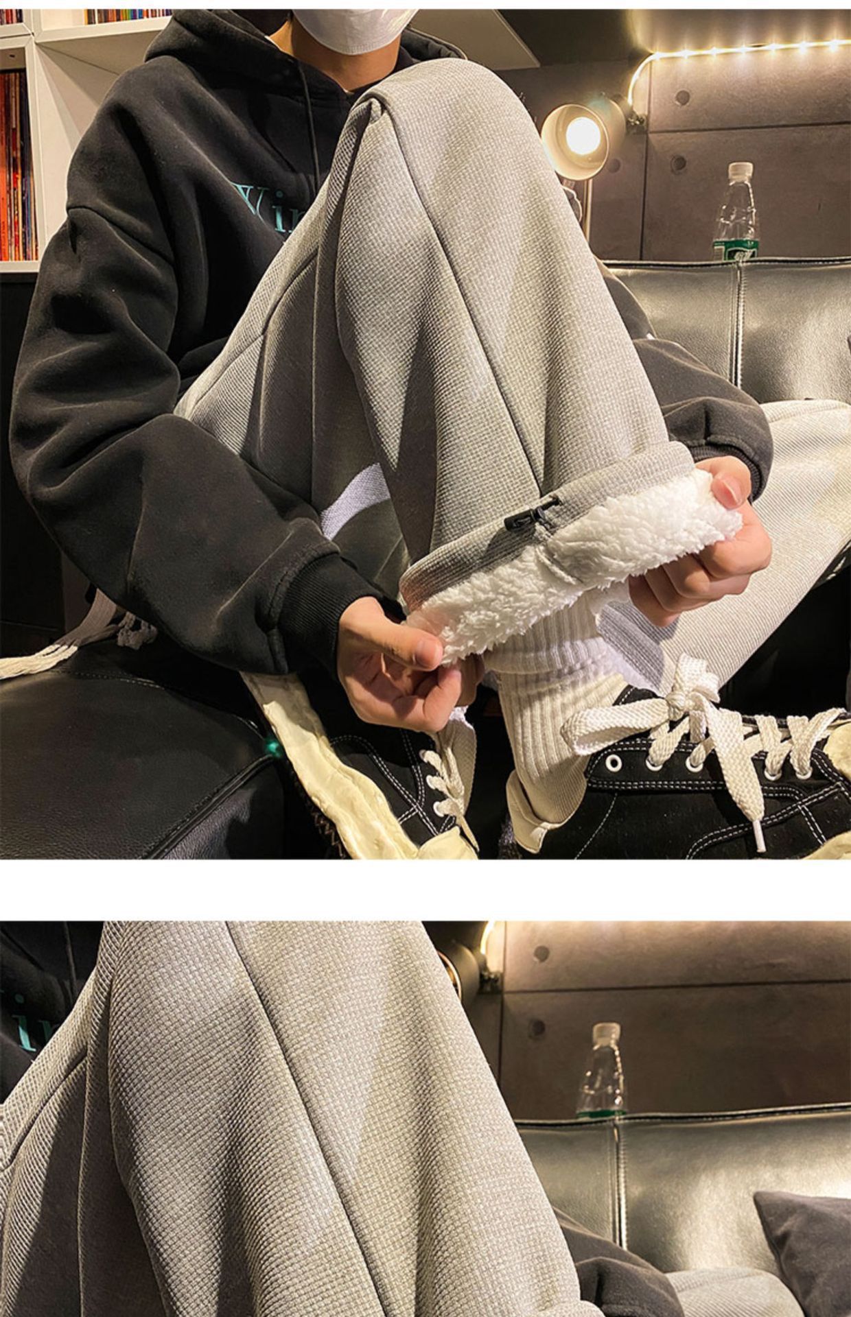 加绒加厚裤子男款冬季华夫格保暖卫裤男青少年羊羔绒束脚运动长裤
