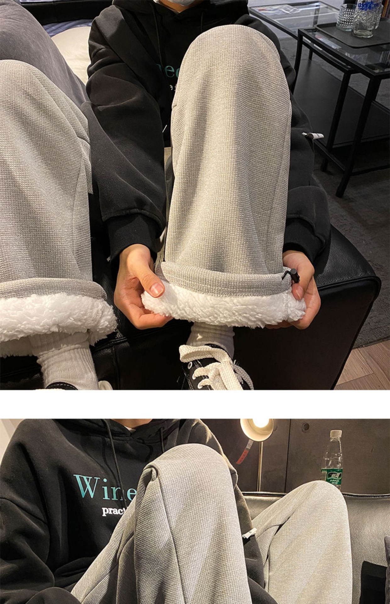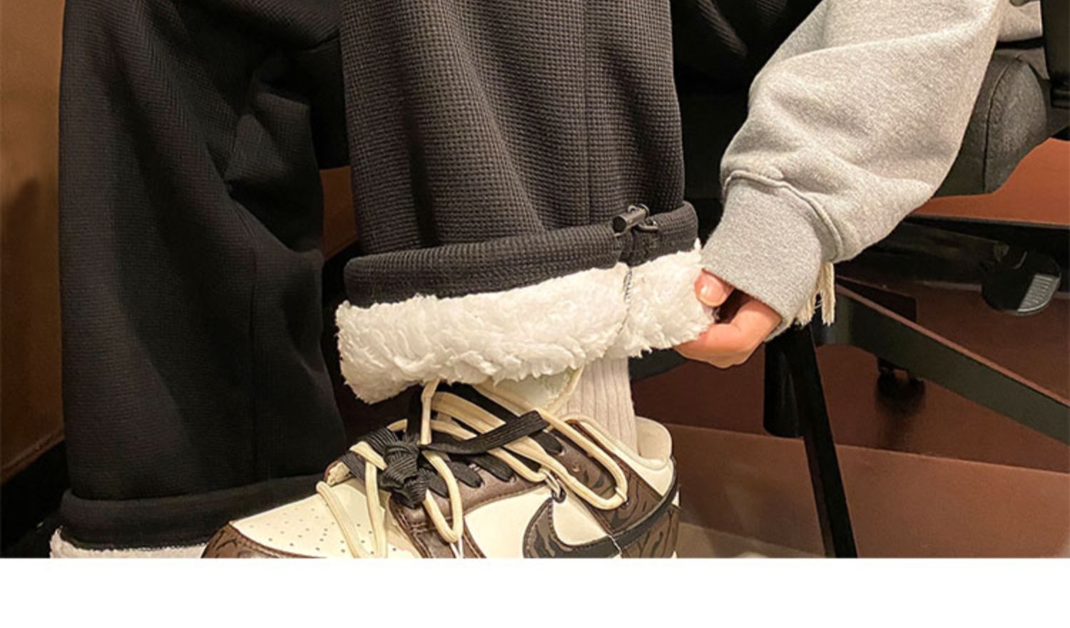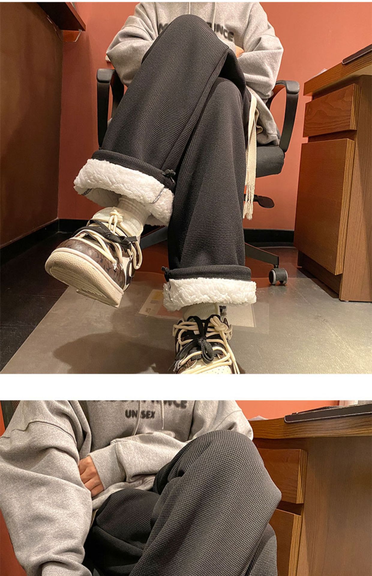 加绒加厚裤子男款冬季华夫格保暖卫裤男青少年羊羔绒束脚运动长裤