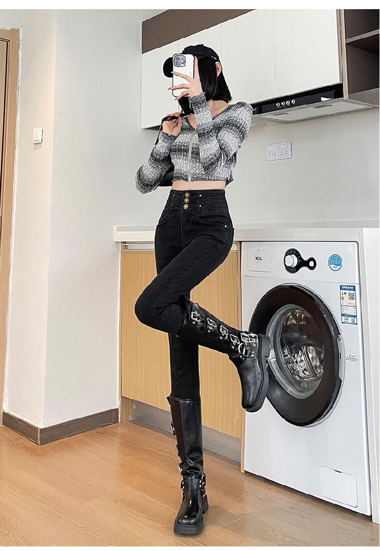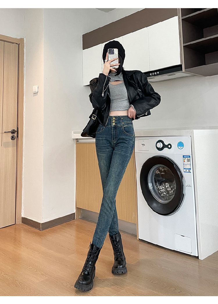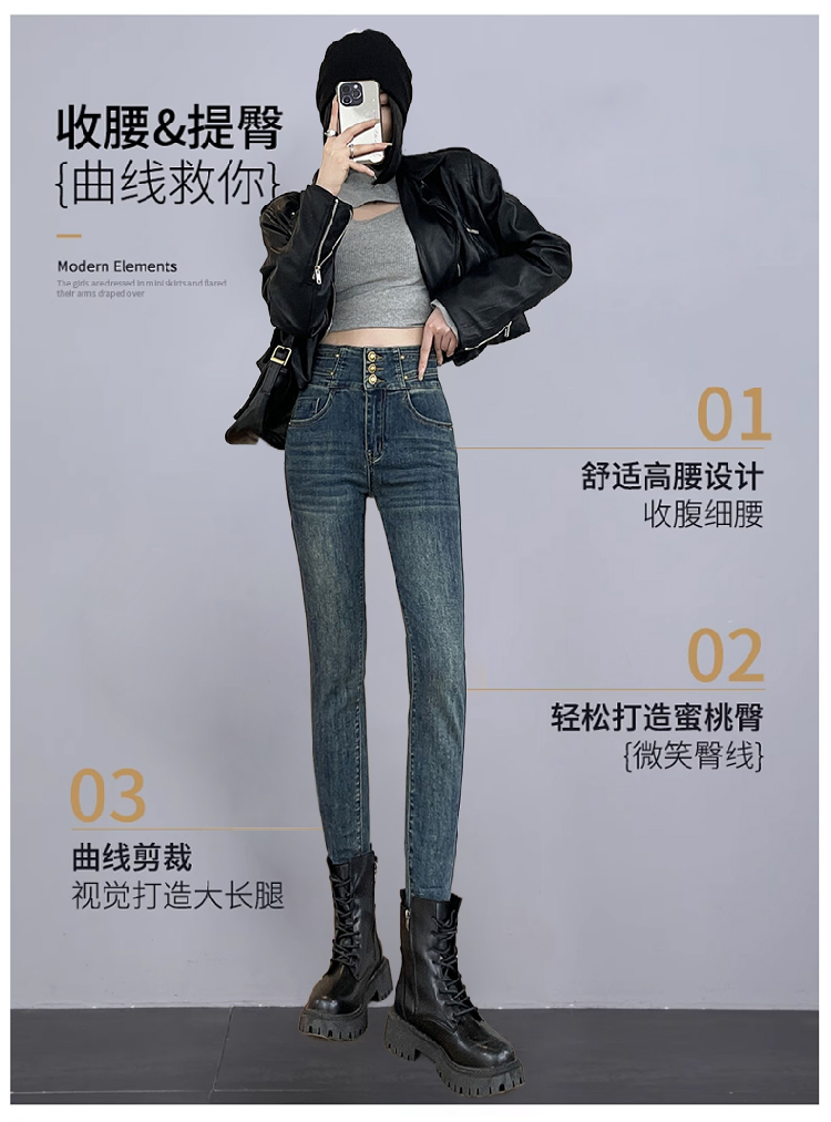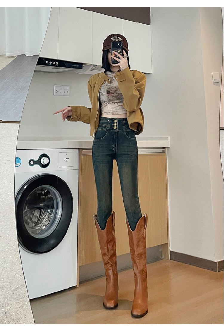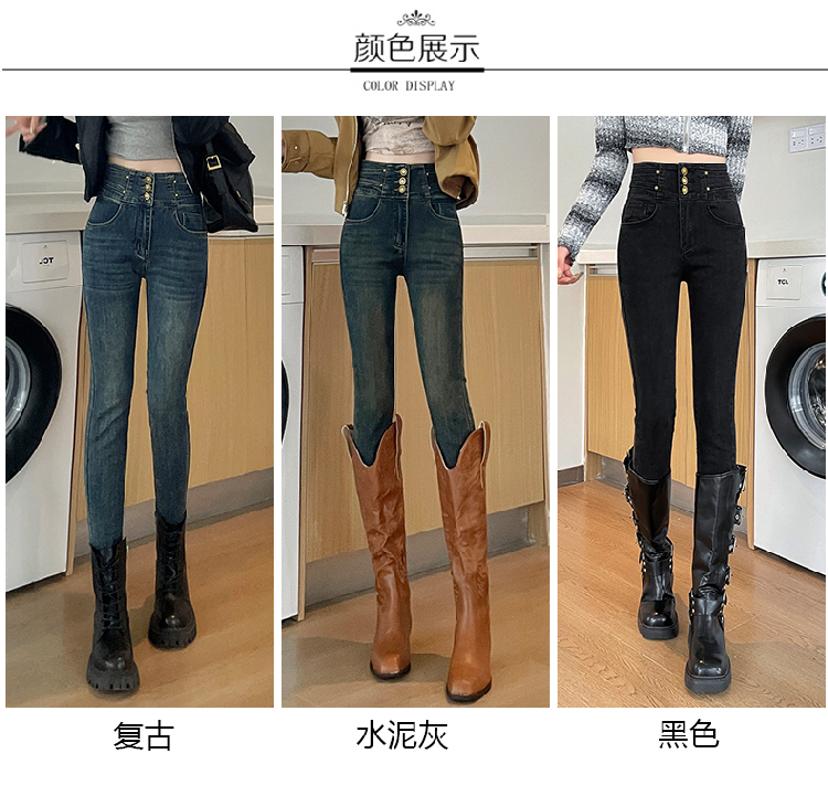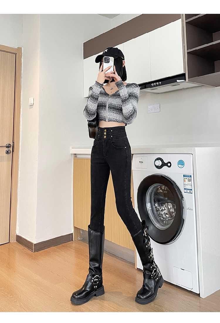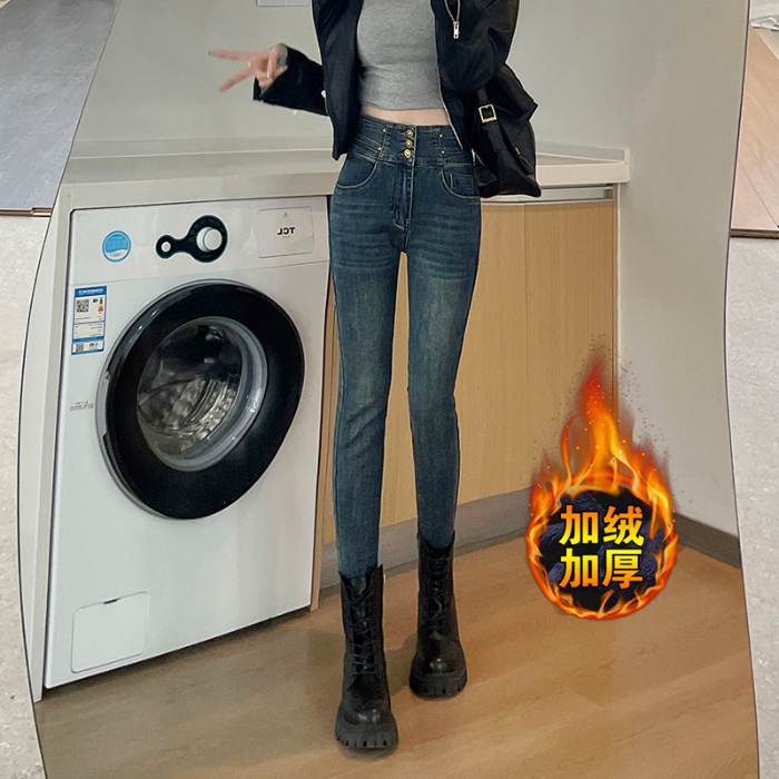 水泥灰加绒加厚小脚牛仔裤女秋冬设计感紧身显瘦弹力高腰铅笔裤子