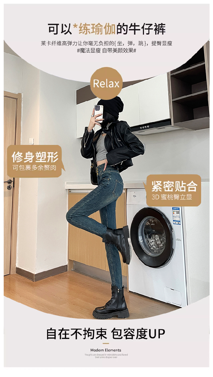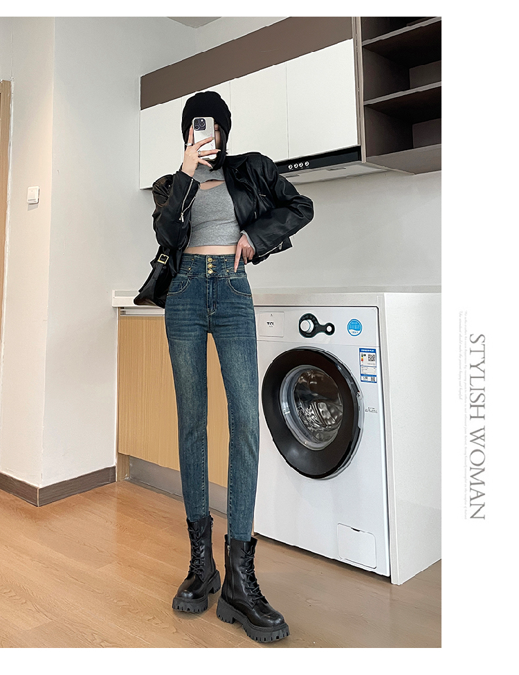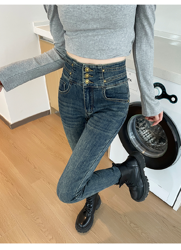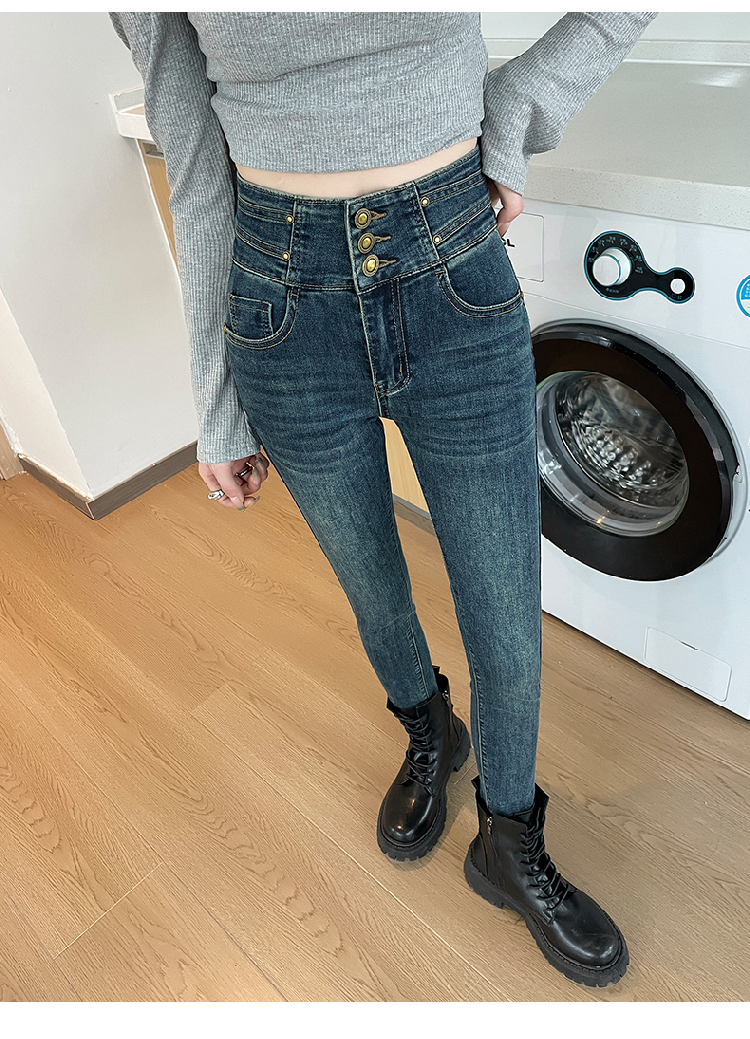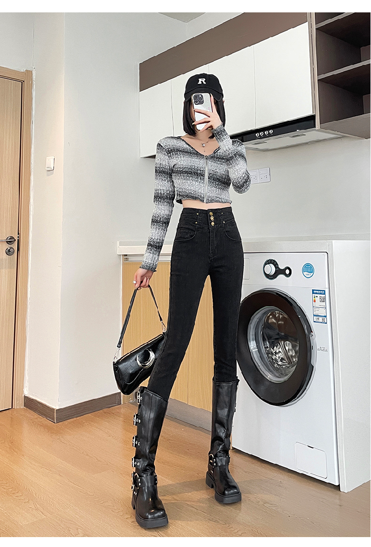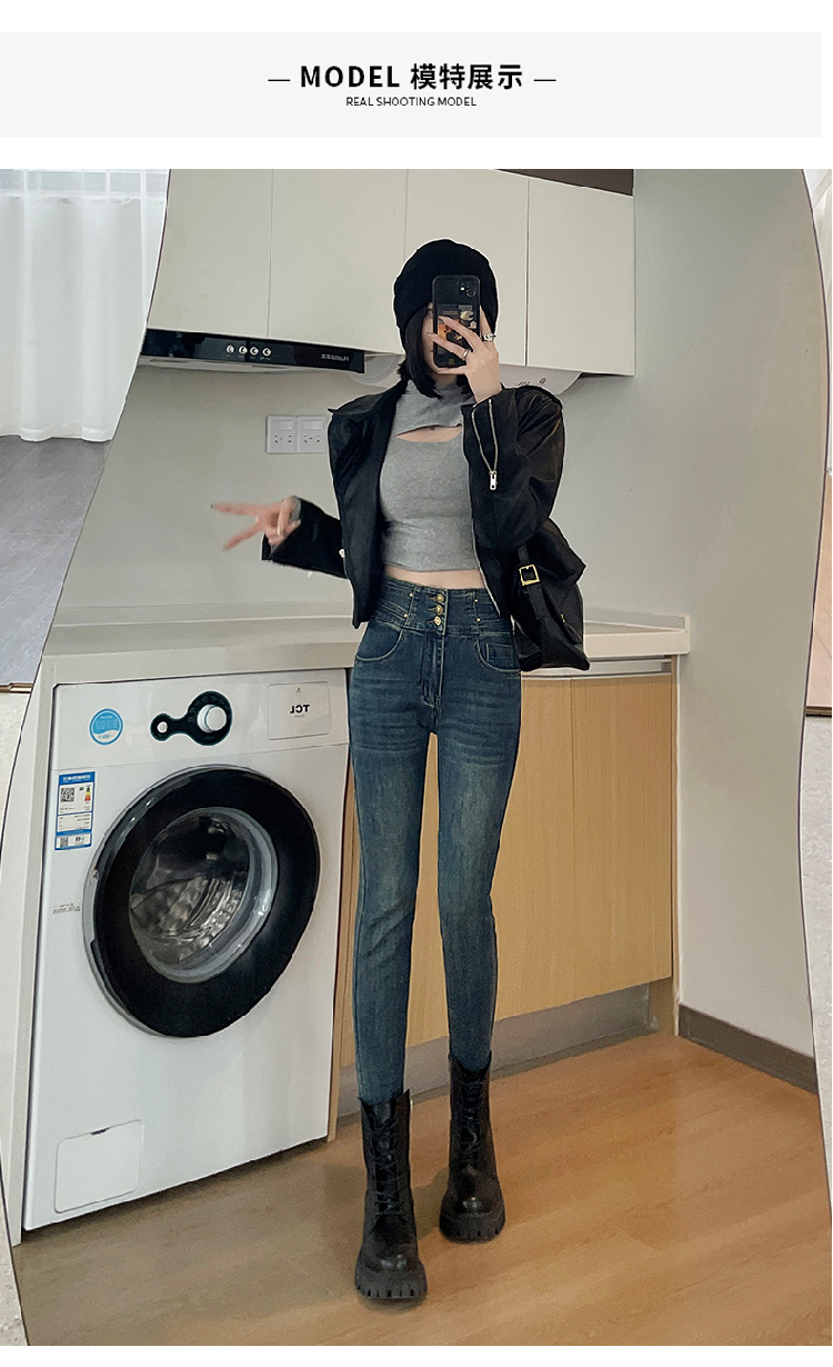 水泥灰加绒加厚小脚牛仔裤女秋冬设计感紧身显瘦弹力高腰铅笔裤子