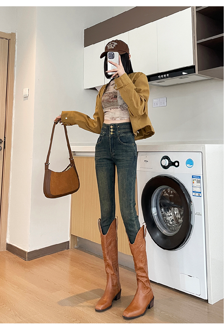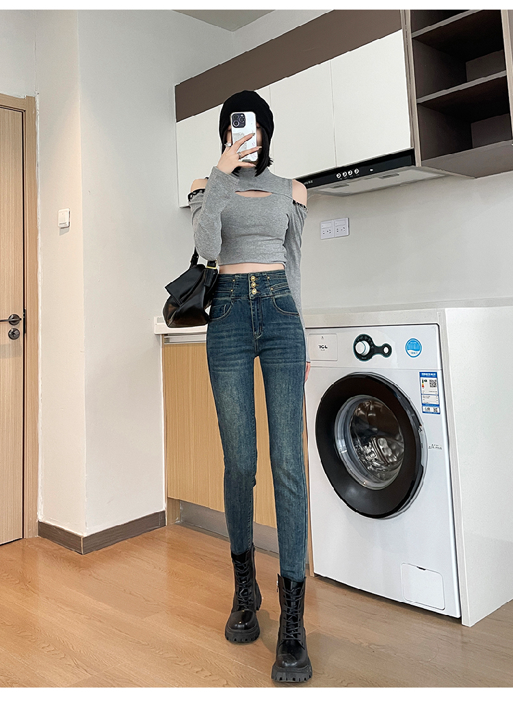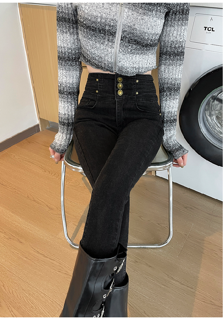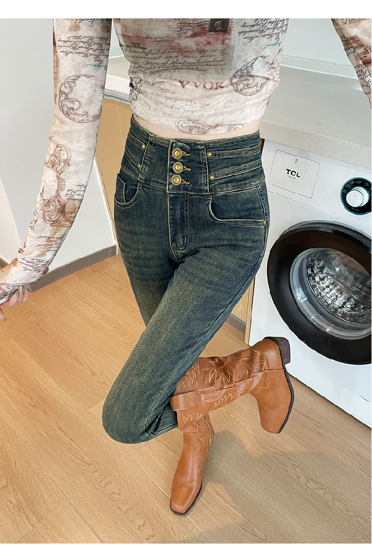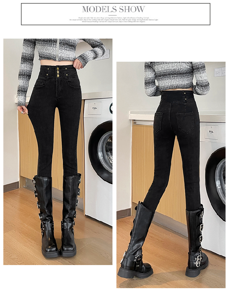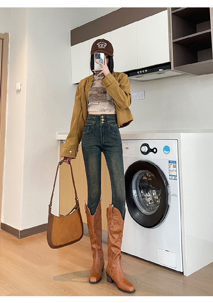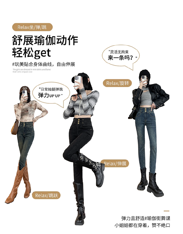 水泥灰加绒加厚小脚牛仔裤女秋冬设计感紧身显瘦弹力高腰铅笔裤子