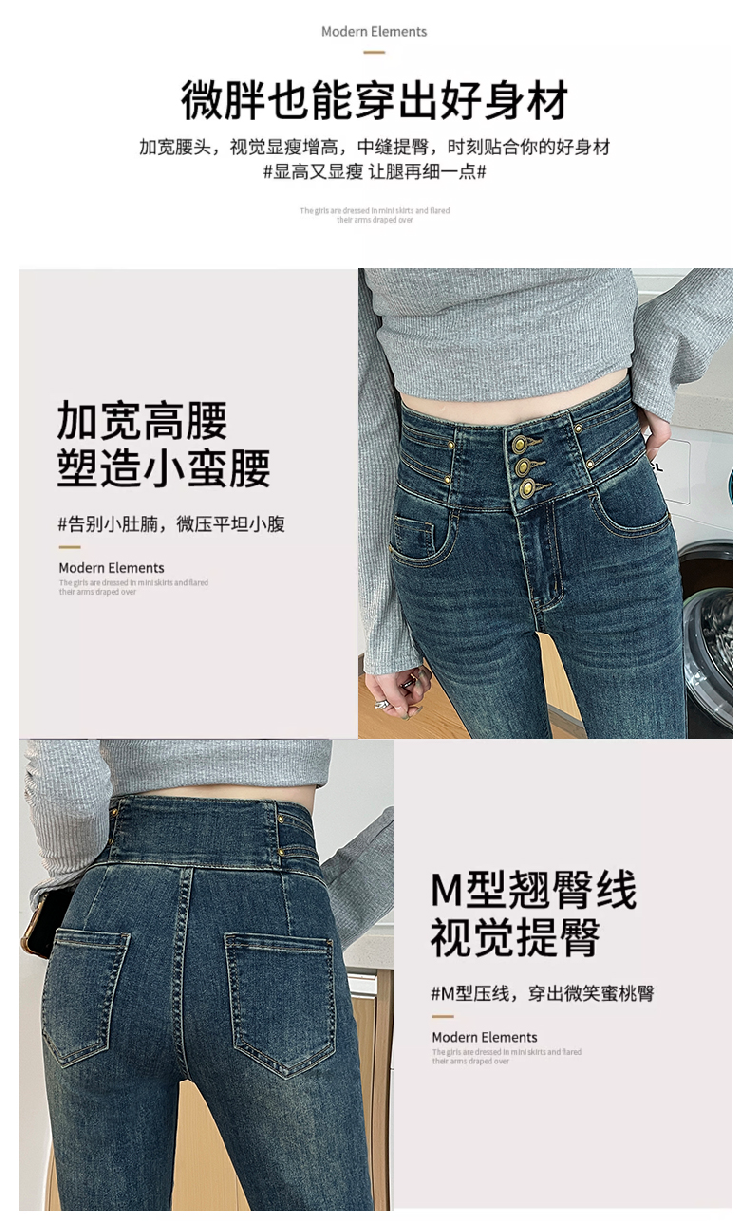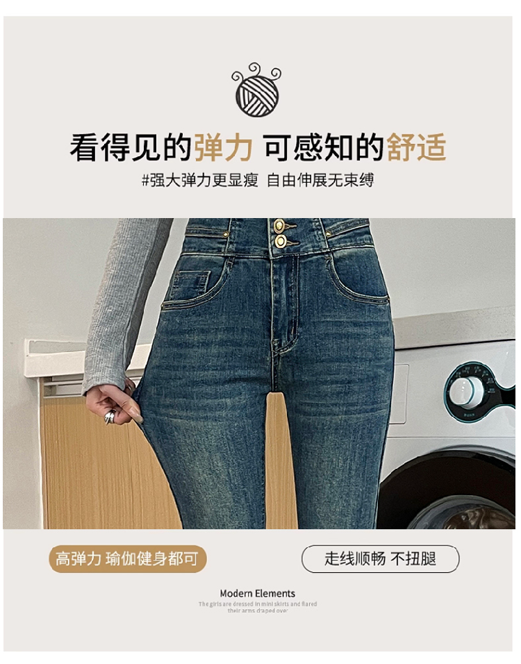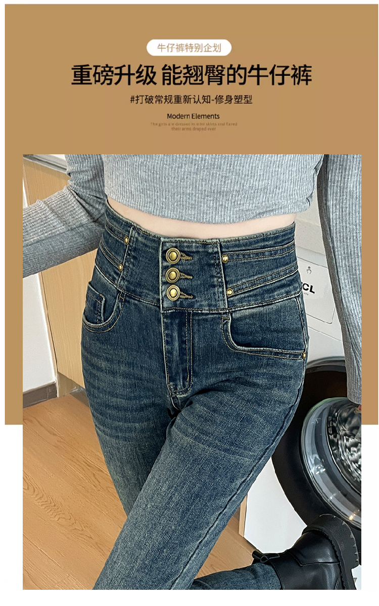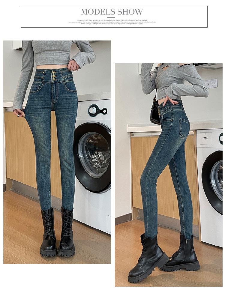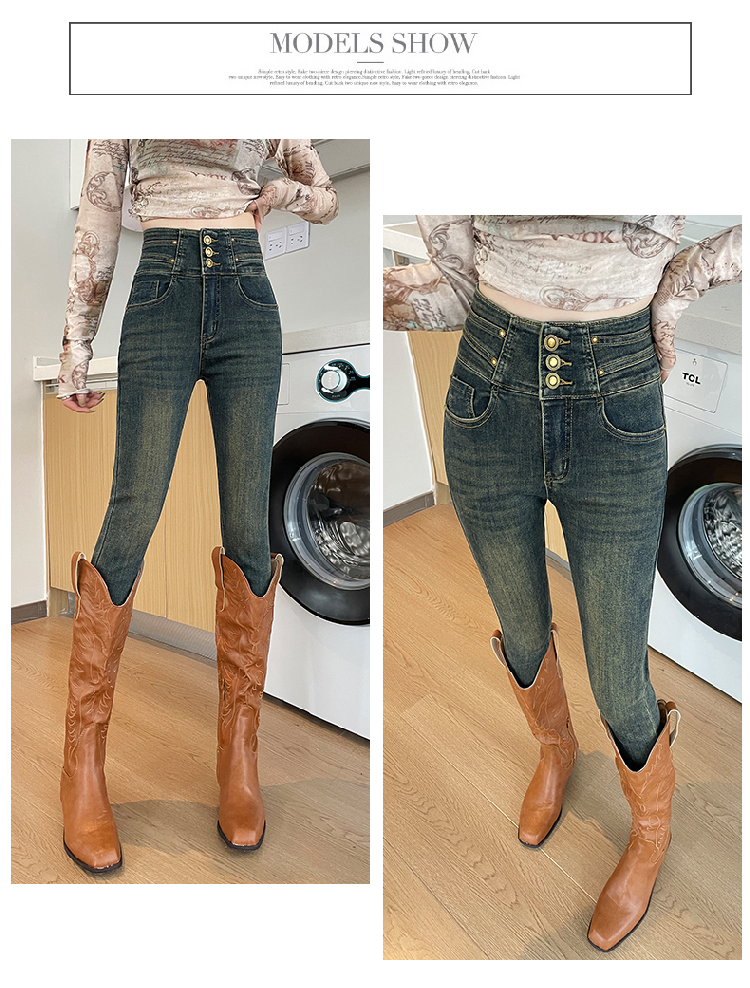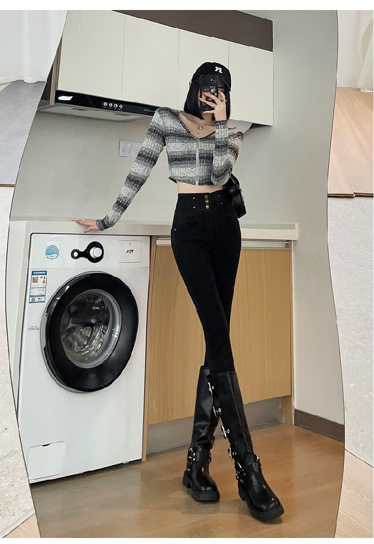 水泥灰加绒加厚小脚牛仔裤女秋冬设计感紧身显瘦弹力高腰铅笔裤子