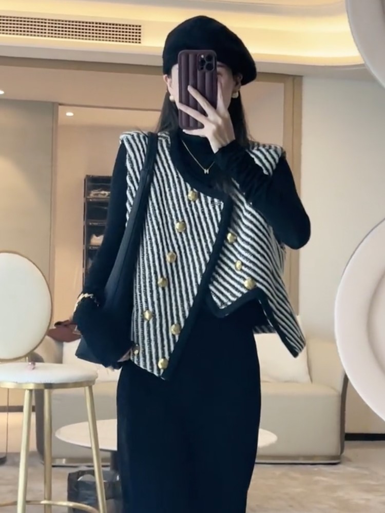 新款感2024春秋小香风不规则斜条纹马甲女设计感小众别致外套