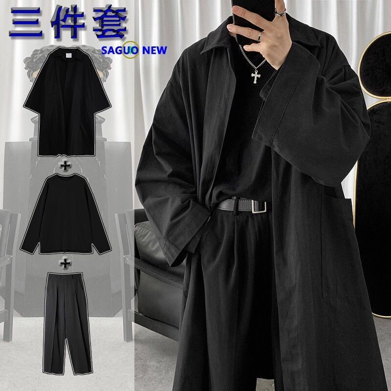 风衣男装套装男秋季潮流三件套衣服男一套韩版帅气学生外套中长款