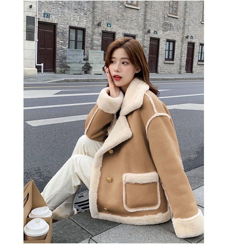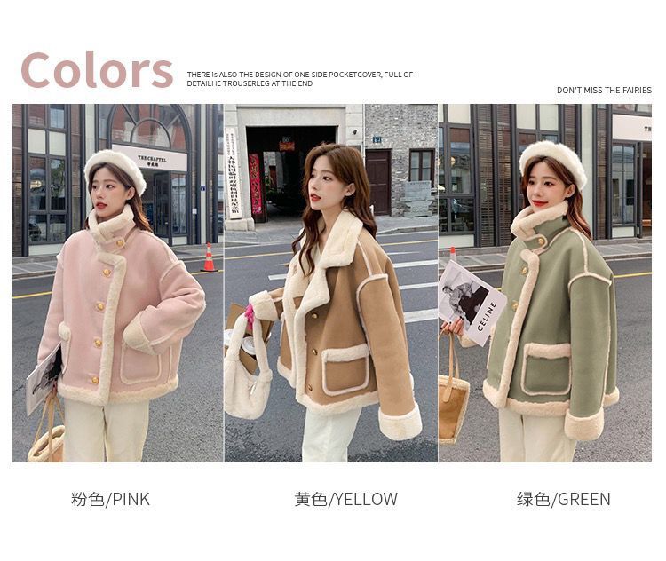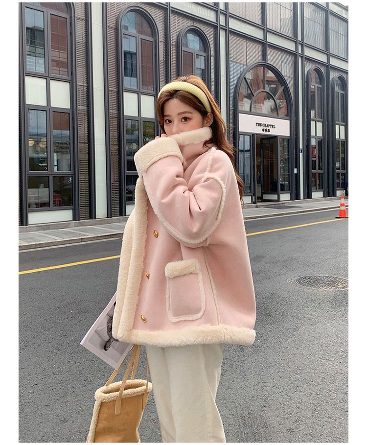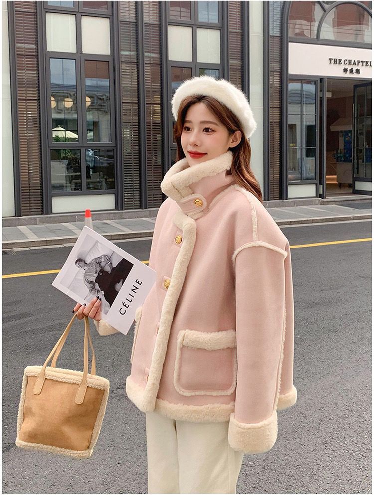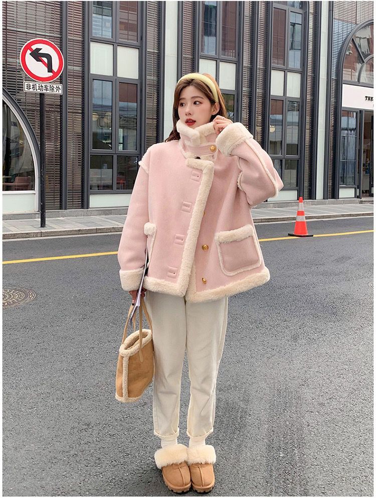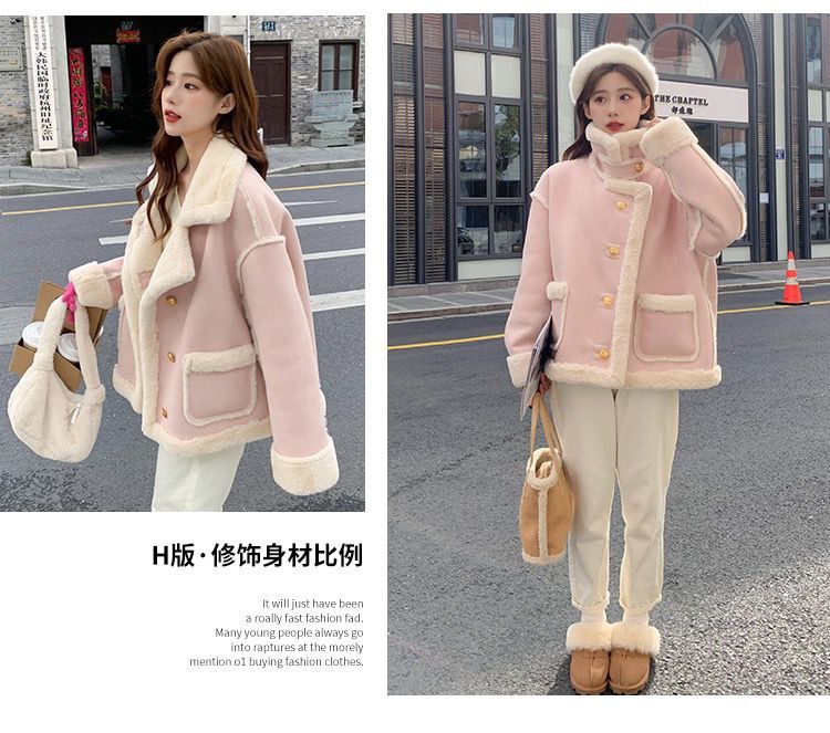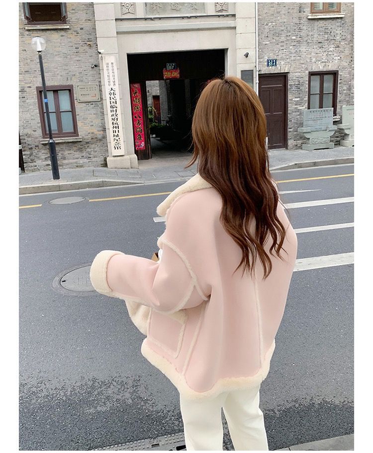 粉色皮毛一体羊羔毛外套女2024冬季新款加绒厚小香风机车服鹿皮绒