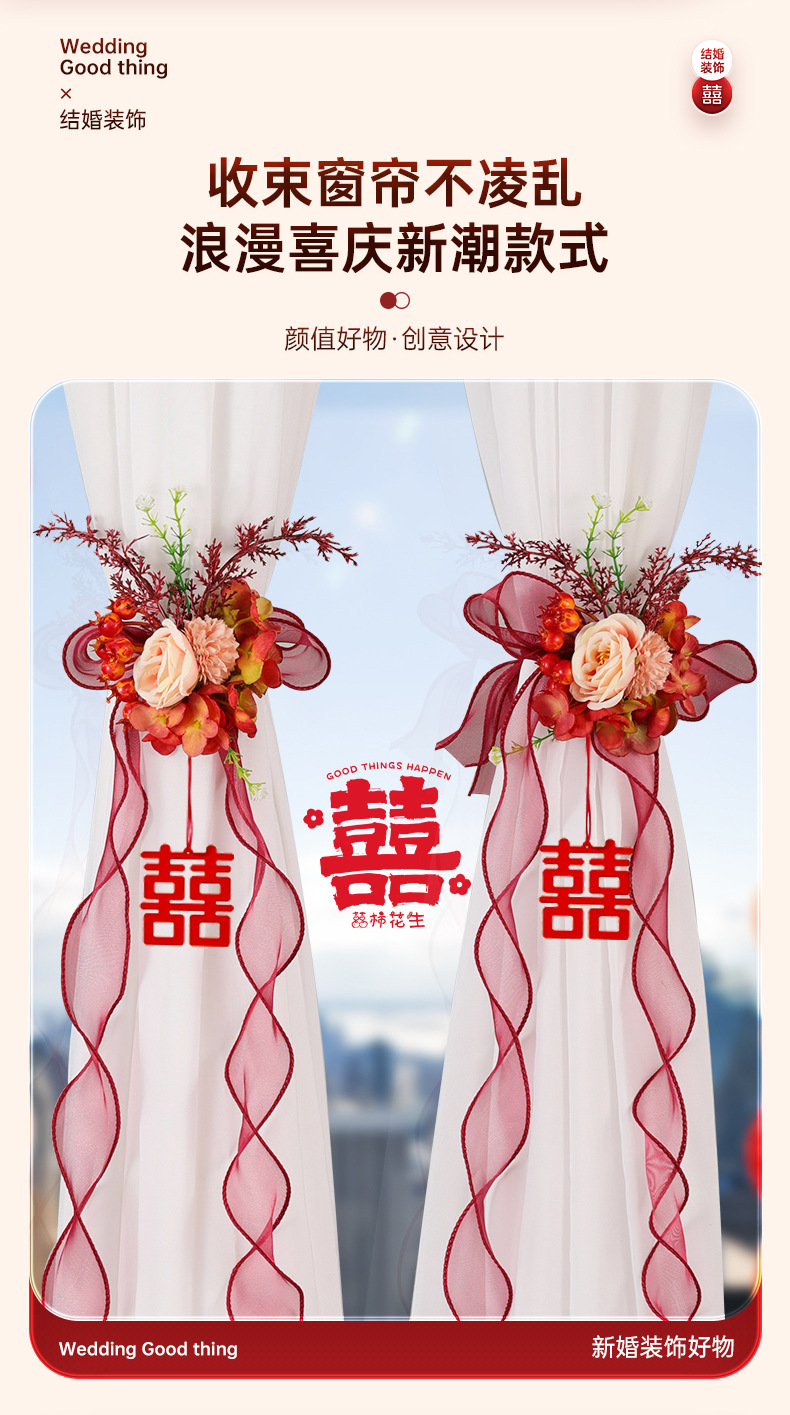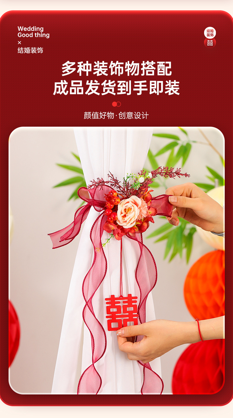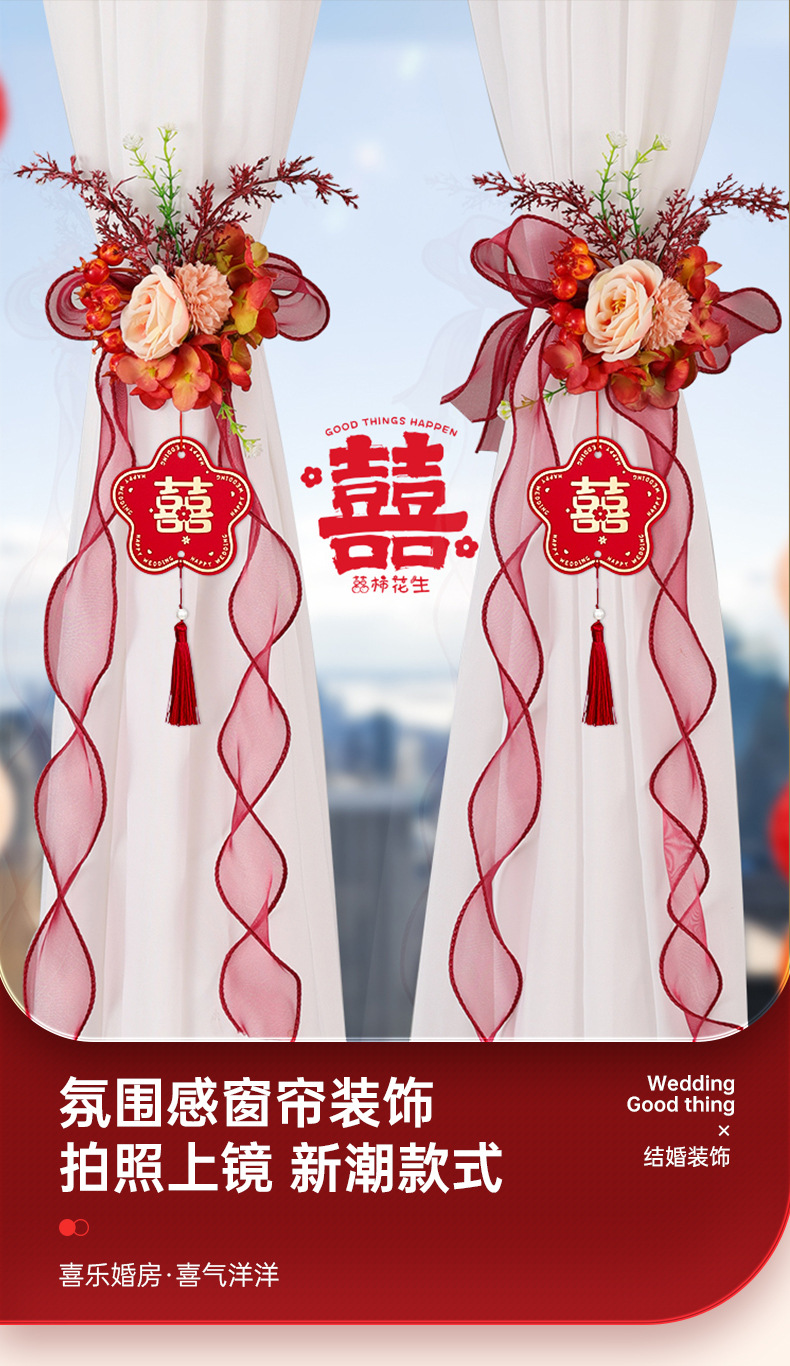 窗帘装饰结婚女方婚礼新房客厅房间喜字绑带拉花挂饰婚房布置套装