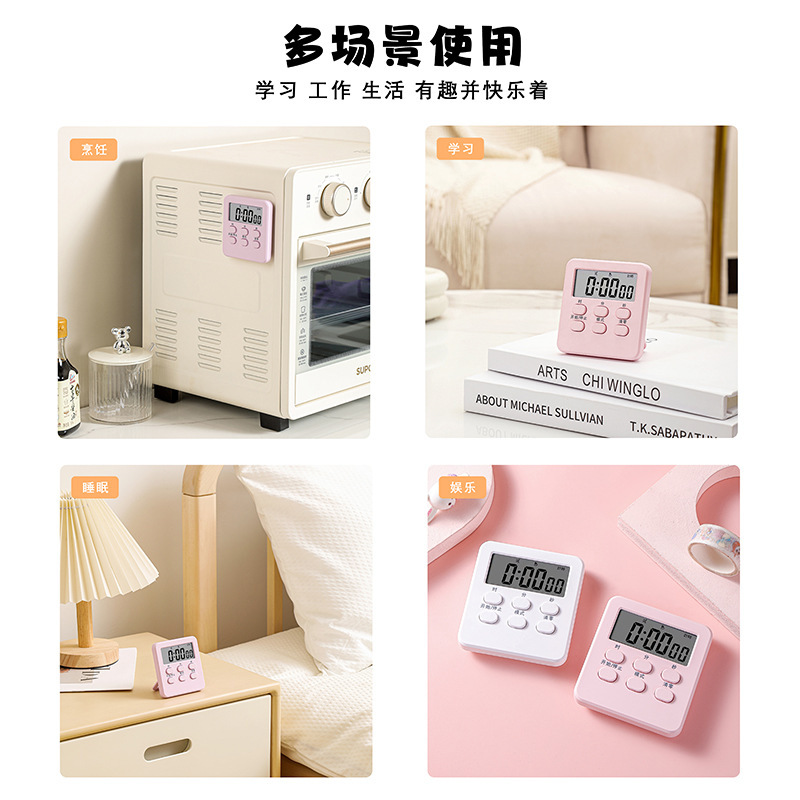 功能:24小时计时功能、正计时、倒计时、两组闹铃功能、时钟功能、磁力吸附、脚架支撑、归零设置、可静音、LCD显示屏
