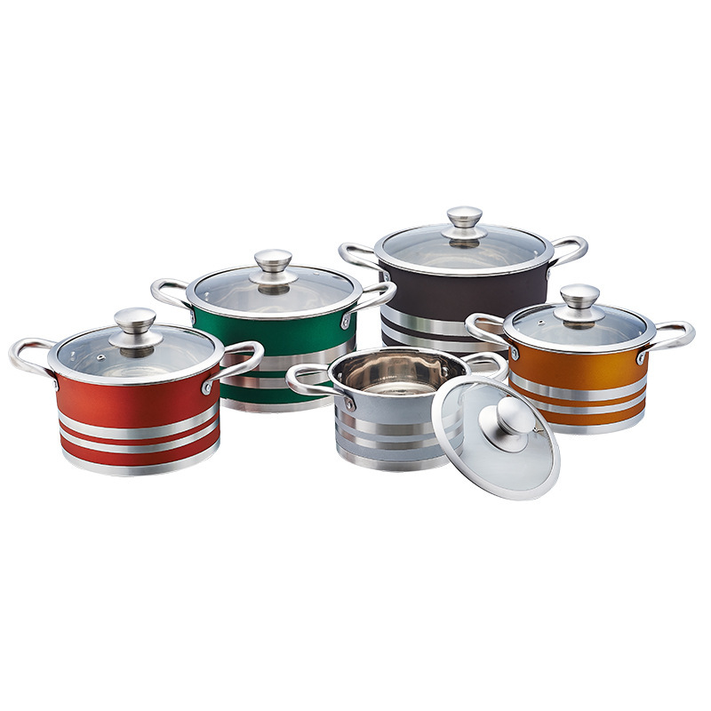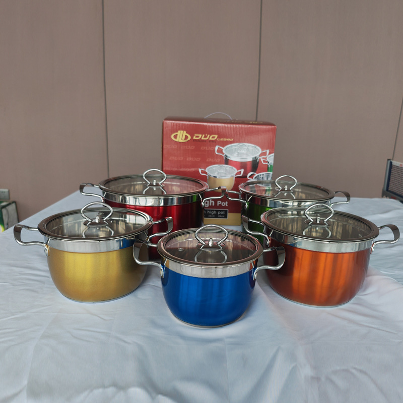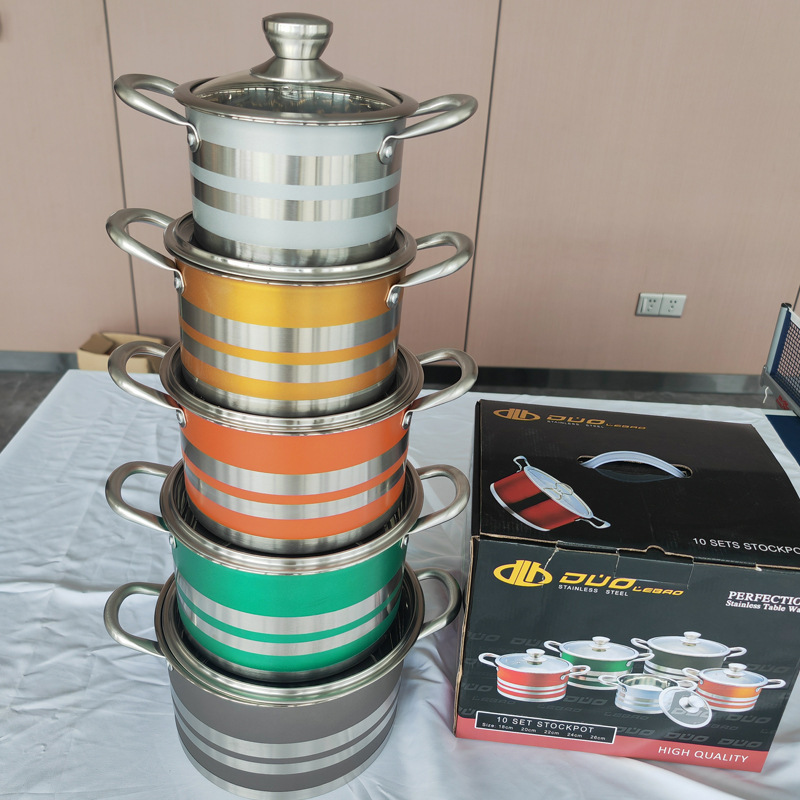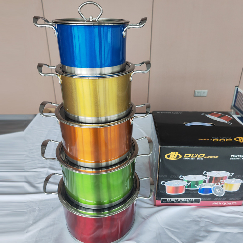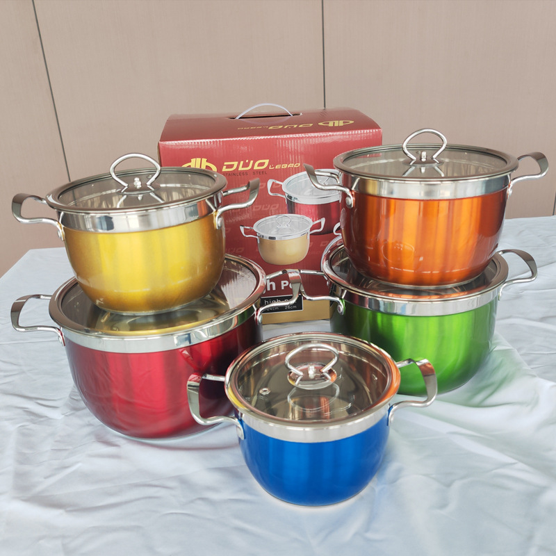 潮州互发跨境彩色不锈钢套装锅批发十件套礼品锅具双耳复底高汤锅