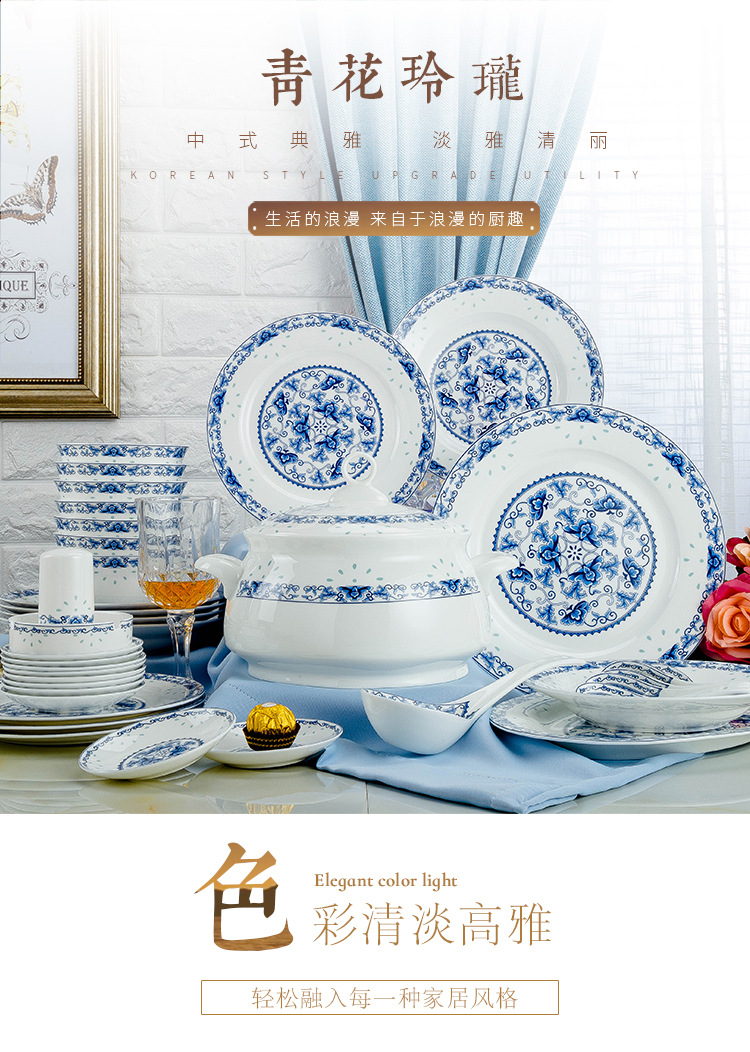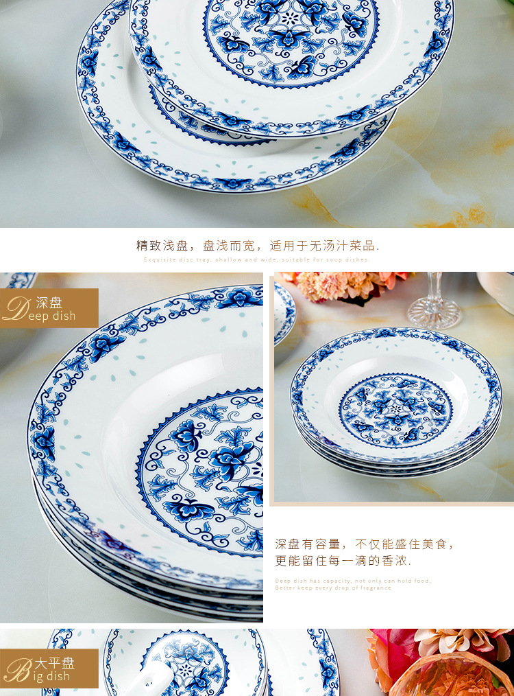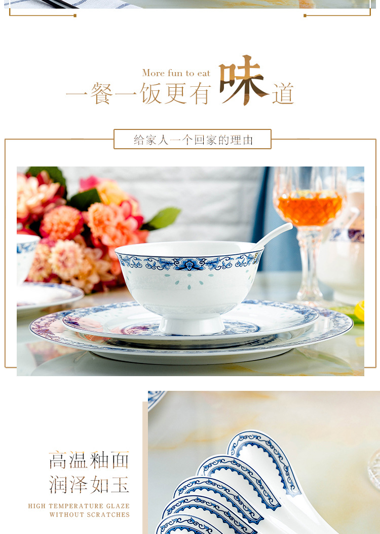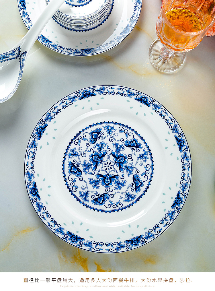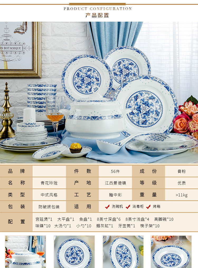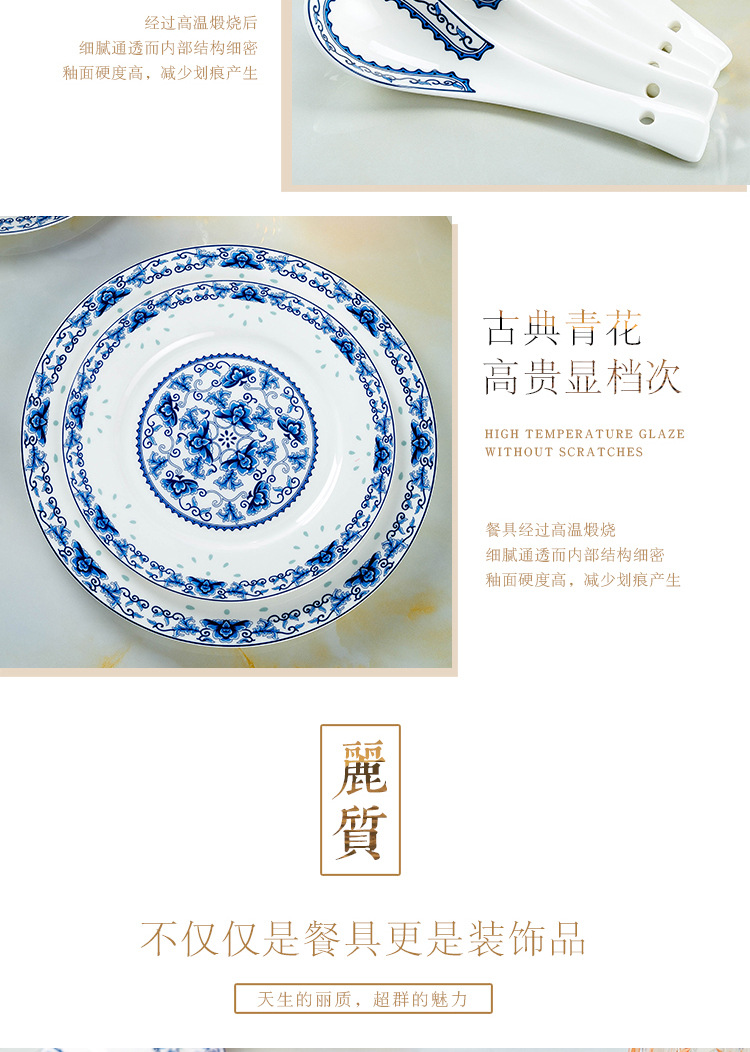 景德镇高温青花釉 高温陶瓷玲珑餐具 收藏送礼碗碟盘骨瓷餐具套装