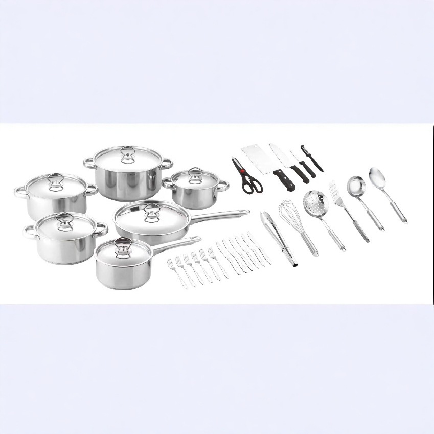 潮州互发出口不锈钢锅具加厚钢盖复底炊具35件套平底锅奶锅