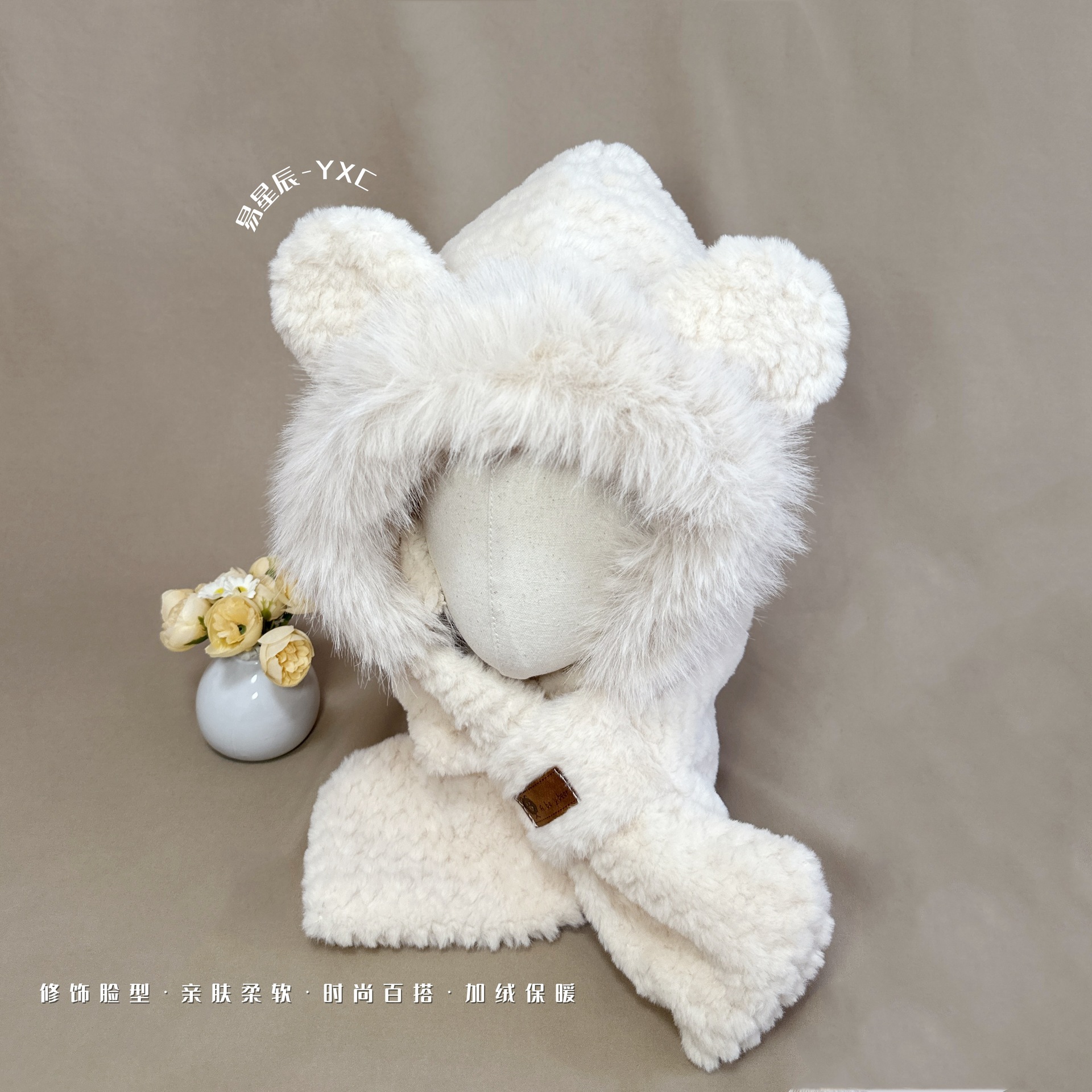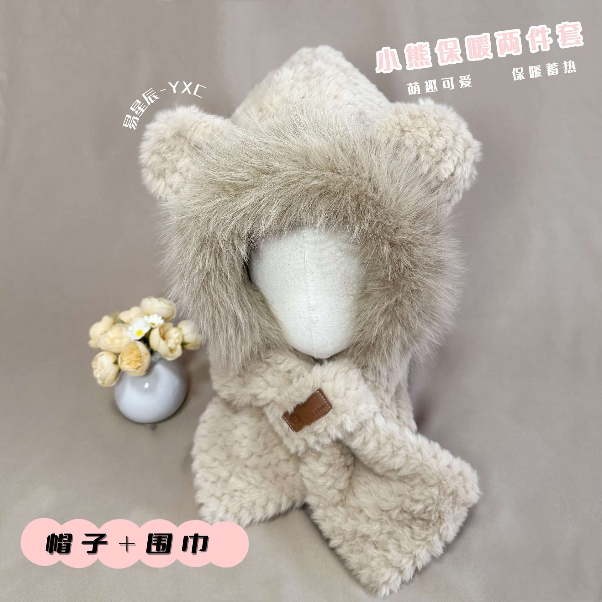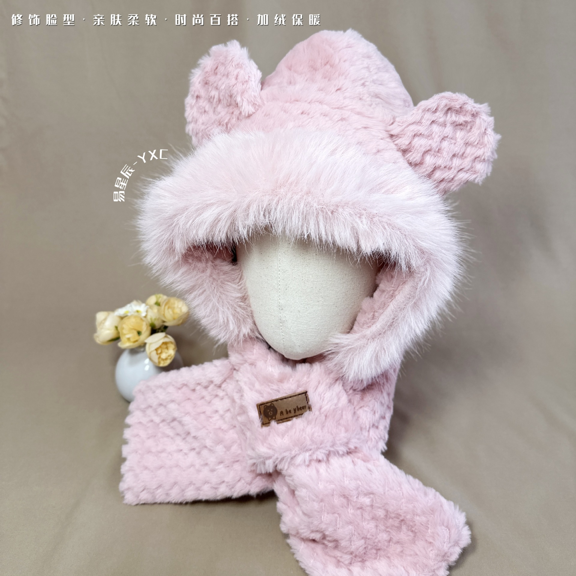 小熊帽子围巾一体毛绒帽女秋冬季骑行保暖护耳套头帽两件套雷锋帽