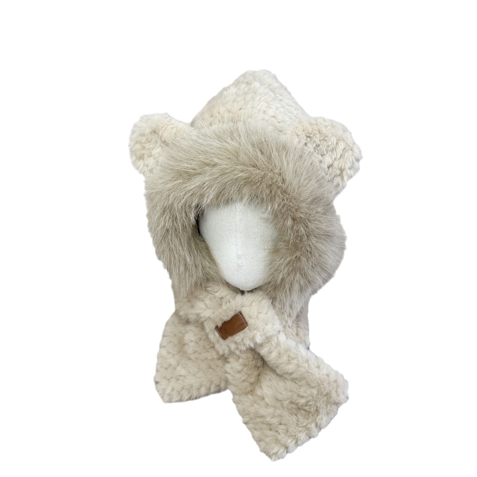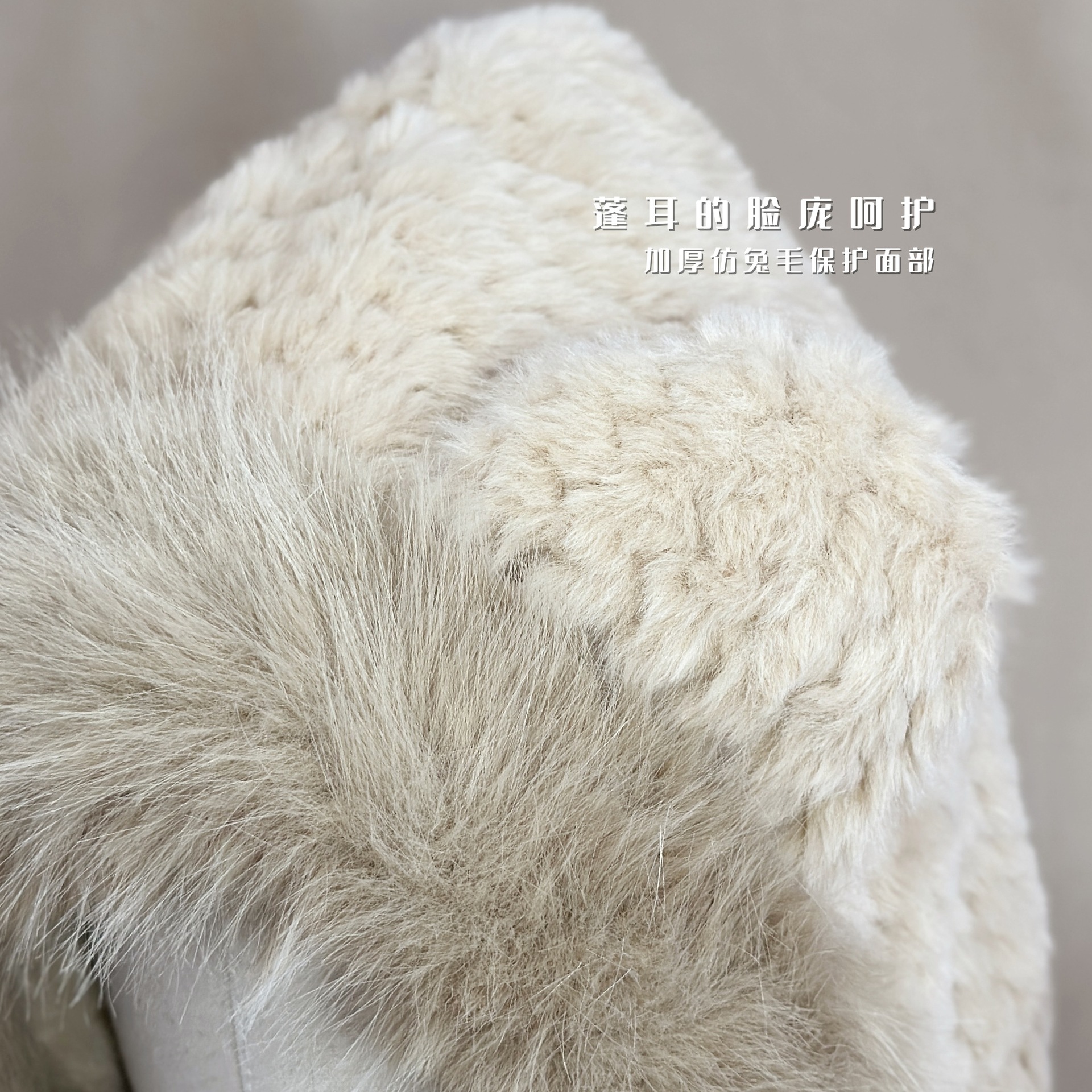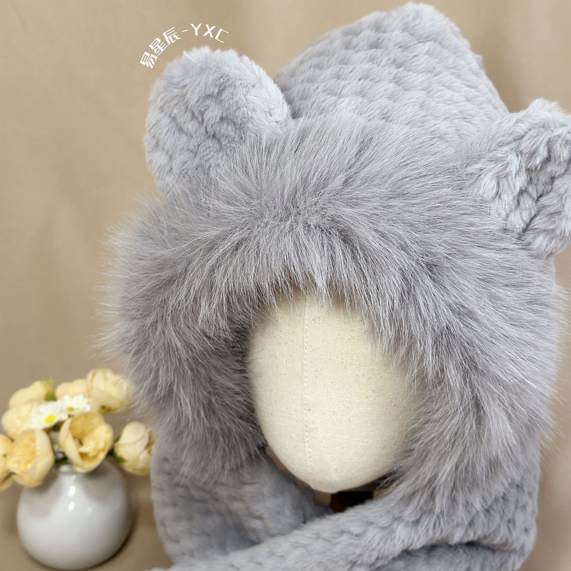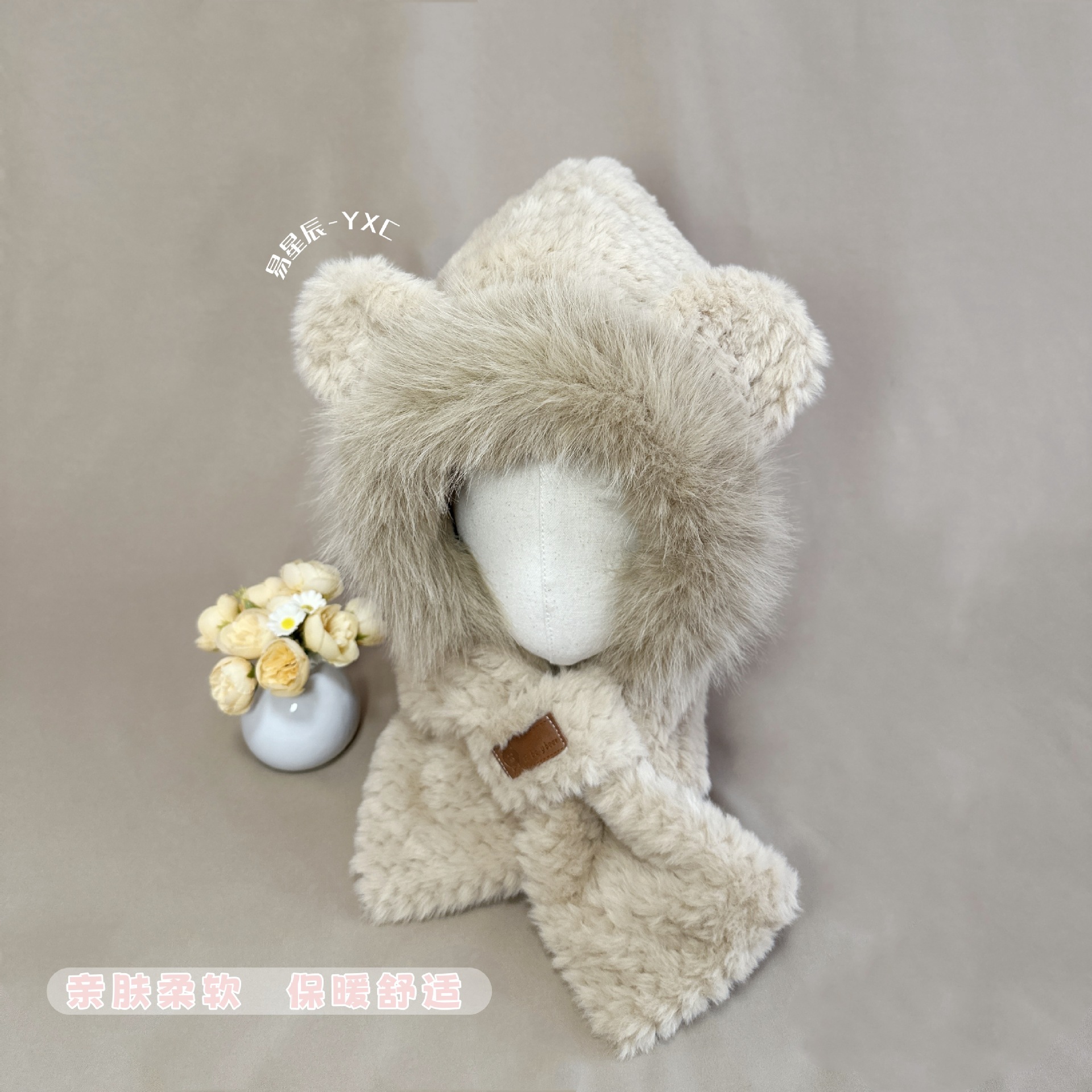 小熊帽子围巾一体毛绒帽女秋冬季骑行保暖护耳套头帽两件套雷锋帽