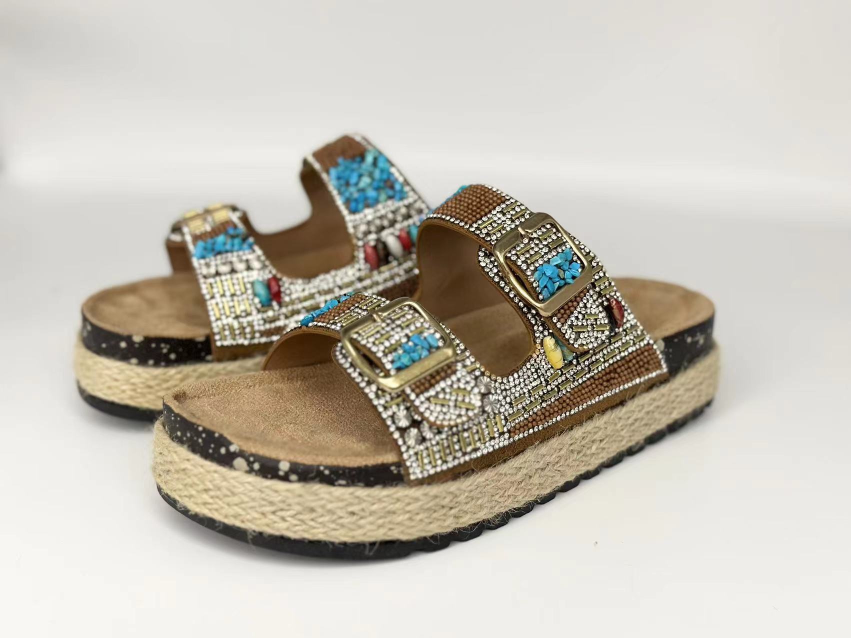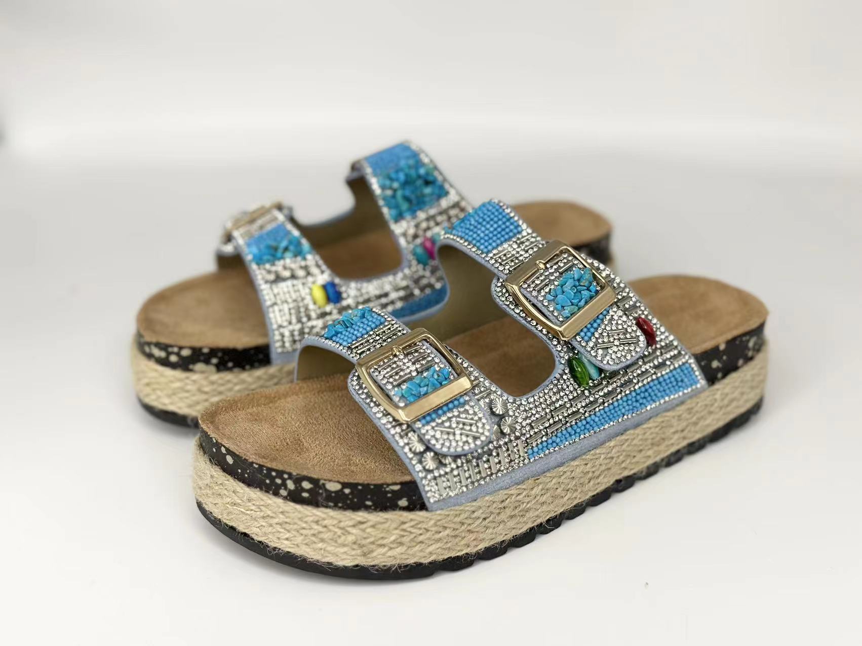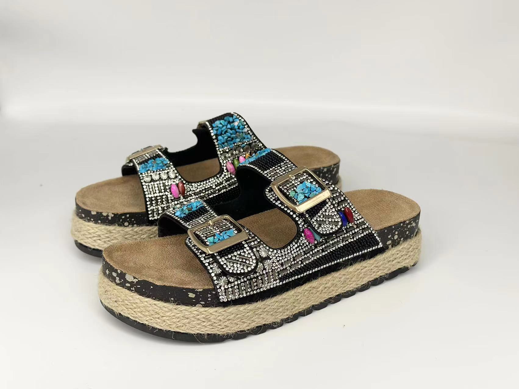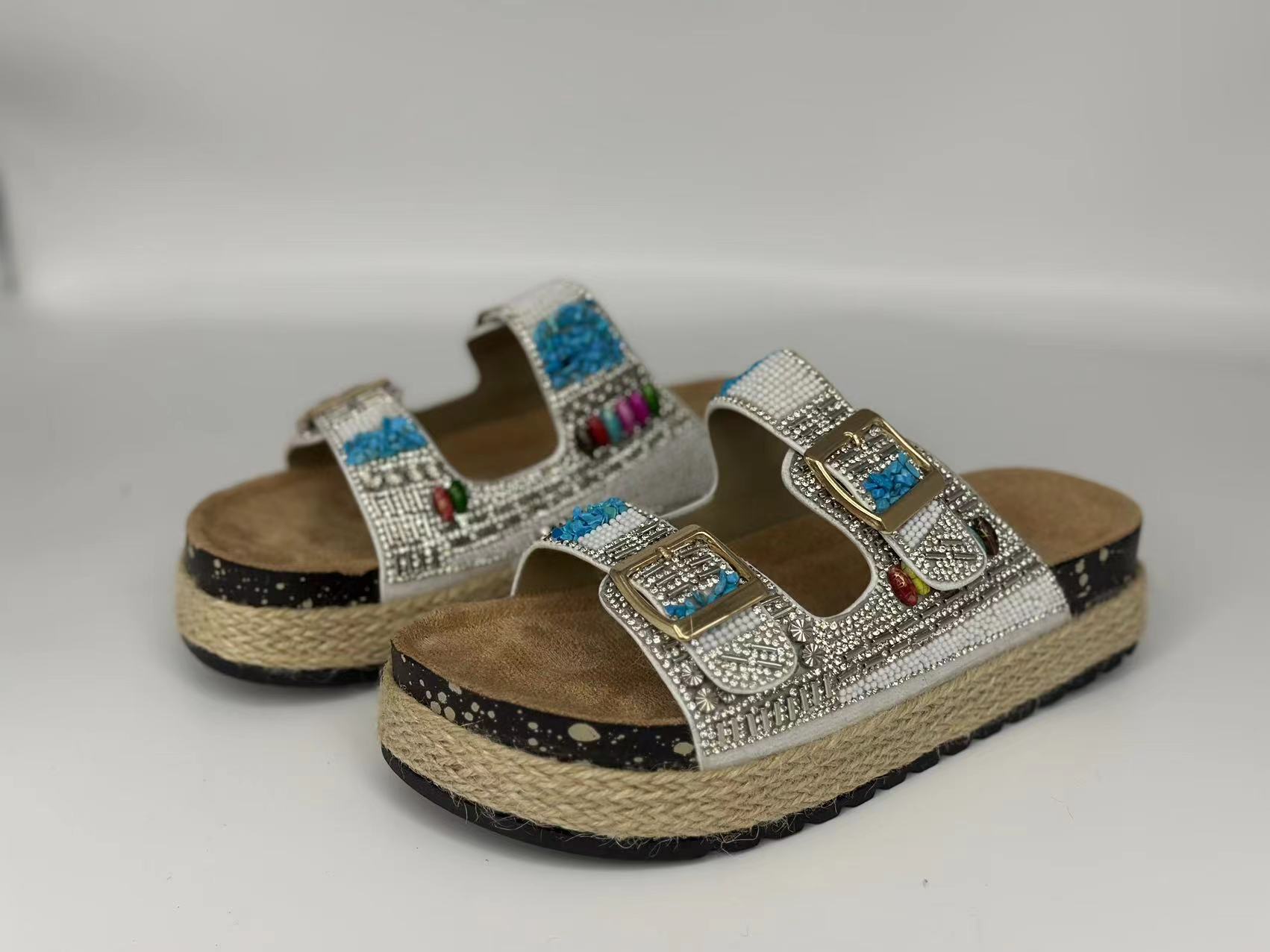 新款跨境外贸大码时尚双扣围麻绳钻面拖鞋厚底坡跟拖鞋松糕鞋