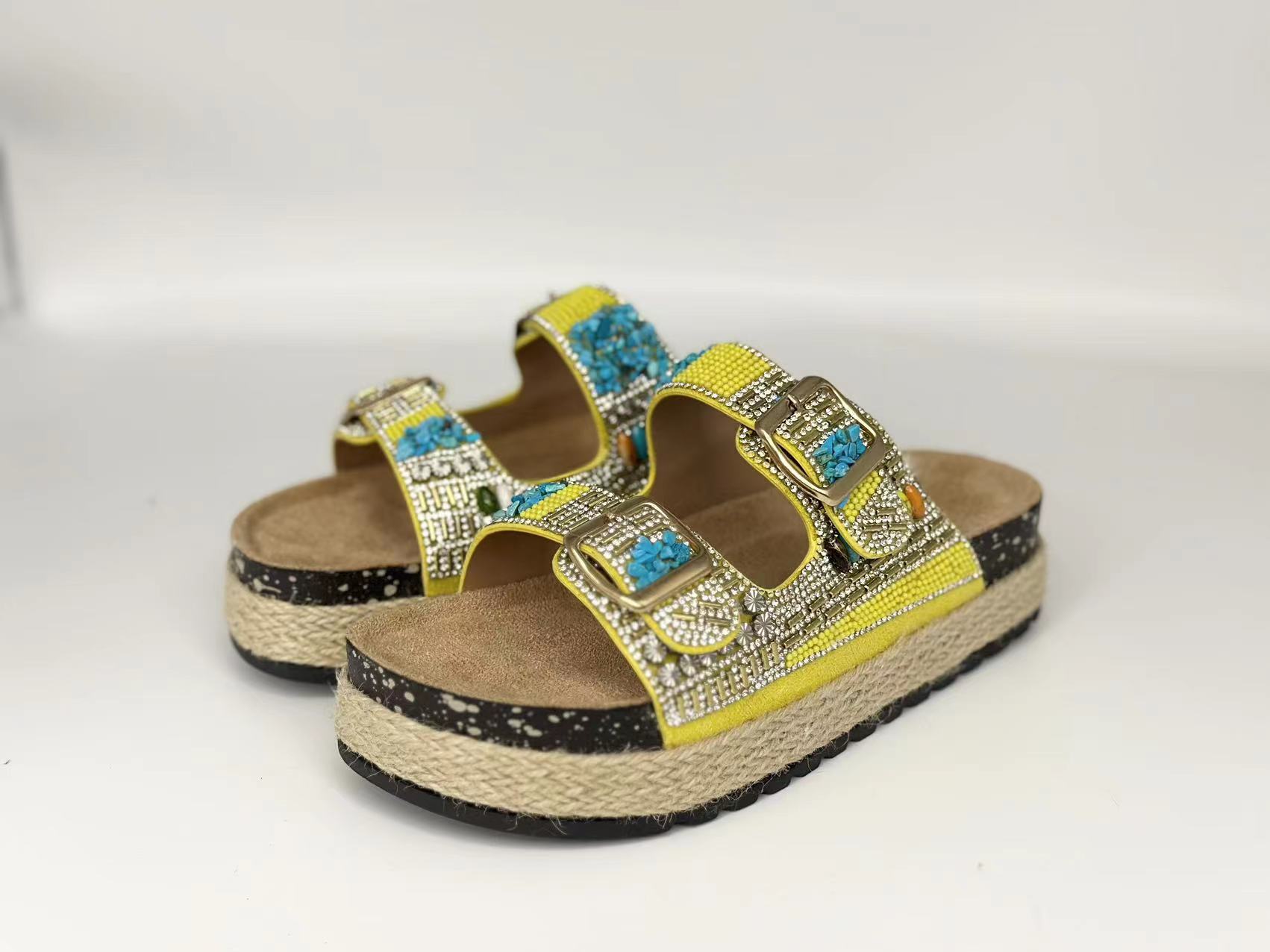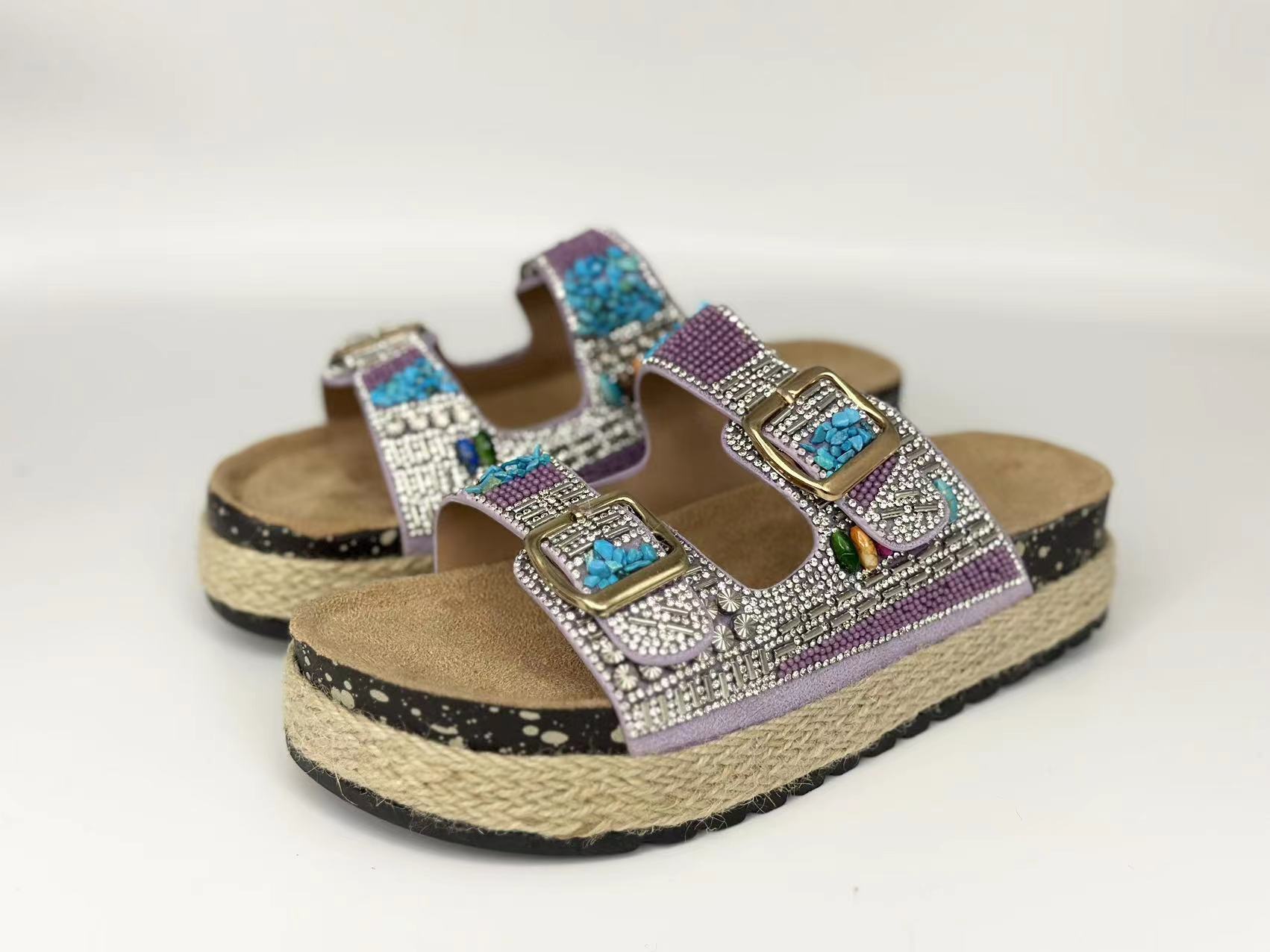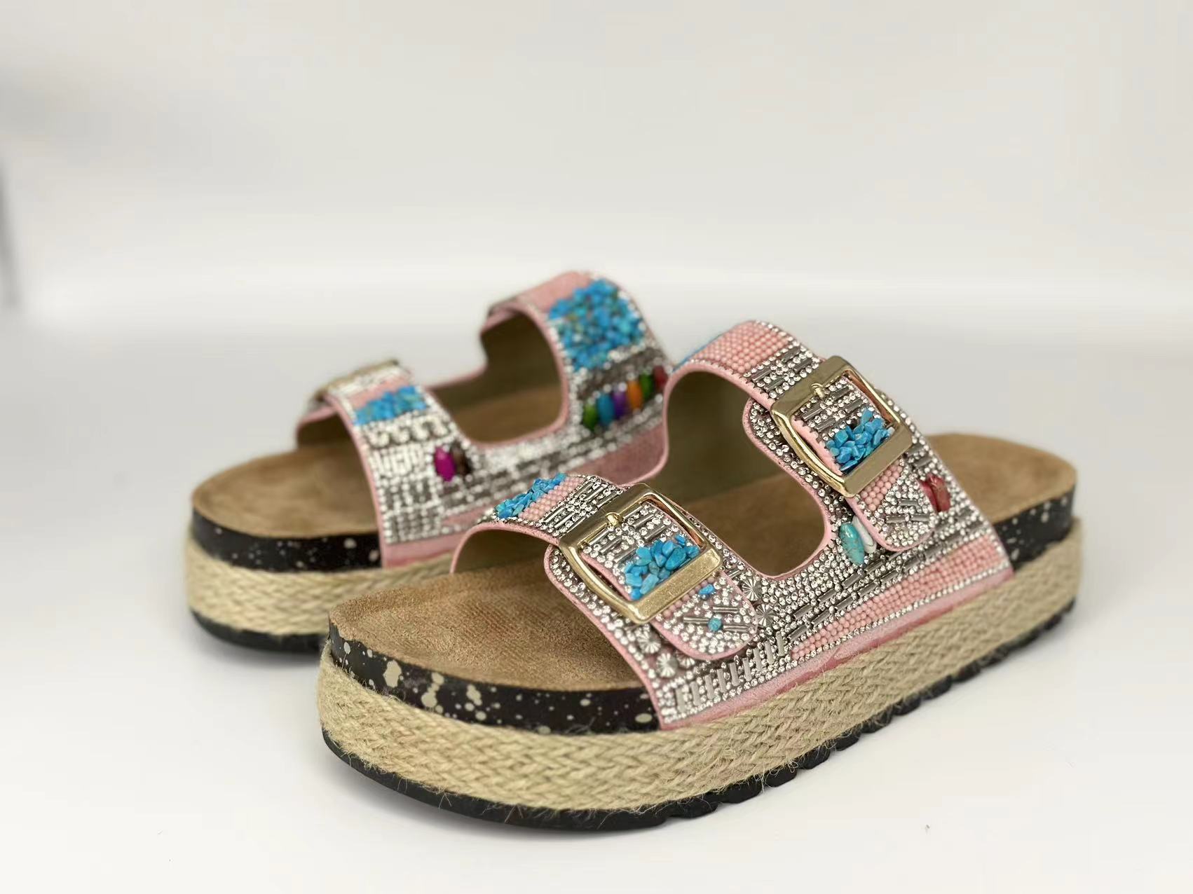 新款跨境外贸大码时尚双扣围麻绳钻面拖鞋厚底坡跟拖鞋松糕鞋