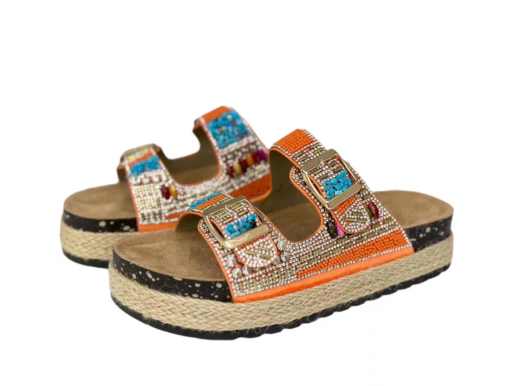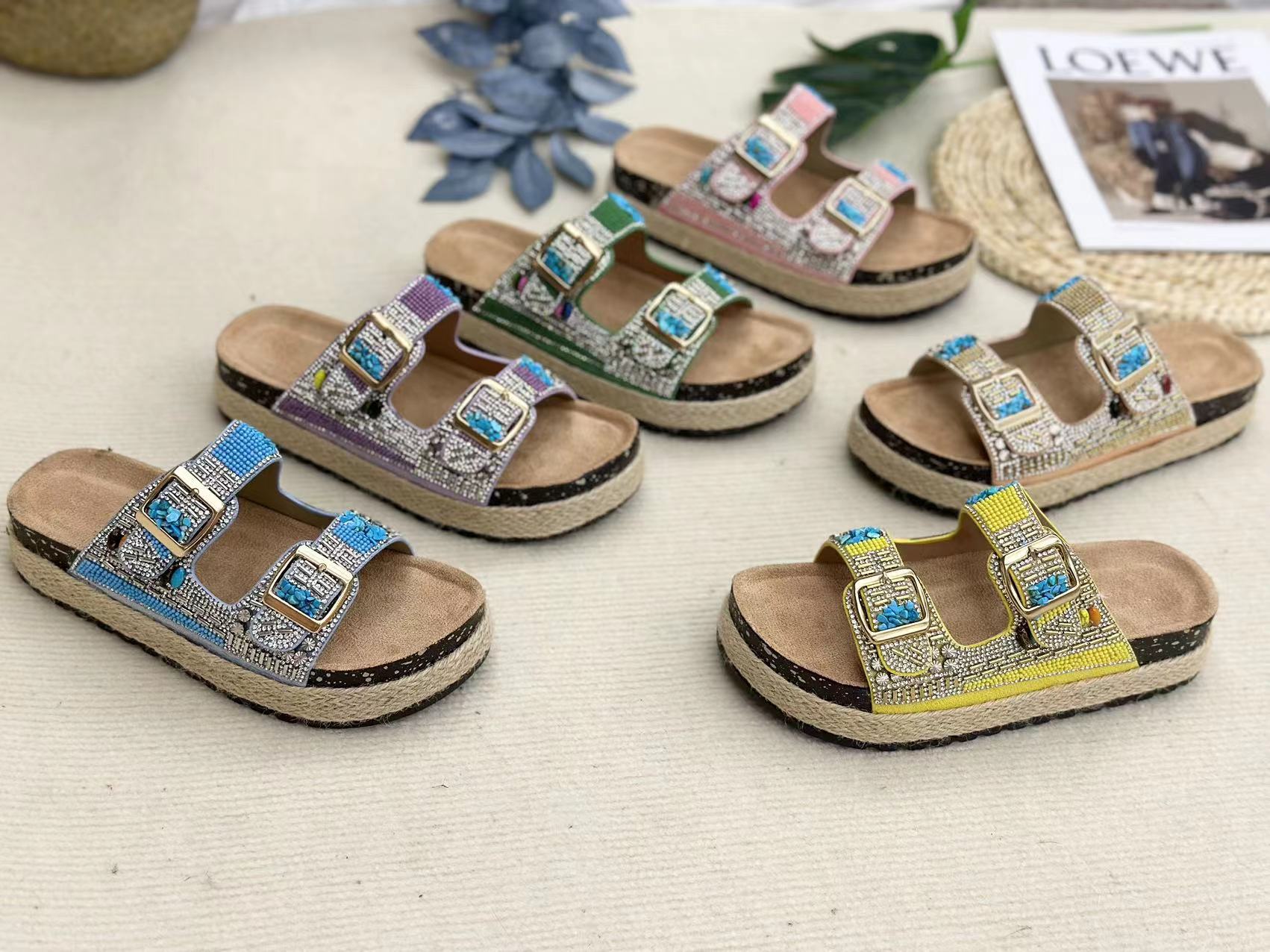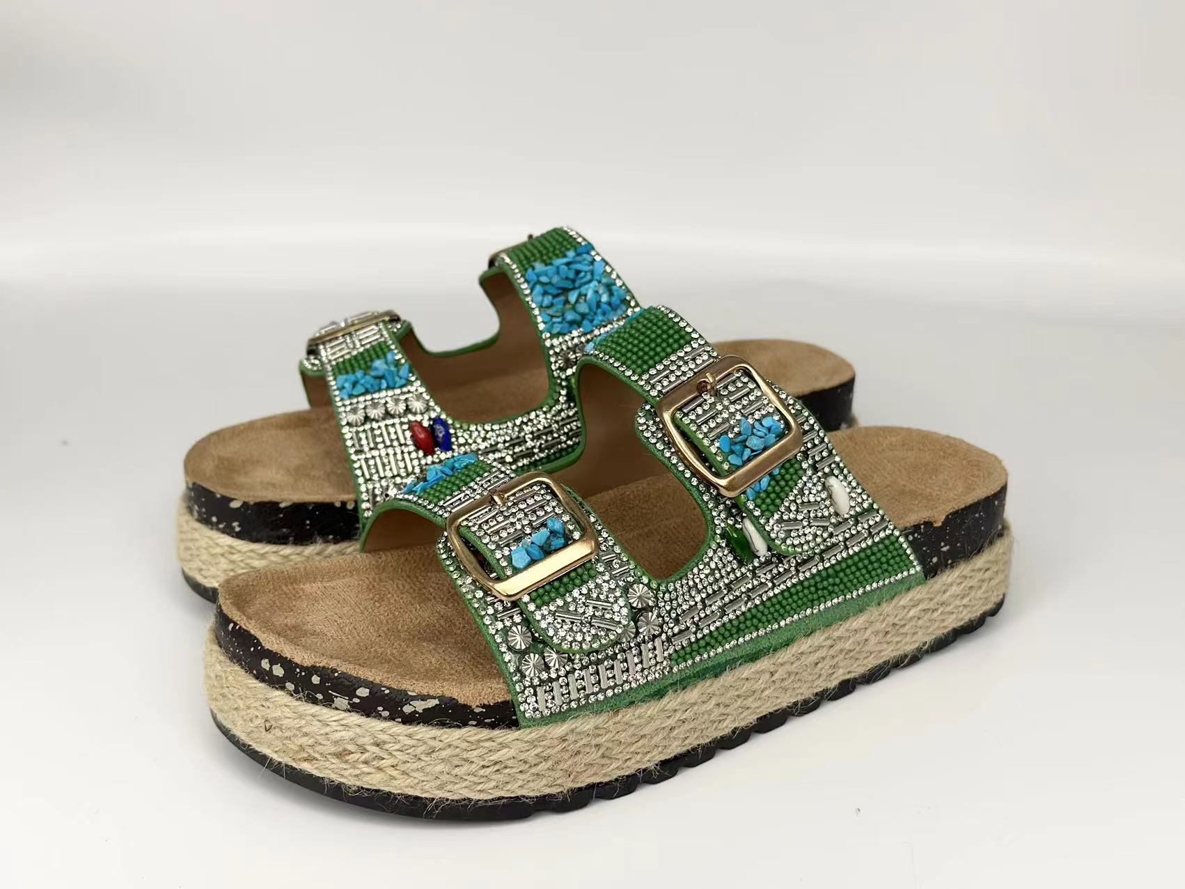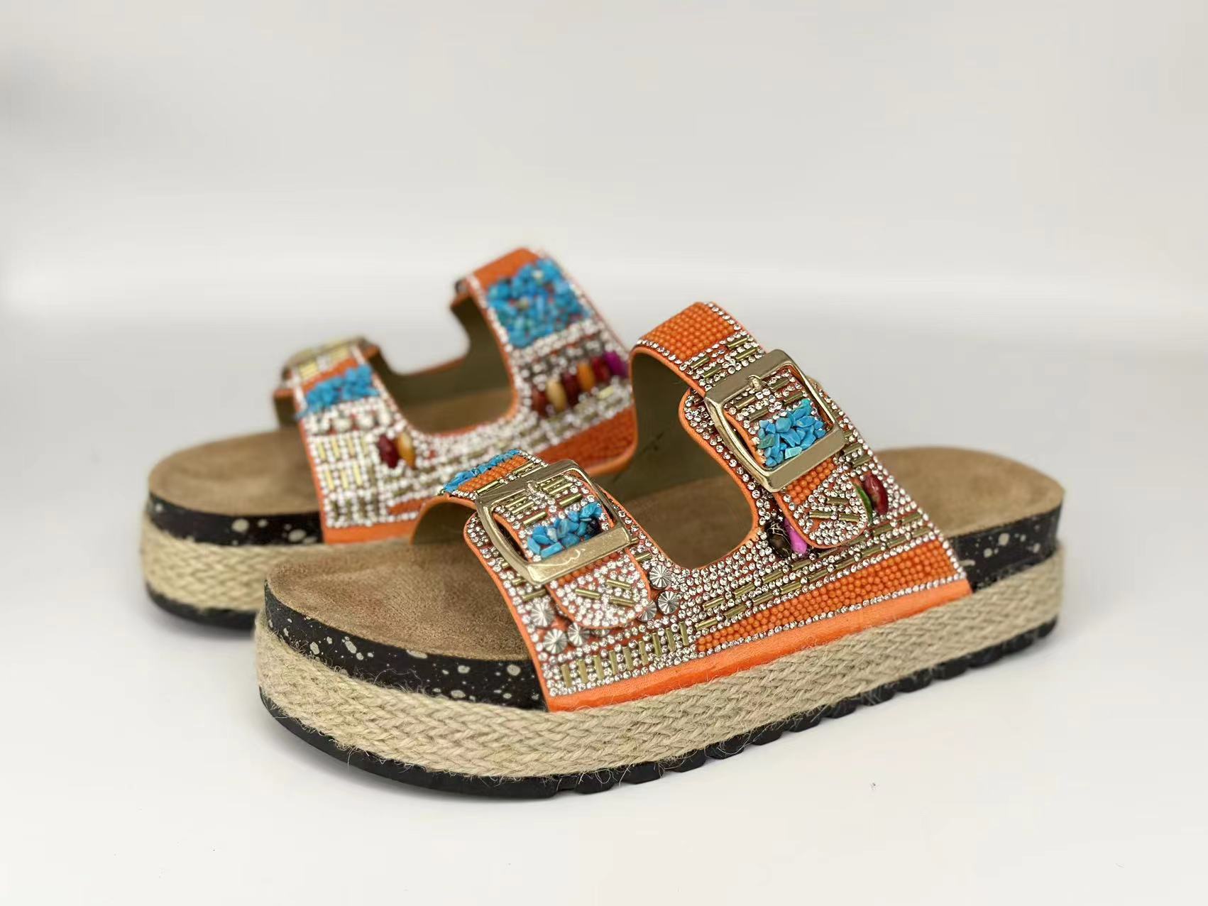 新款跨境外贸大码时尚双扣围麻绳钻面拖鞋厚底坡跟拖鞋松糕鞋
