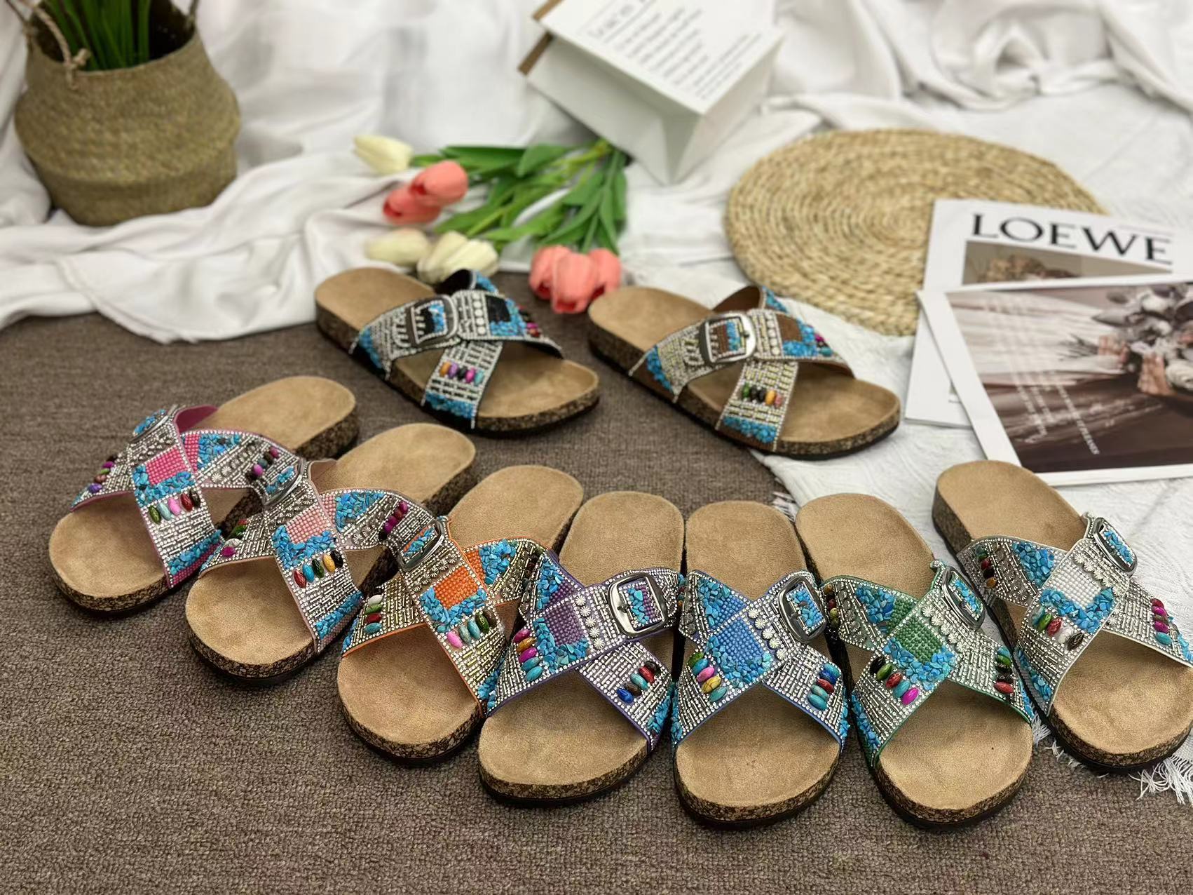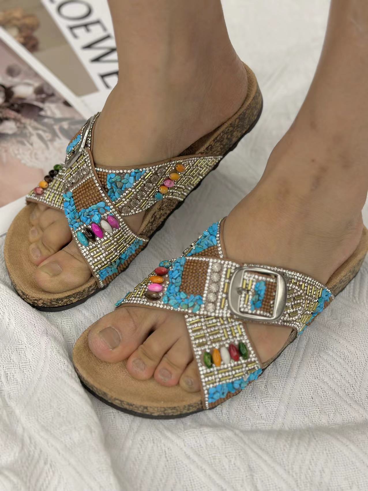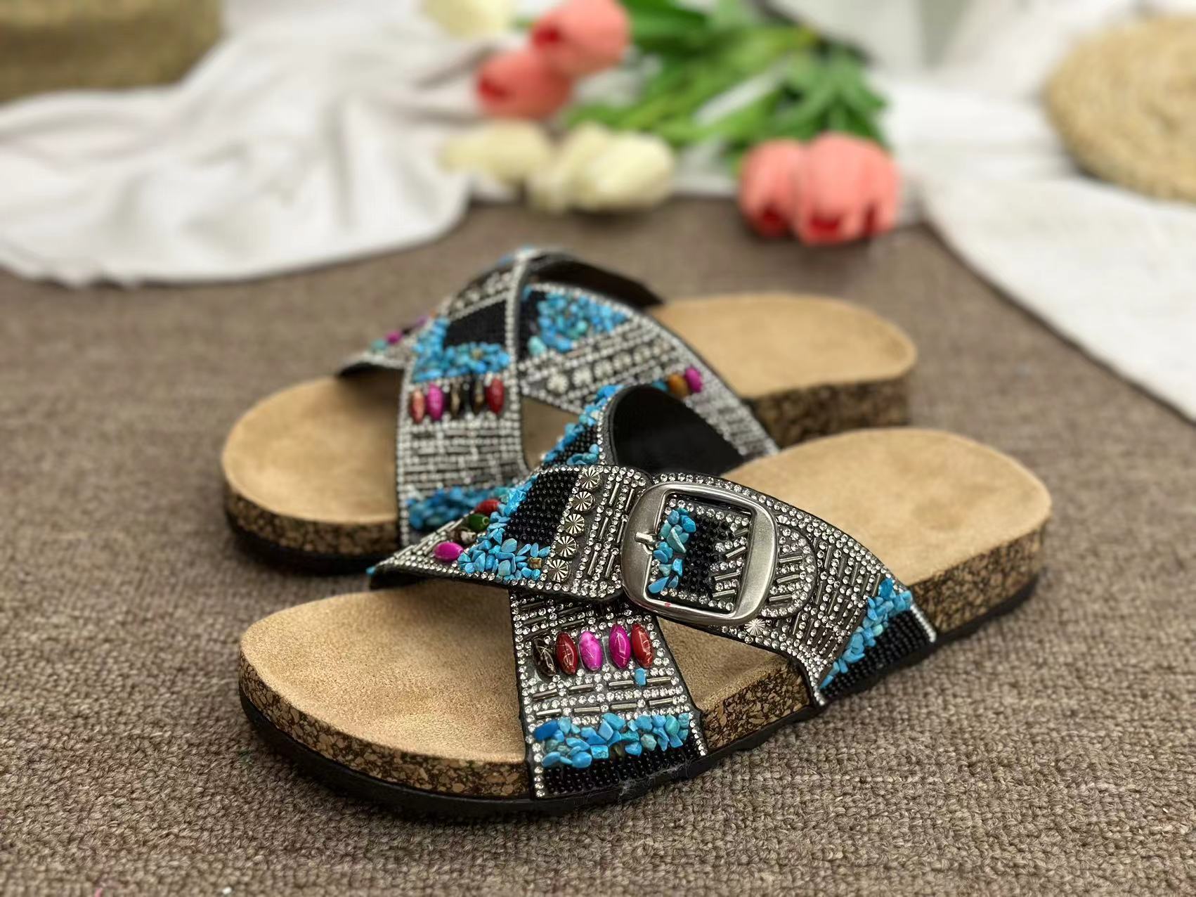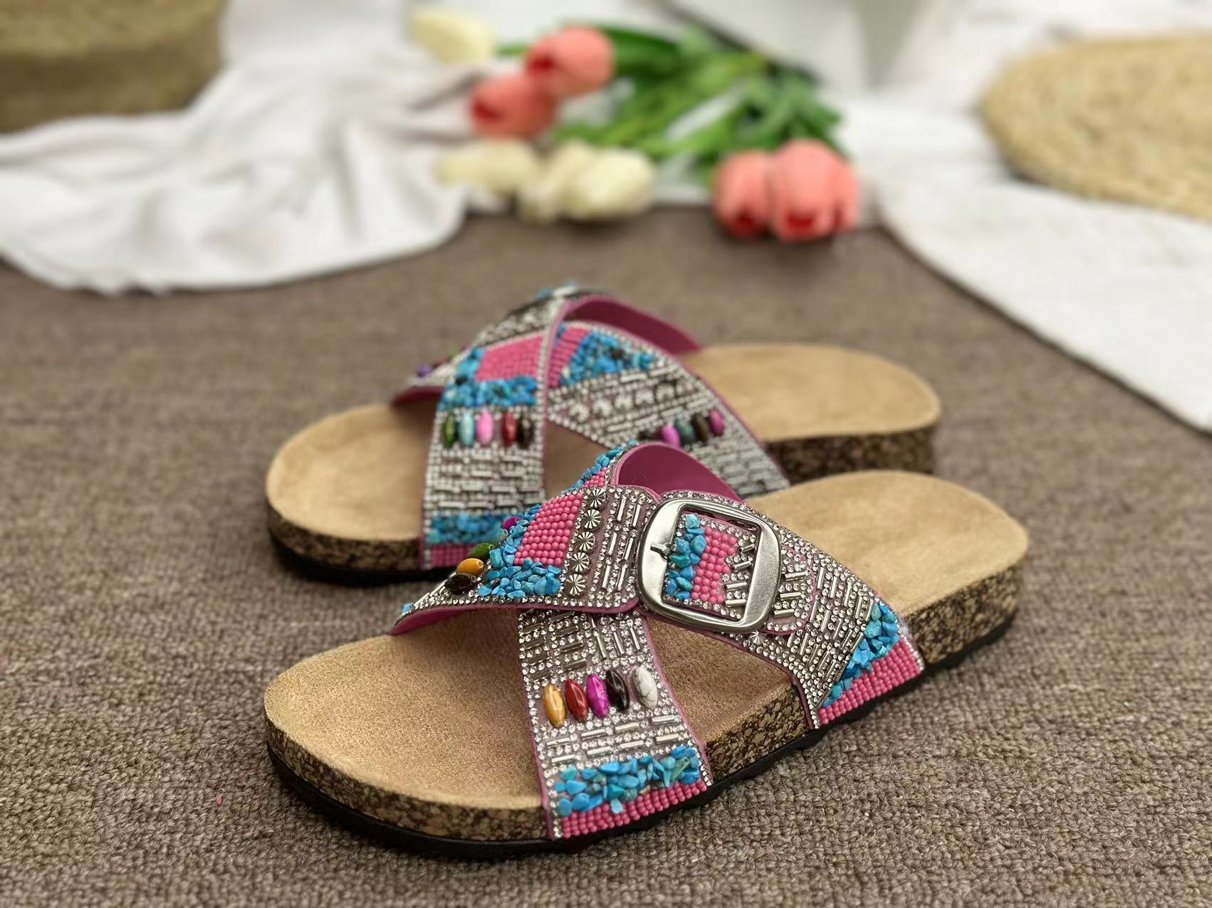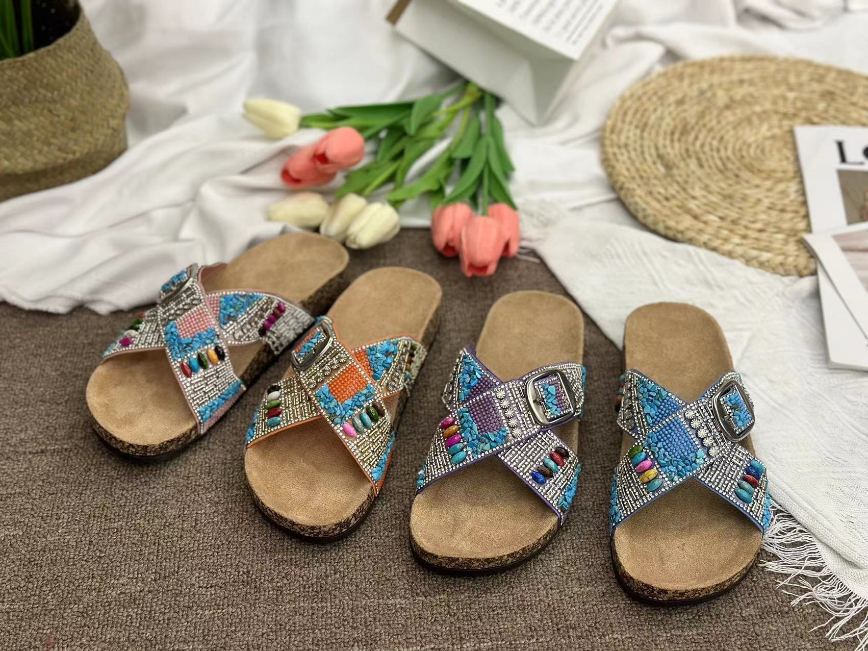 欧美跨境外贸新款钻面交叉一扣沙滩软木拖鞋外穿大码平底拖鞋