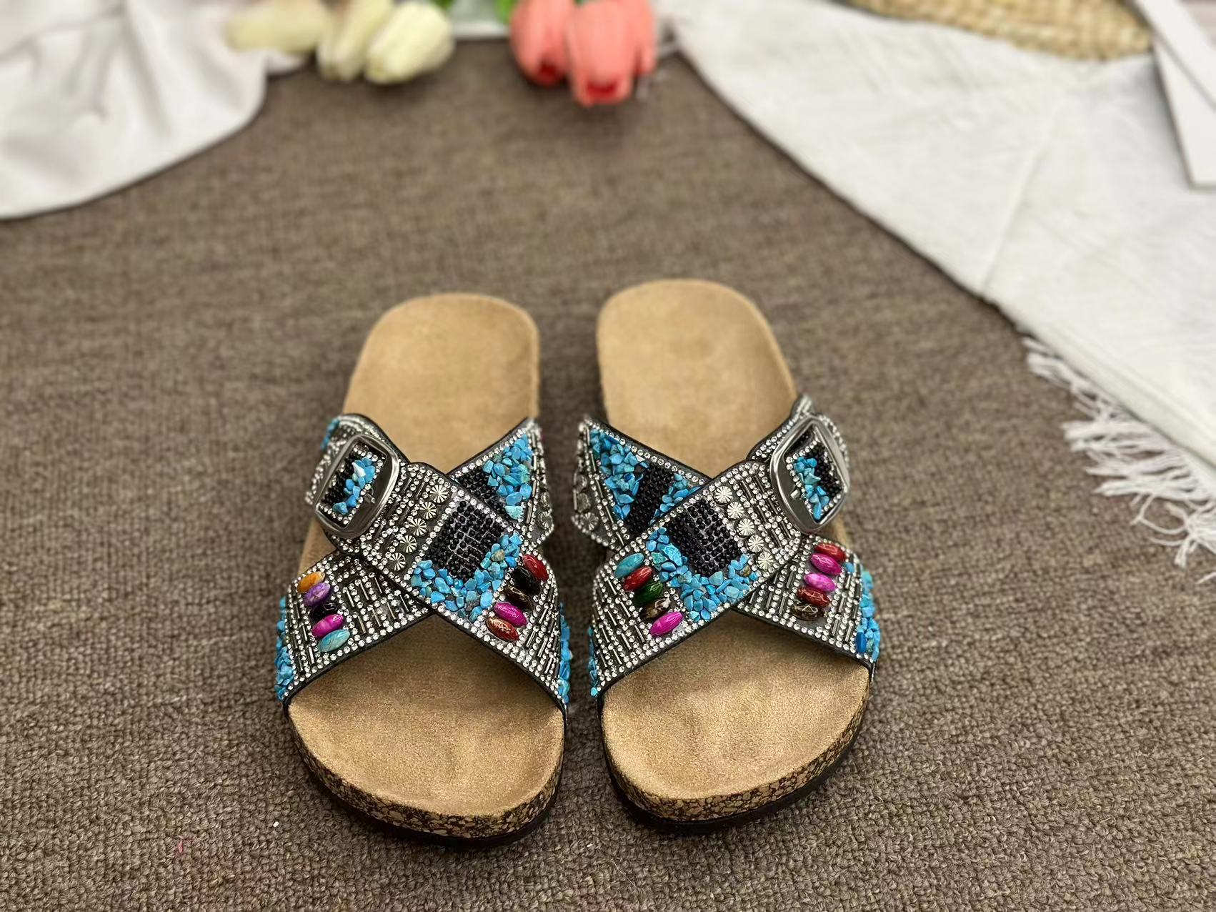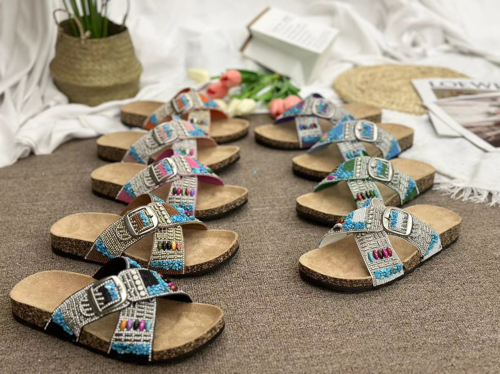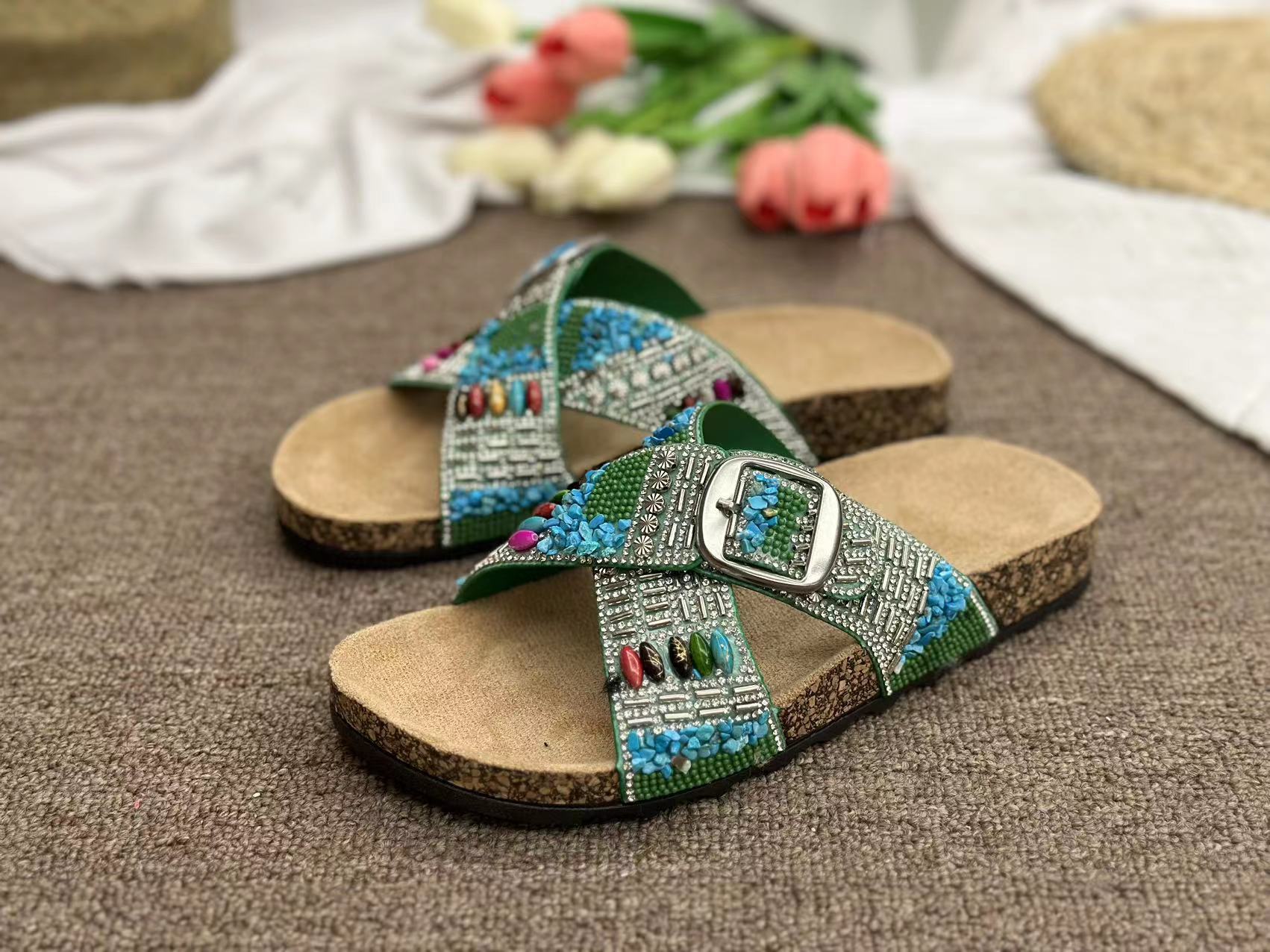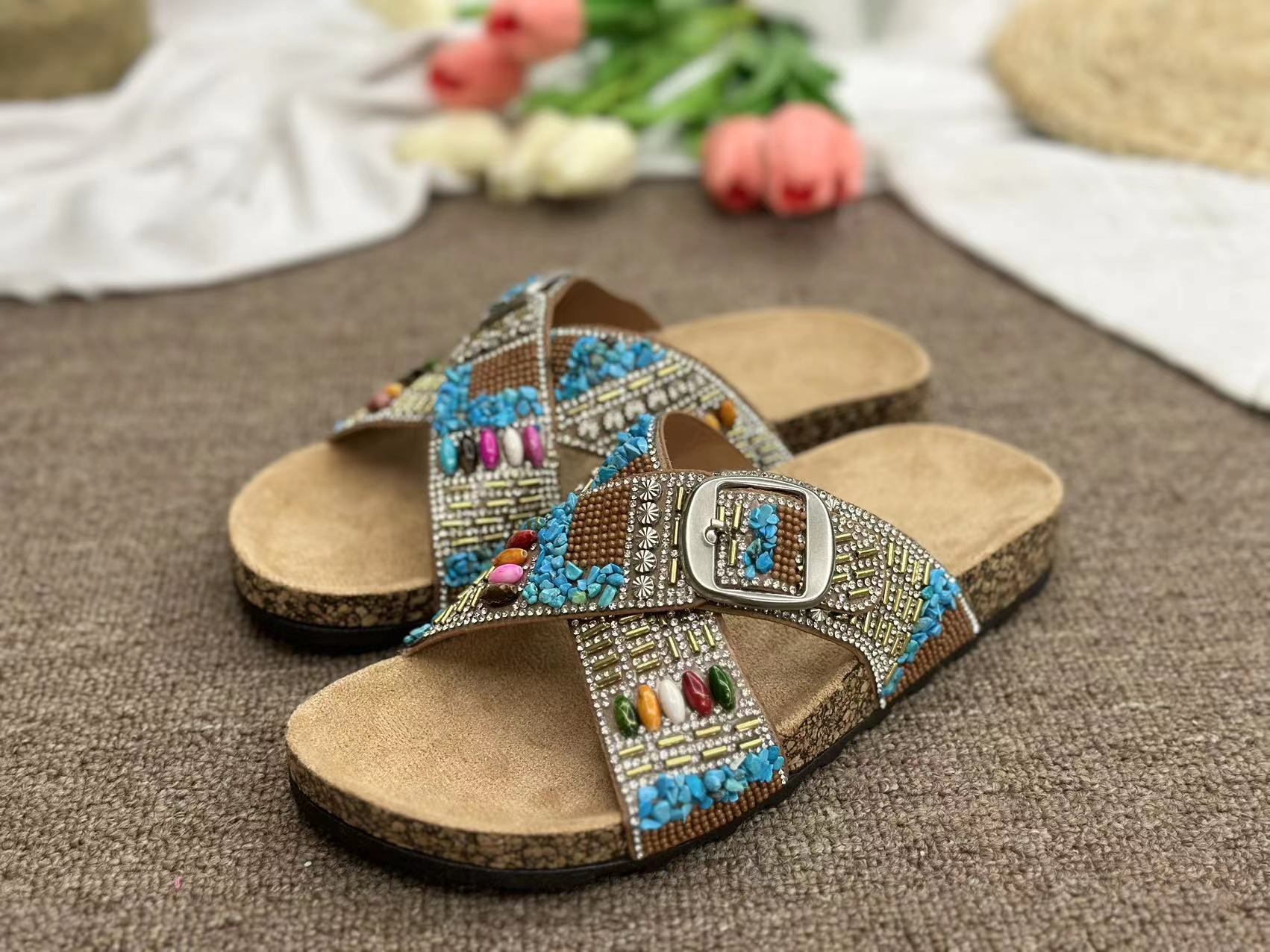 欧美跨境外贸新款钻面交叉一扣沙滩软木拖鞋外穿大码平底拖鞋
