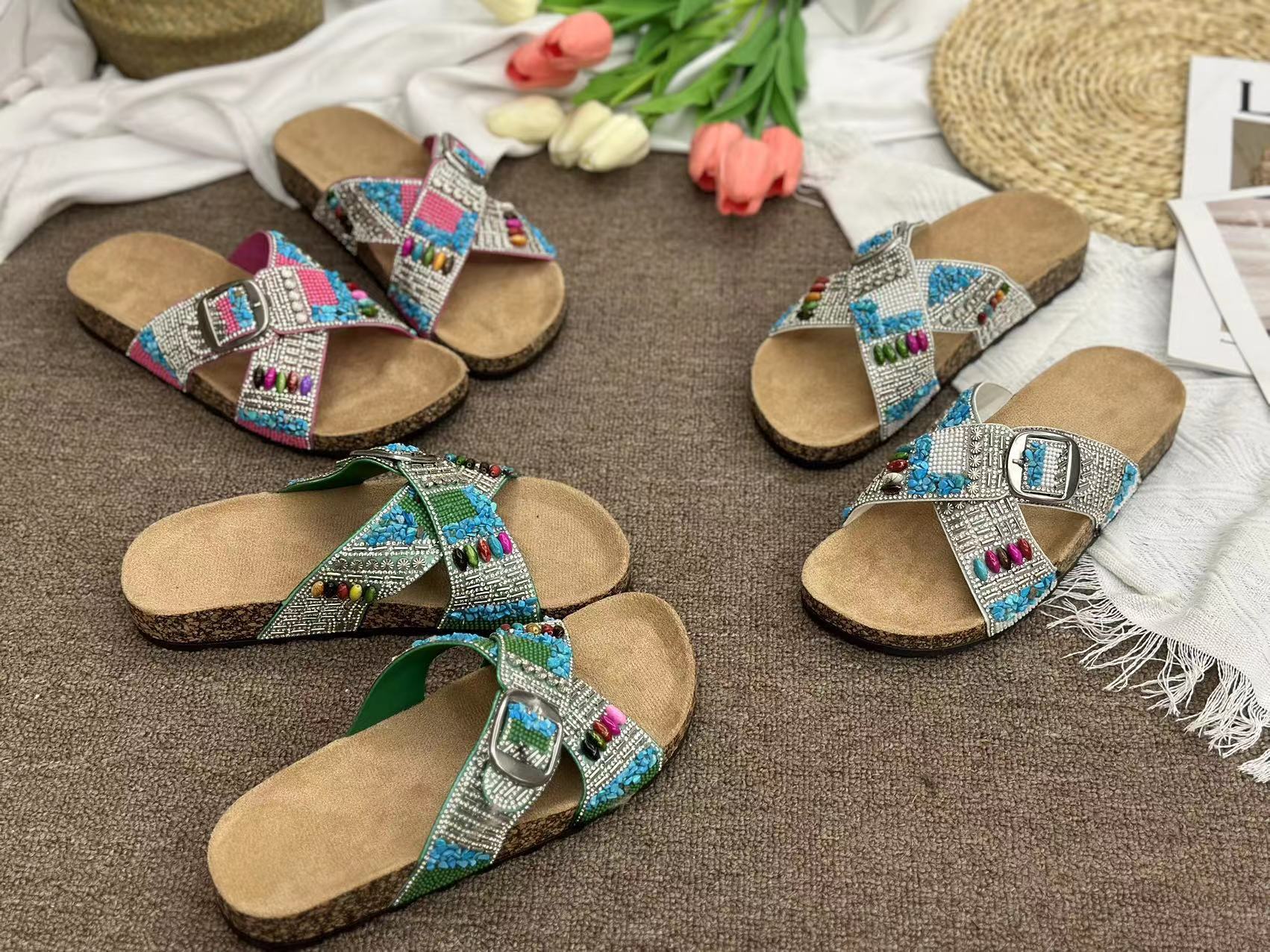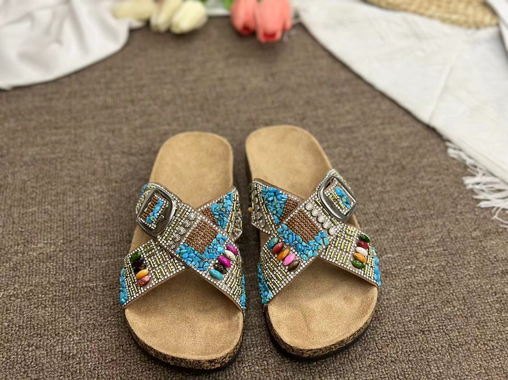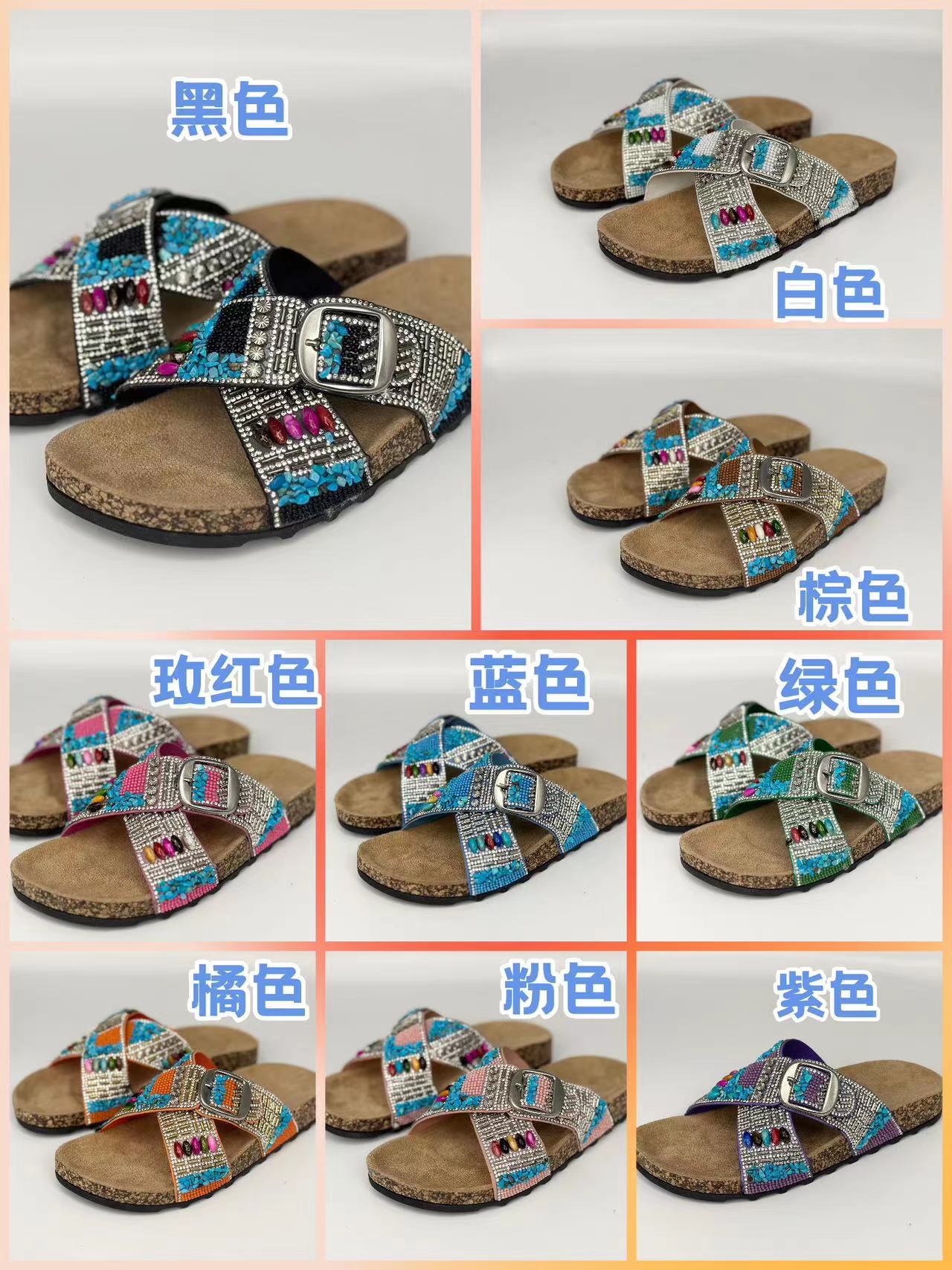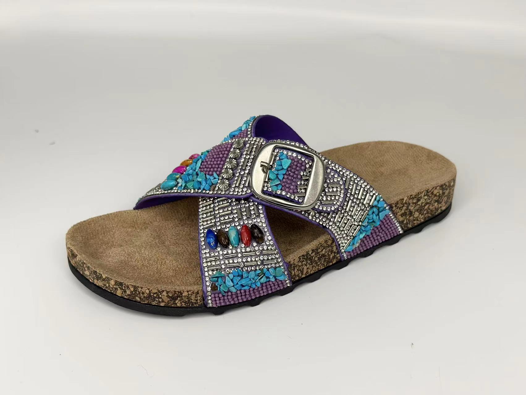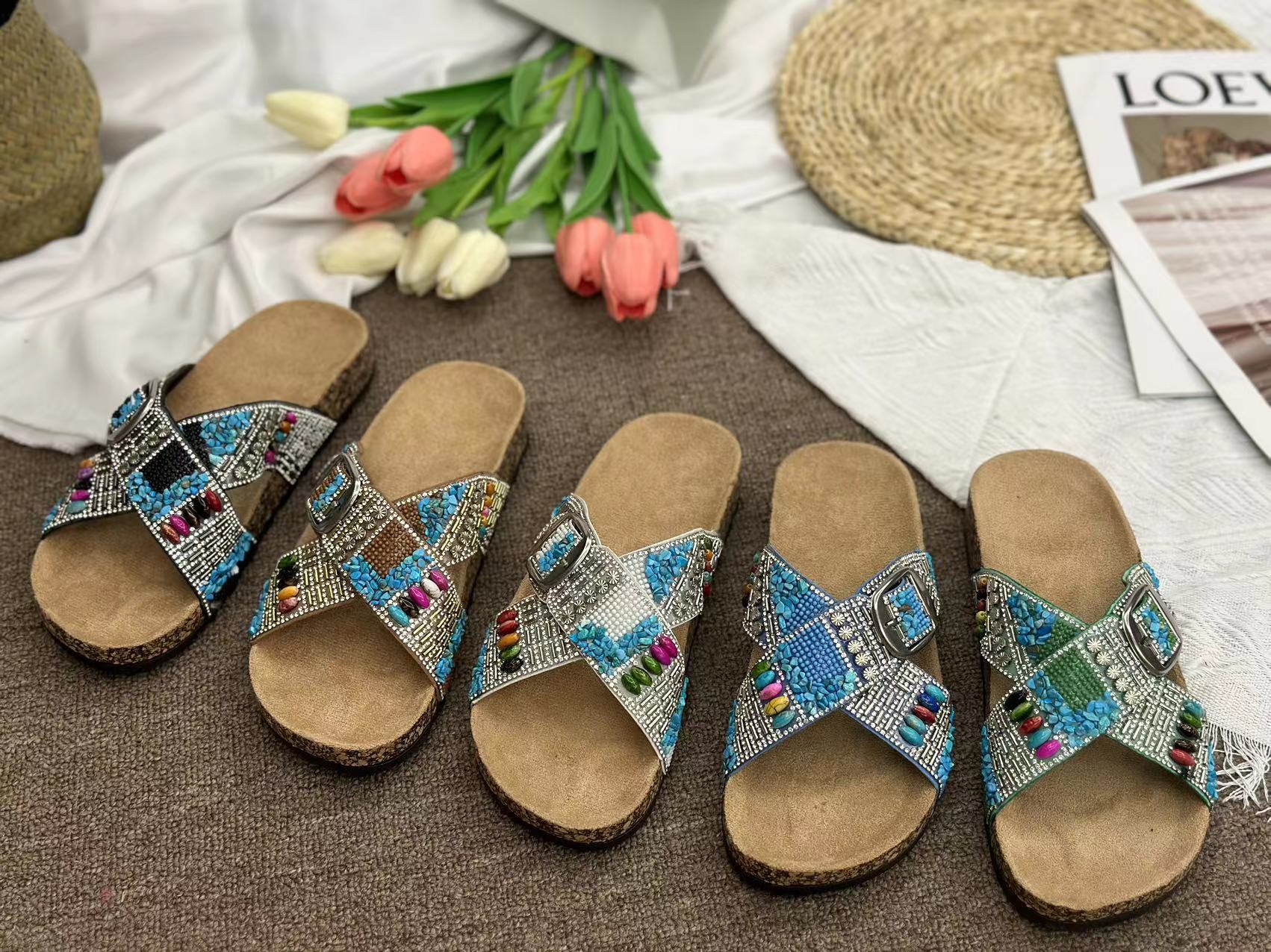 欧美跨境外贸新款钻面交叉一扣沙滩软木拖鞋外穿大码平底拖鞋