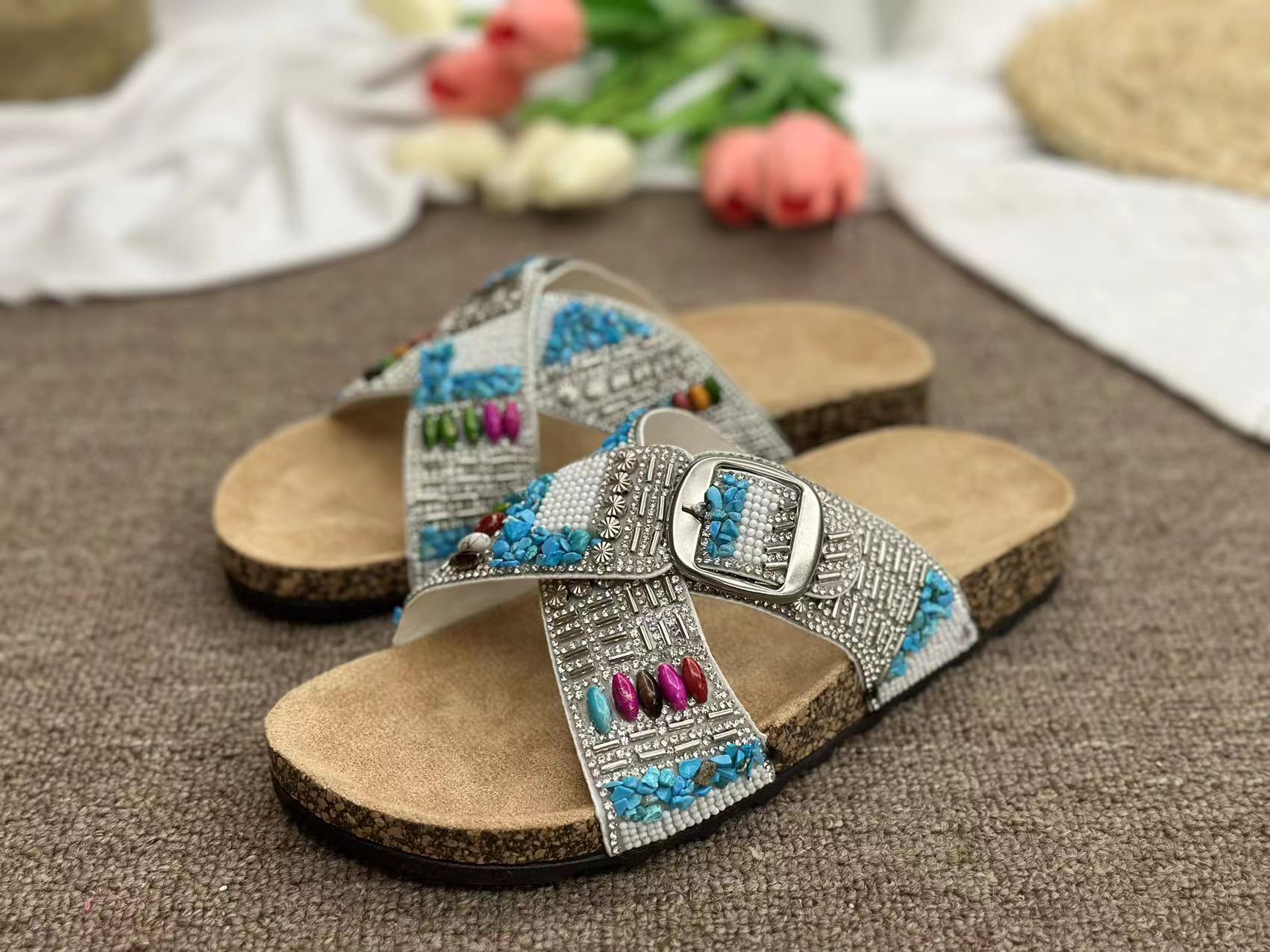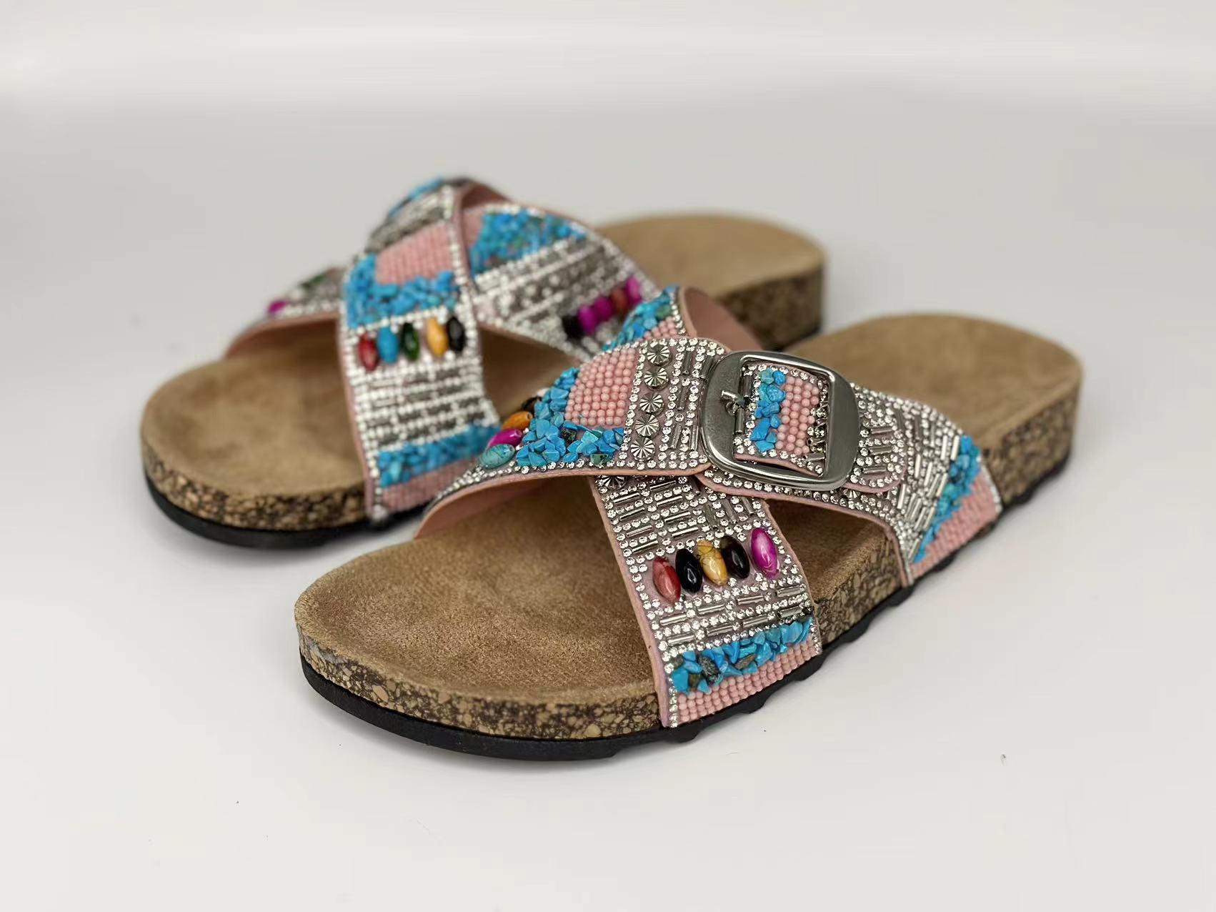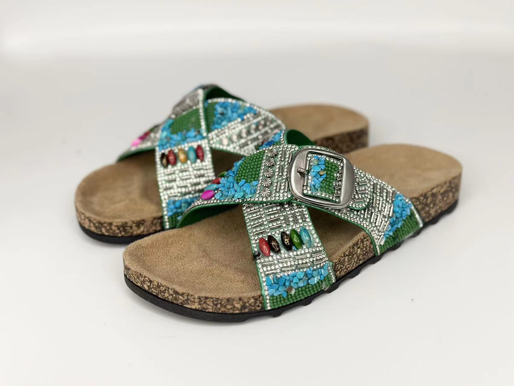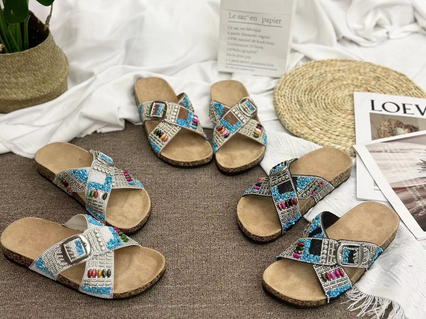 欧美跨境外贸新款钻面交叉一扣沙滩软木拖鞋外穿大码平底拖鞋