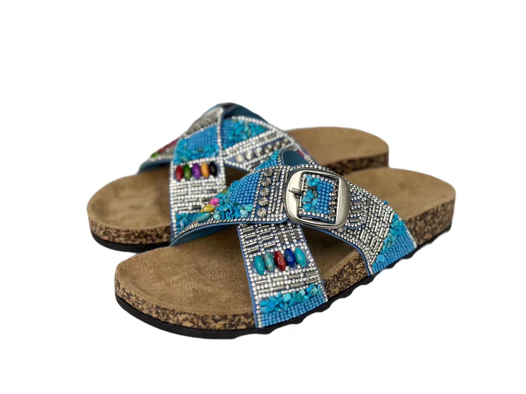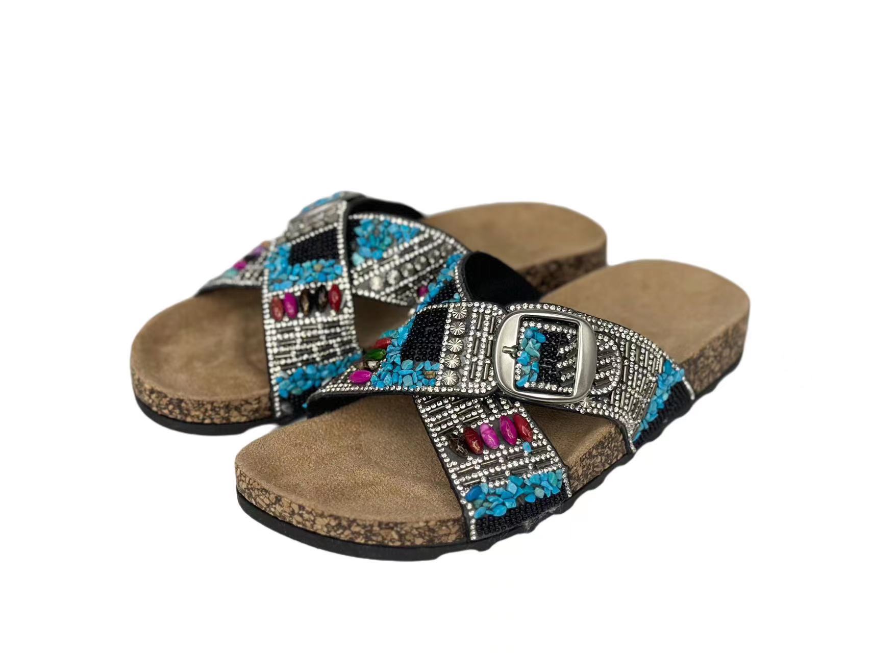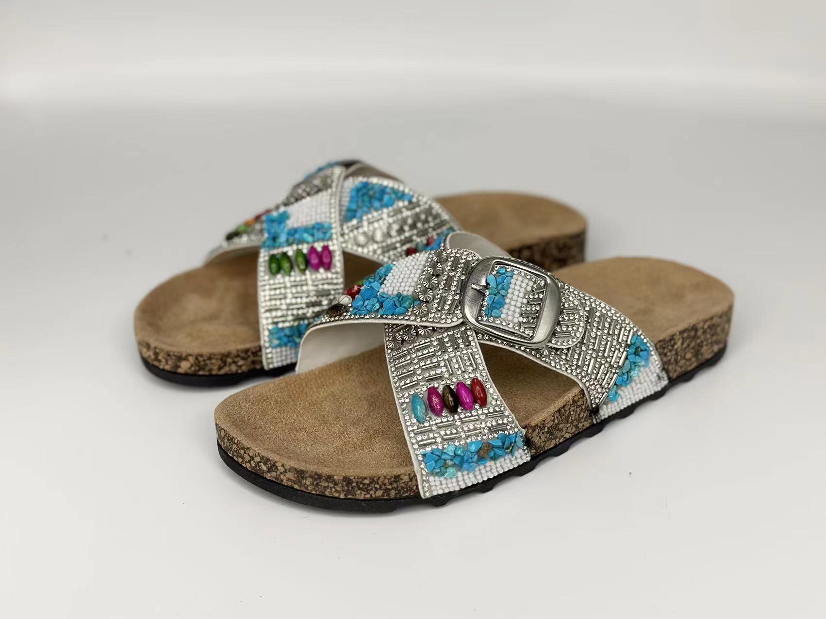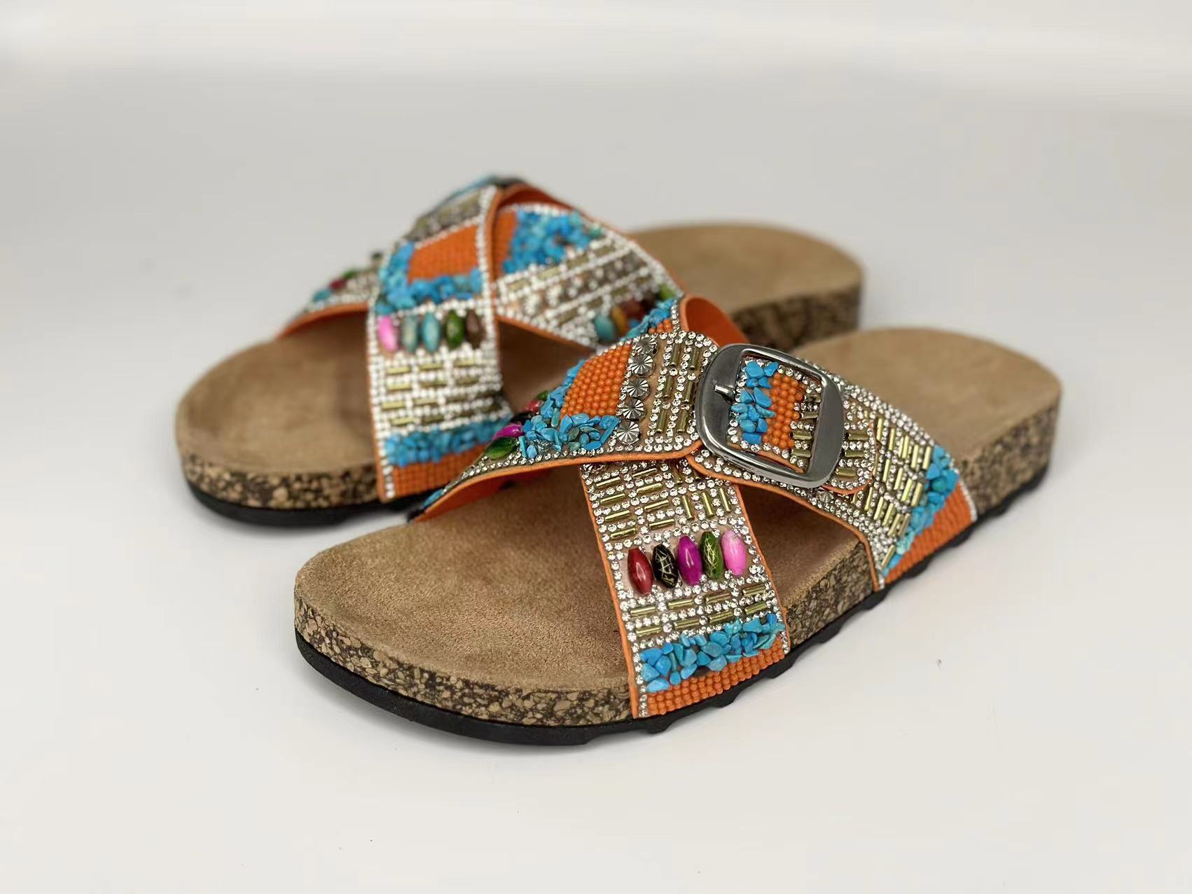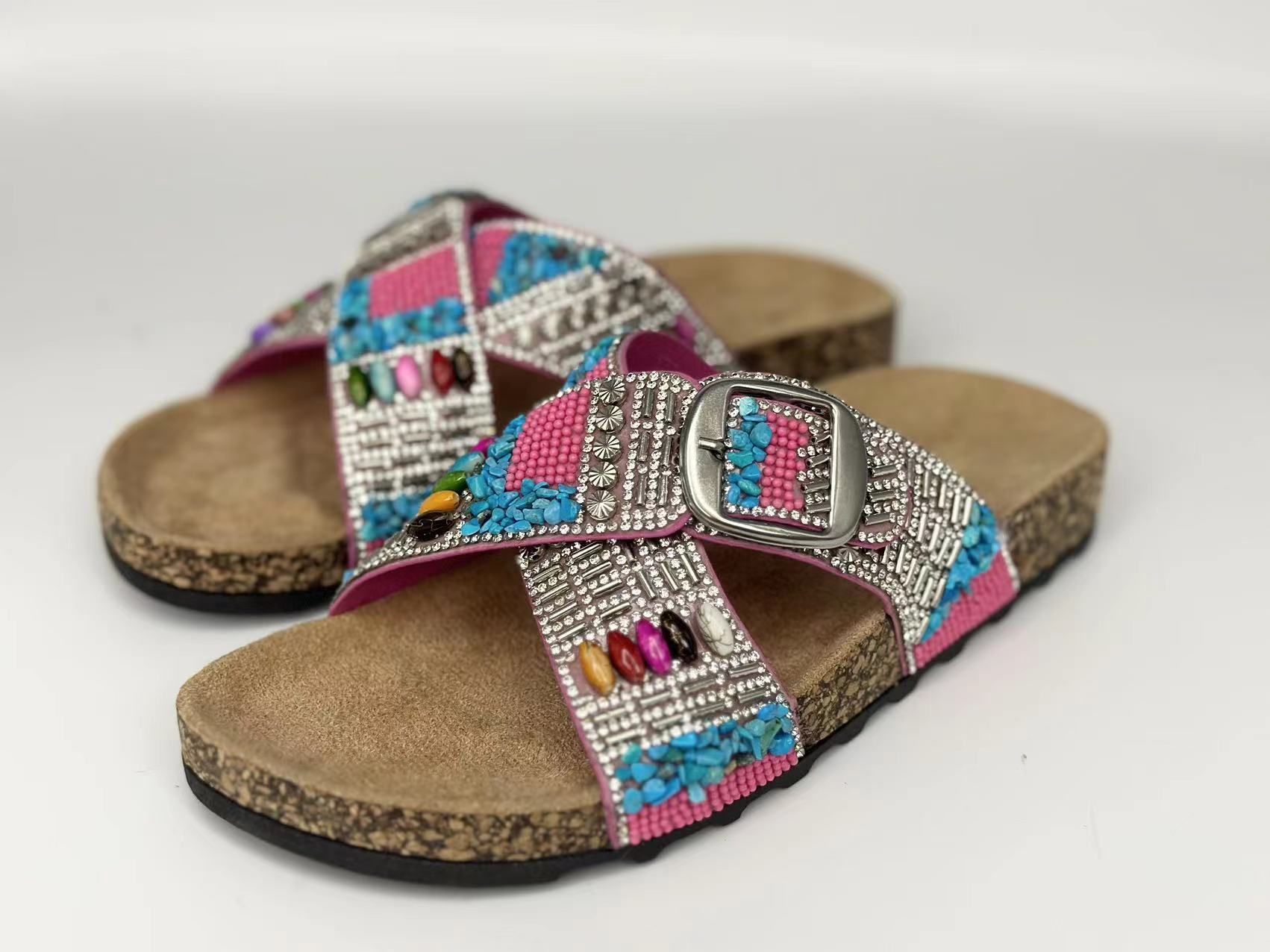 欧美跨境外贸新款钻面交叉一扣沙滩软木拖鞋外穿大码平底拖鞋