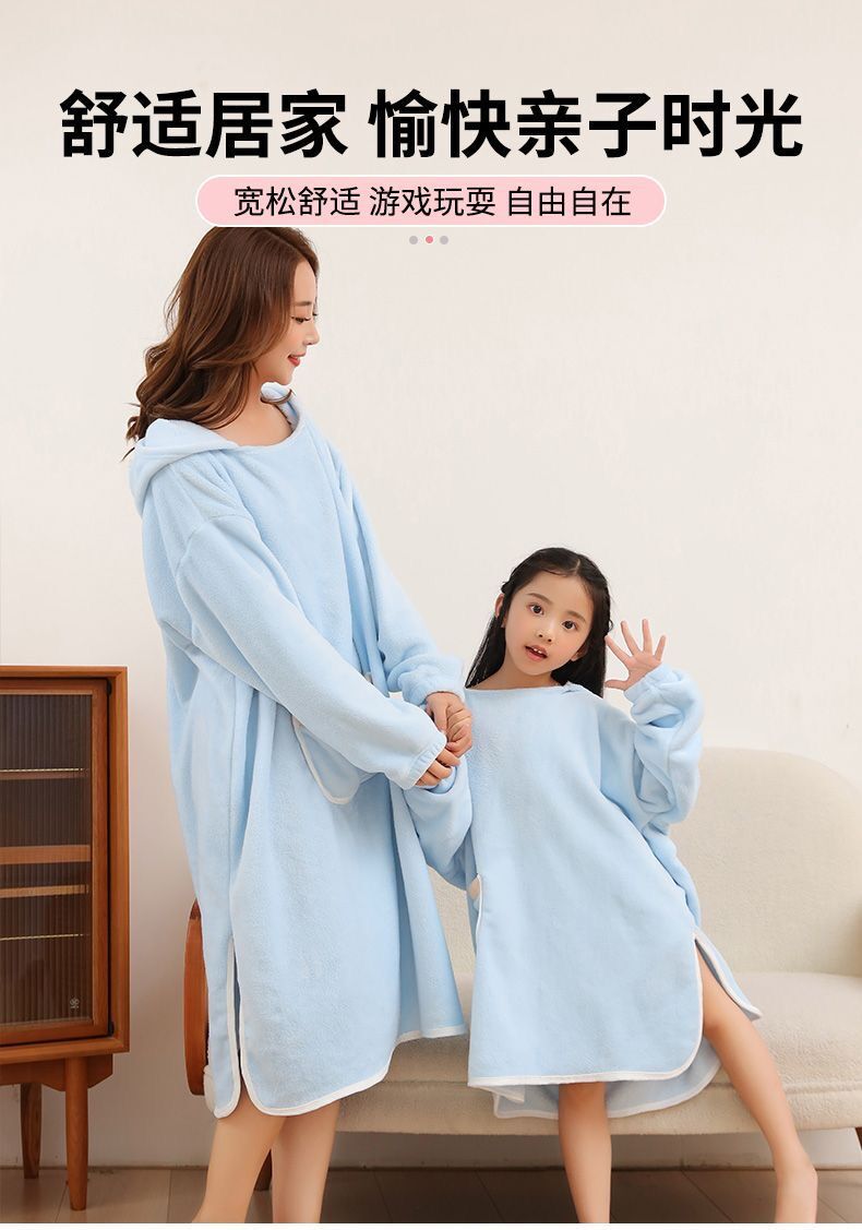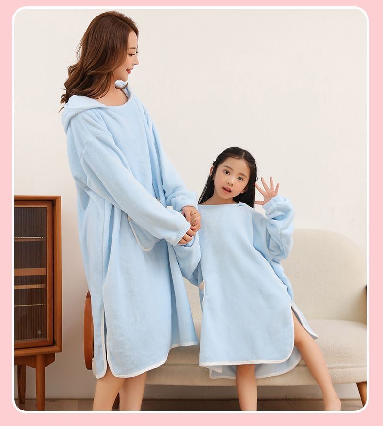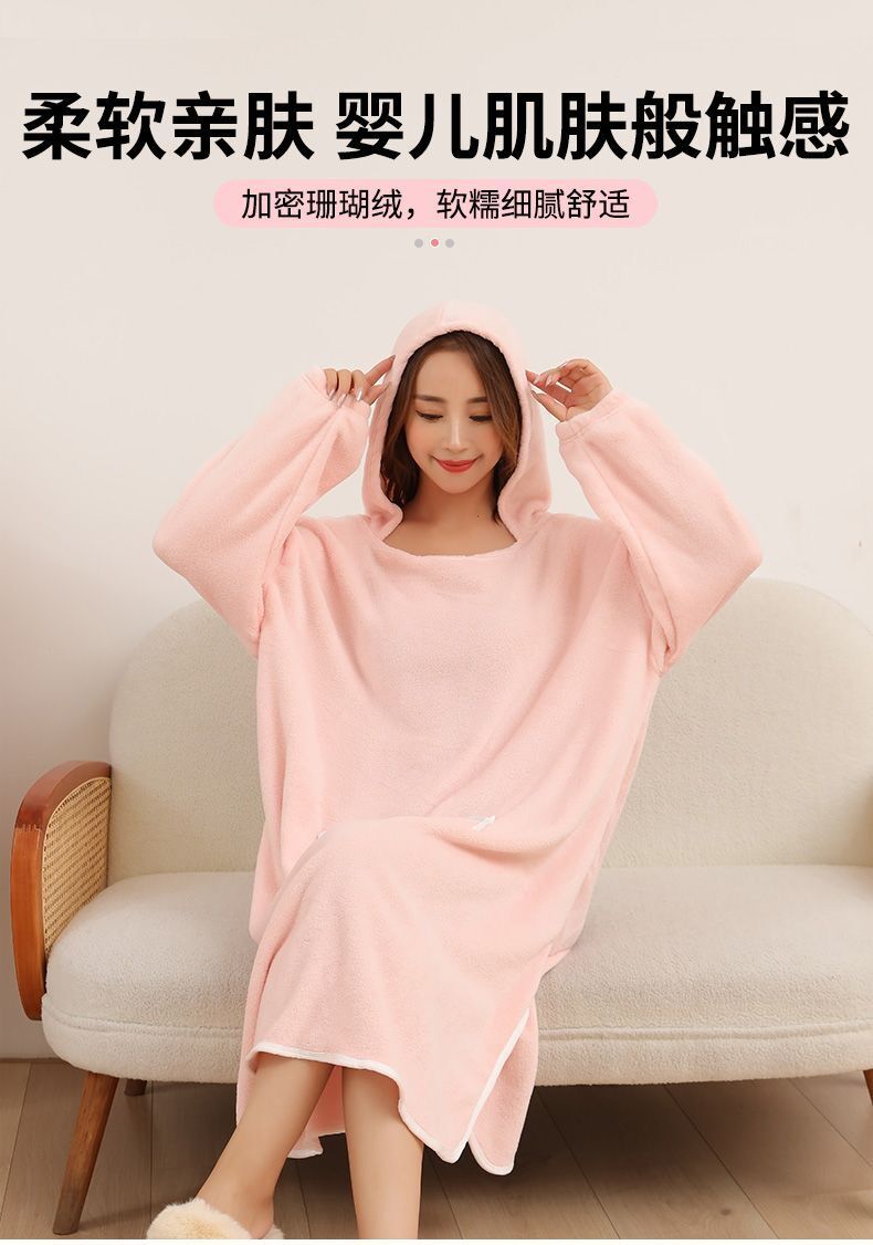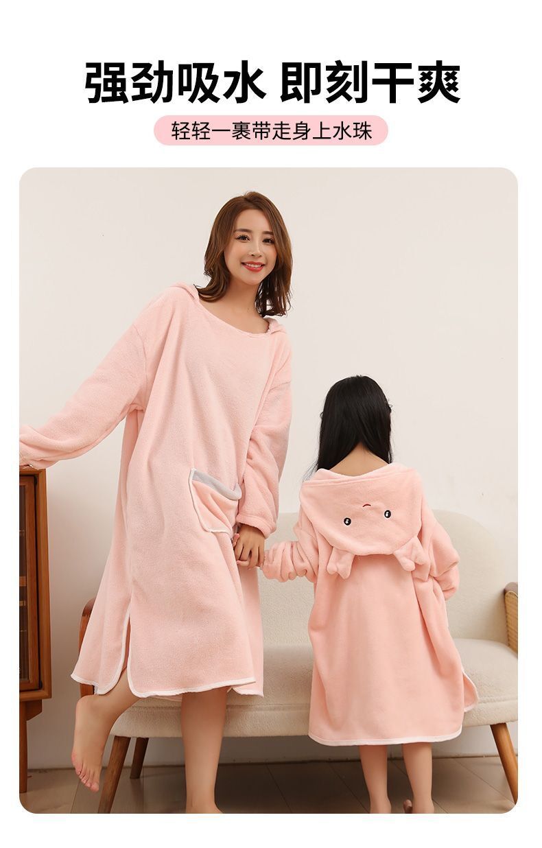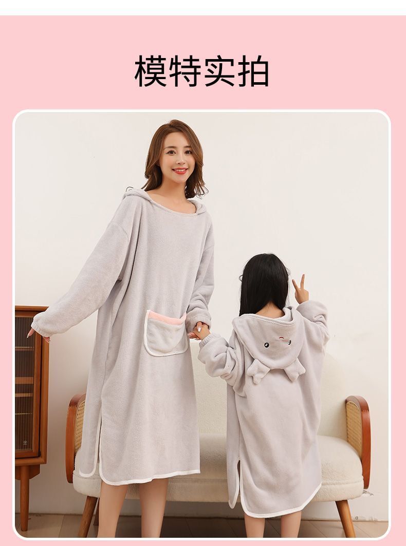 长袖成人浴巾斗篷浴袍带浴帽秋冬珊瑚绒吸水速干亲子连帽可穿式