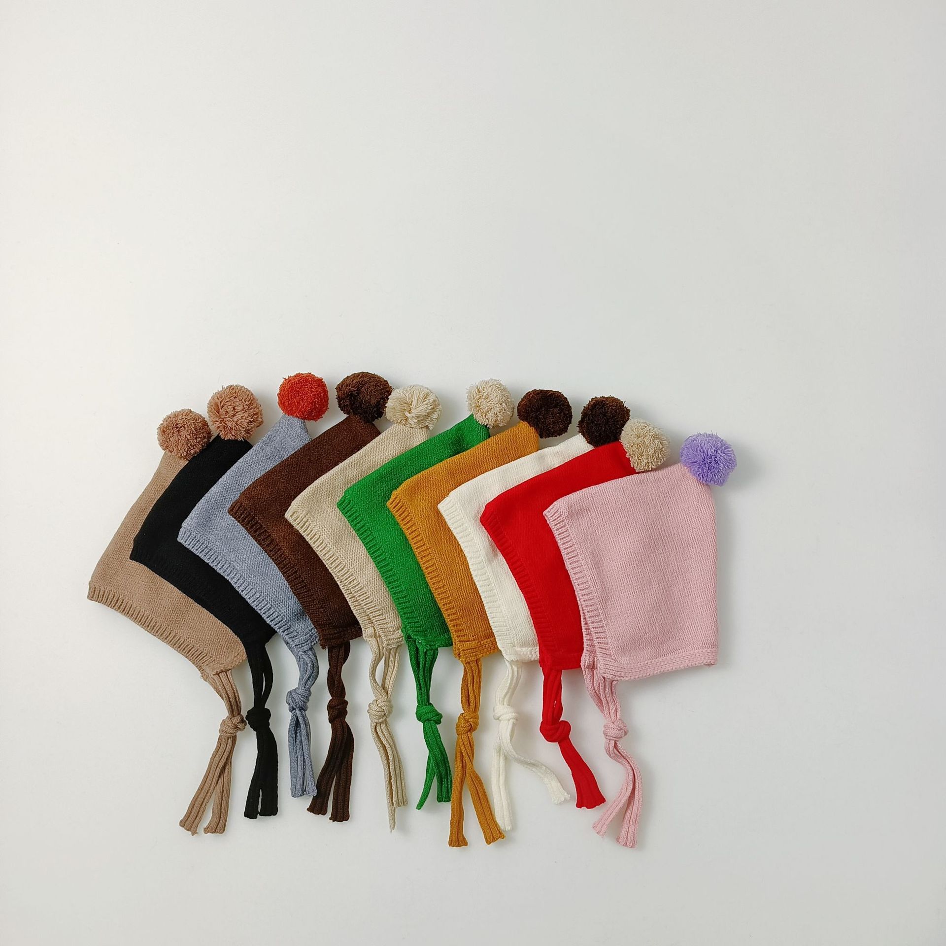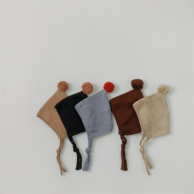 儿童洋气护耳针织帽个性毛球纯色尖尖巫师帽男女童简约复古系带帽