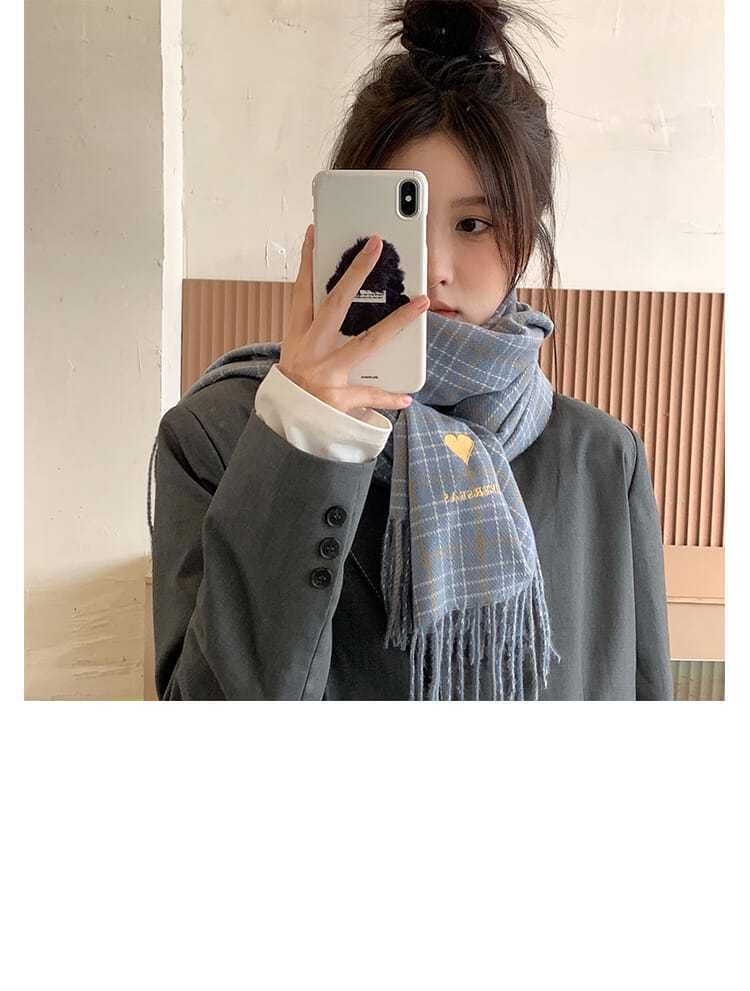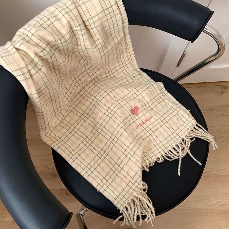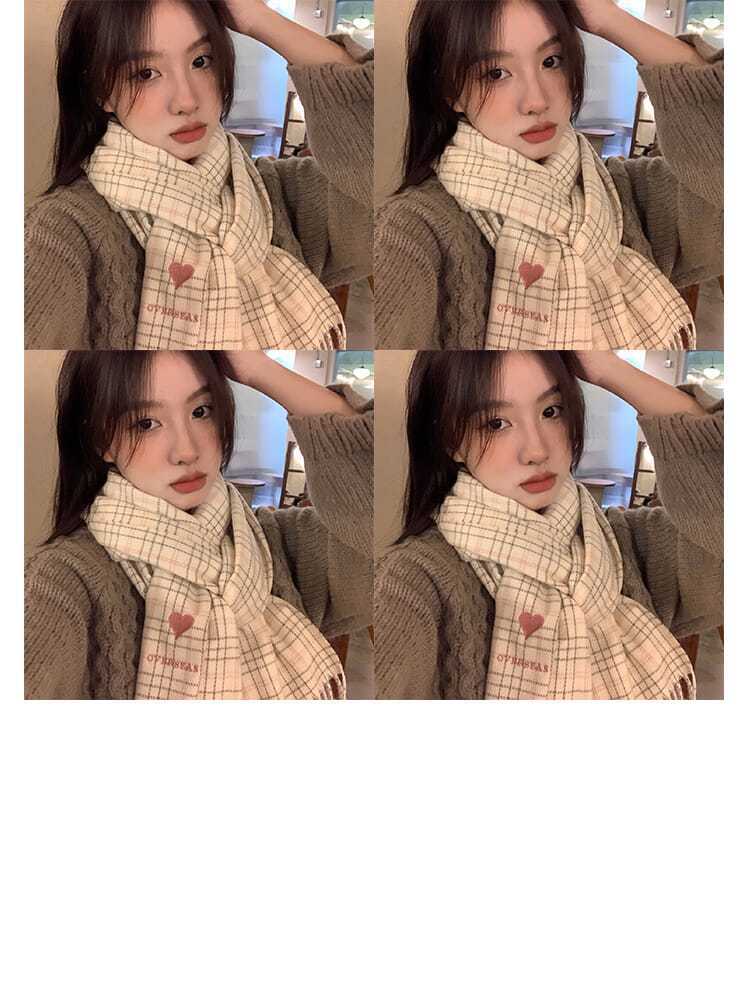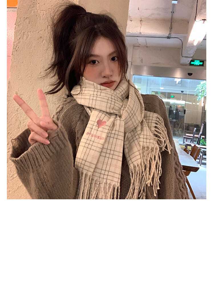 新款甜美格纹百搭保暖刺绣爱心可爱流苏围巾女冬季港风韩系围脖