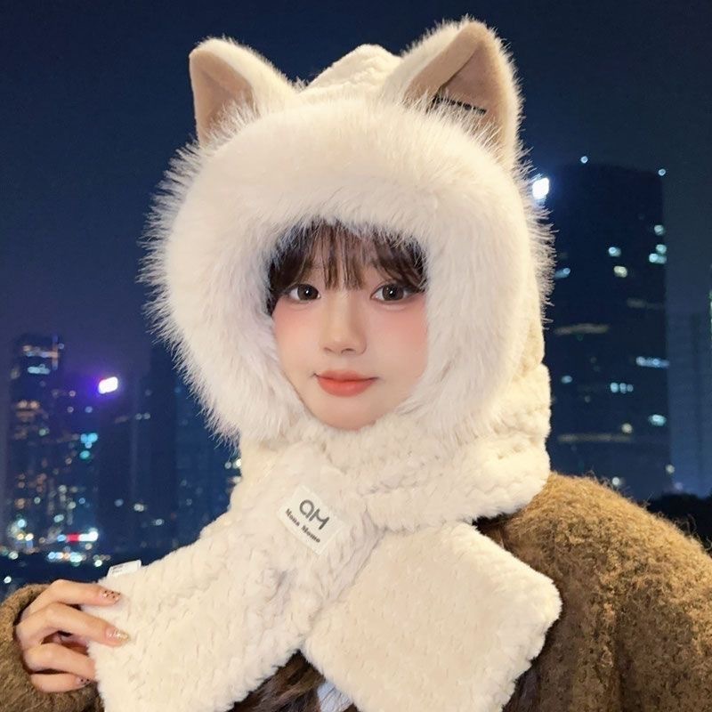 新款可爱毛绒围脖加厚帽子围巾一体狐狸耳朵女生保暖秋冬季防风绒