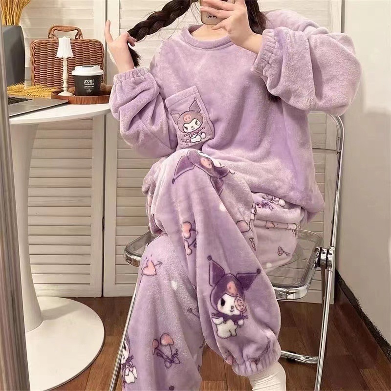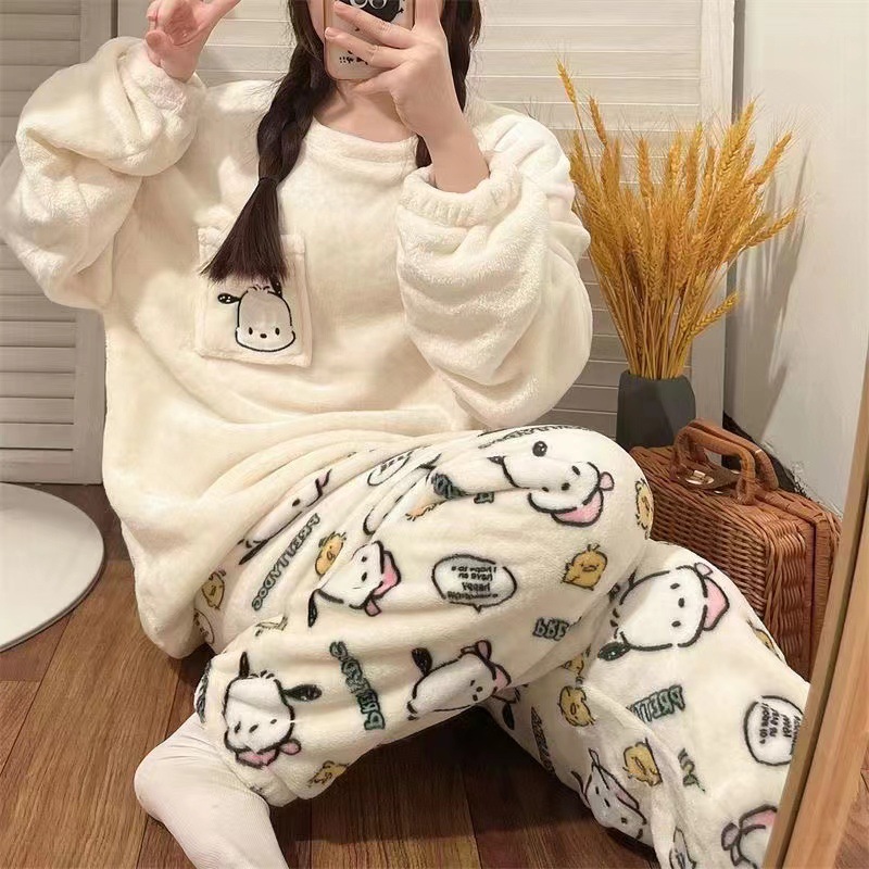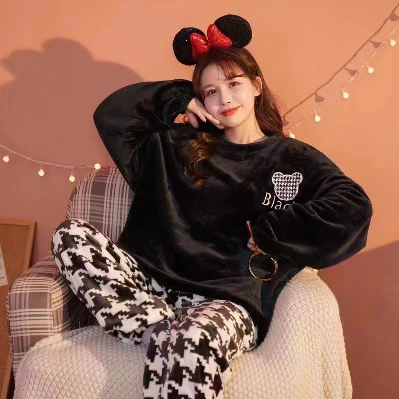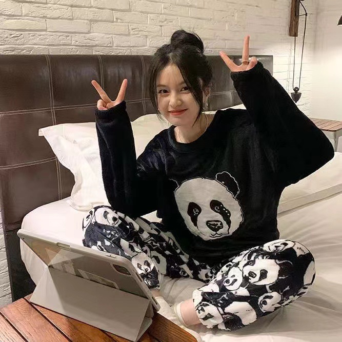 卡通甜美歪头熊同款睡衣女秋冬季珊瑚绒加厚宽松大码外贸跨境套装